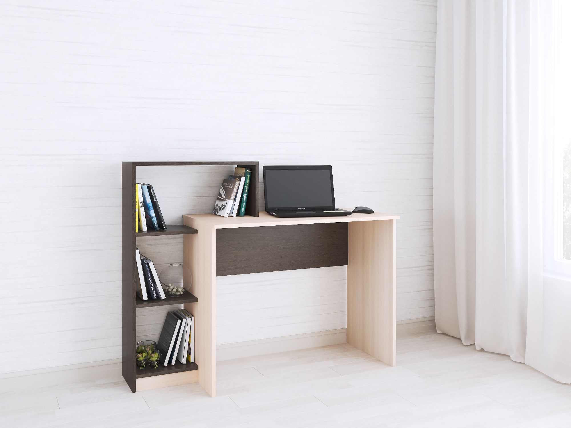 Компьютерный стол Квартет-2 сочетает в себе преимущества просторного письменного стола и вместительного стеллажа, превращаясь тем самым в полноценное рабочее место. На столе хватит места для ноутбука и настолько лампы, а на открытых полках - для книг, канцелярии и различных мелочей, которые необходимо иметь под рукой во время рабочего процесса. Пластиковые подпятники на опорах защитят напольное покрытие от деформации и царапин.