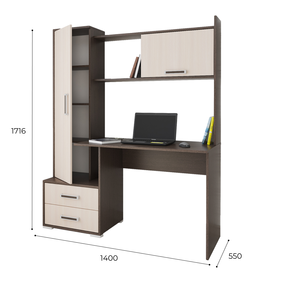 Компьютерный стол Квартет-9 - модуль, продуманный до мелочей и созданный для Вашего максимального комфорта в процессе работы или учебы дома. Прямоугольная столешница с плавными углами, надстройка с открытой и закрытой полками, закрытый шкаф-пенал и тумба с двумя выкатными ящиками - все, чтобы обеспечить удобное и грамотное хранение на рабочем месте. Приятный декор с имитацией текстуры натурального дерева придется по душе любителям эко-стиля в интерьере.
