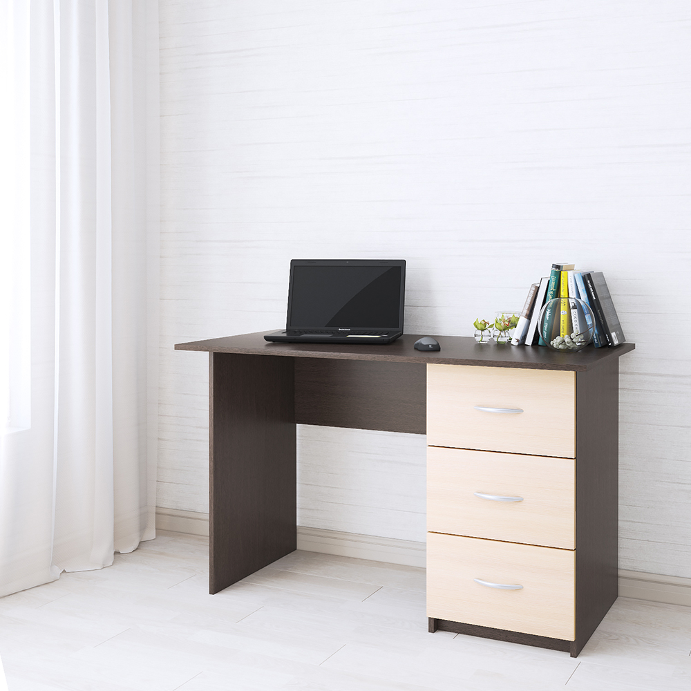 Письменный стол из серии Сити-1 - универсальный вариант обустройства домашней рабочей зоны. Прекрасно подойдет как для школьника, так и для взрослого человека. Модель привлекает контрастным декором венге/дуб молочный, который будет актуально смотреться в любом по стилю интерьере. Необходимые для учебы или работы вещи Вы сможете расположить в трех вместительных ящиках, которые оснащены роликовыми направляющими. Ручки пластиковые цвета "металлик". Ширина столешницы в 120 см делает модель комфортной для ежедневной эксплуатации.