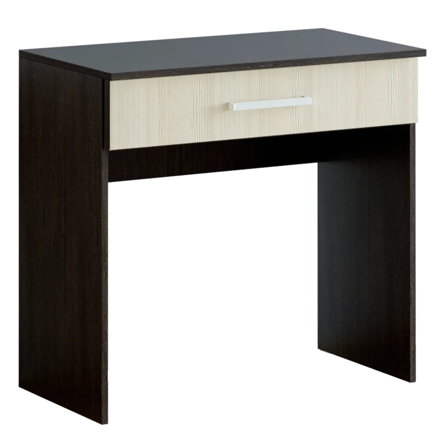 Стол оснащён выдвижным ящиком, который служит удобным местом для хранения косметики, аксессуаров и средств по уходу. Благодаря светлым фасадам и текстуре обработанной древесины дуба в сочетании с контрастными элементами цвета венге, этот стол гармонично впишется в любой интерьер.