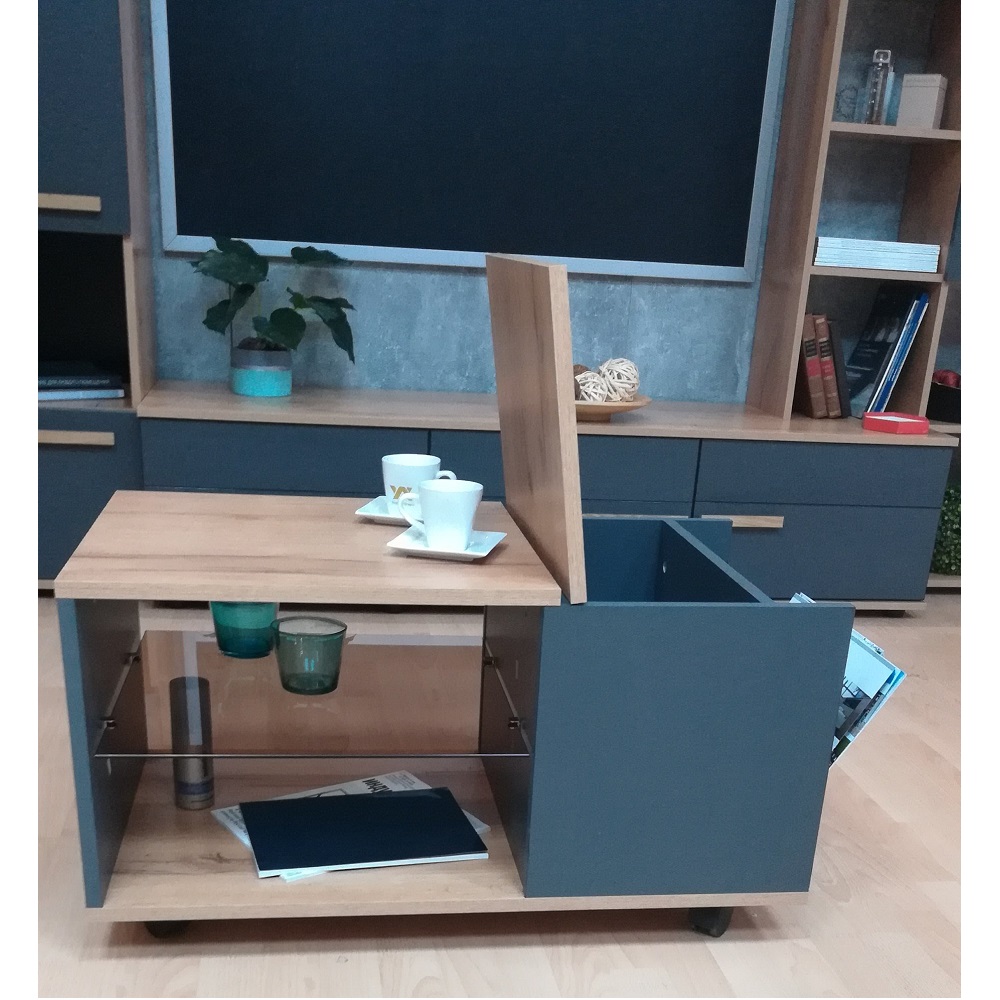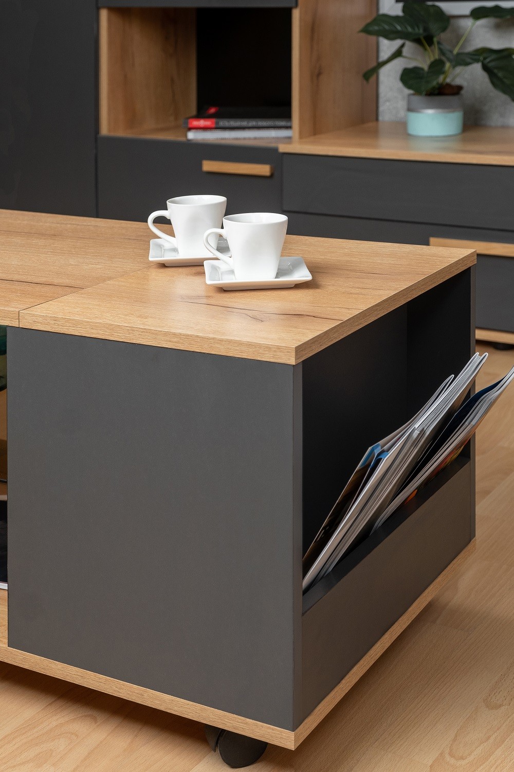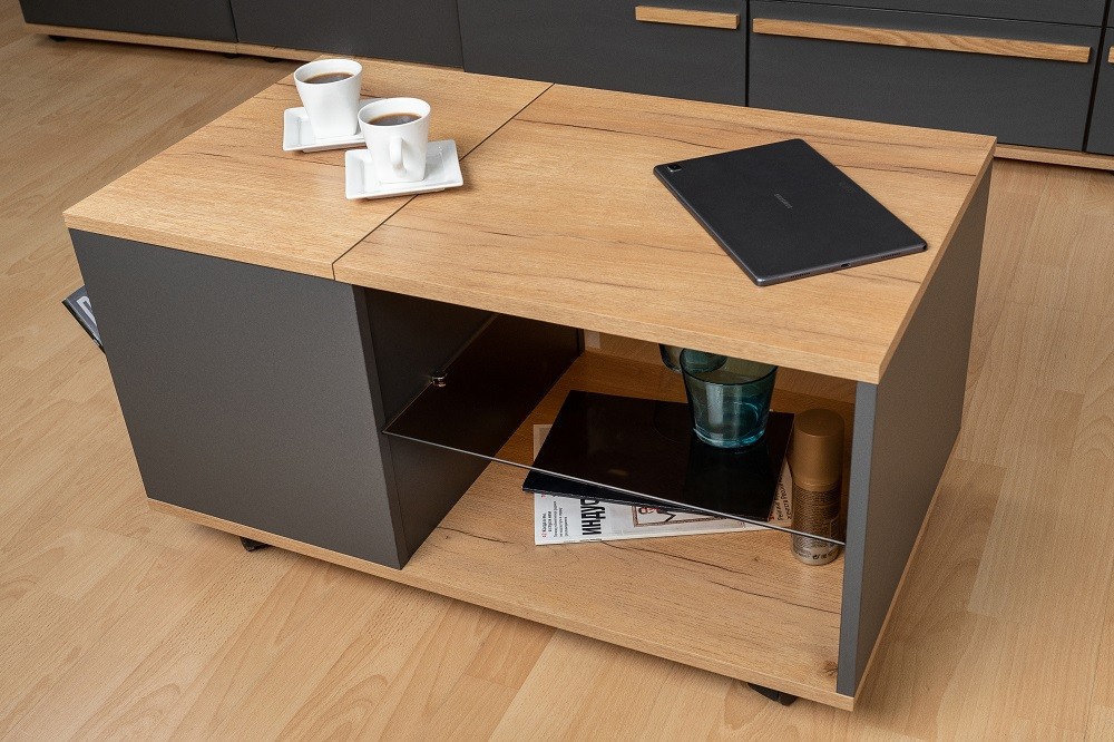 Журнальный столик Crown на колесиках отличается необычной формой и станет прекрасным дополнением к мебели в Вашей гостиной. Колесная опора позволит менять положение столика в комнате. Открытые ниши пригодятся для хранения книг, журналов, пульта и других вещей.Боковая ниша с карманом пригодится для хранения не только газет и журналов, но и вместит планшет, ноутбук и другую тонкую технику. Журнальный стол также имеет откидную сервировочную столешницу, которая станет Вашем помощником при сборе членов семьи вместе или приеме гостей. Полка из тонированного стекла дополняет и украшает данный модуль.
