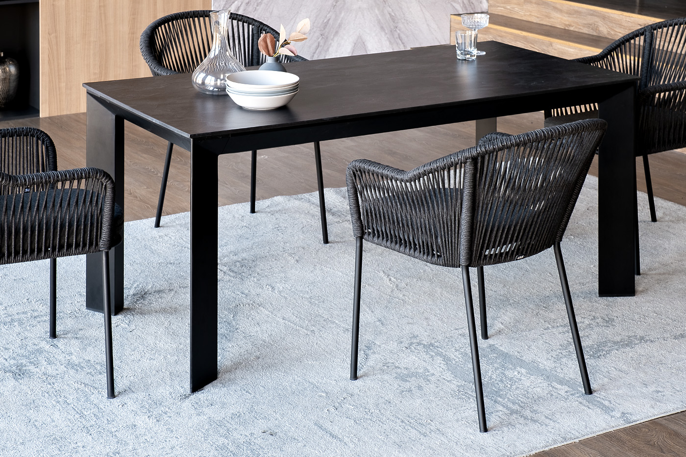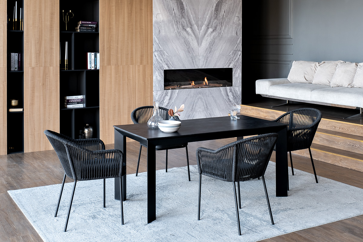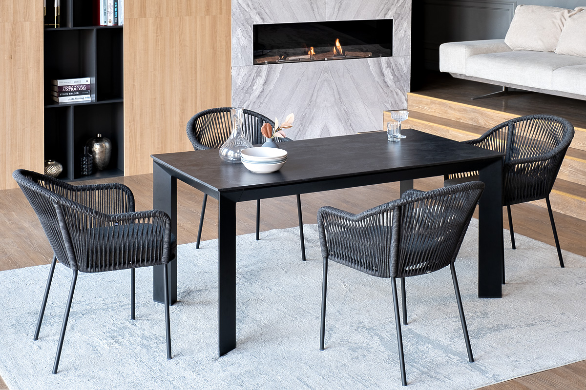 - 4 плетеных стульев «Лион» из роупа, размером - 570×620×820 мм, цвет роупа - темно-серый, каркас стальной, окрашен порошковой краской в темно-серый (RAL7024) оттенок. "Венето" обеденный стол из HPL 160х80см, цвет "серый гранит", каркас черный 1шт. 1 600Х800Х750, "Лион" стул плетеный из роупа, каркас из стали темно-серый (RAL7024) муар, роуп темно-серый круглый, ткань темно-серая 027 4шт. 570Х620Х820,