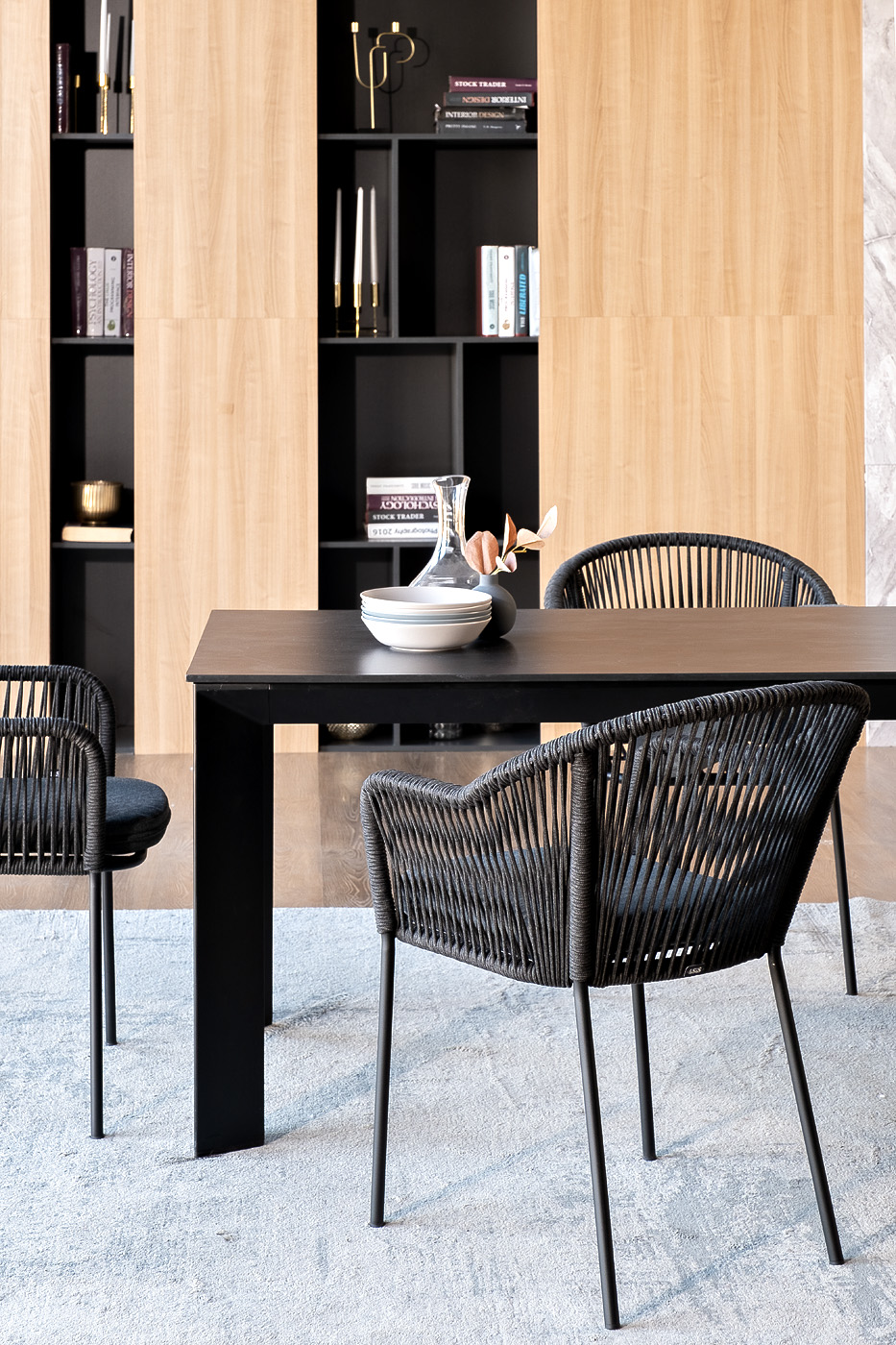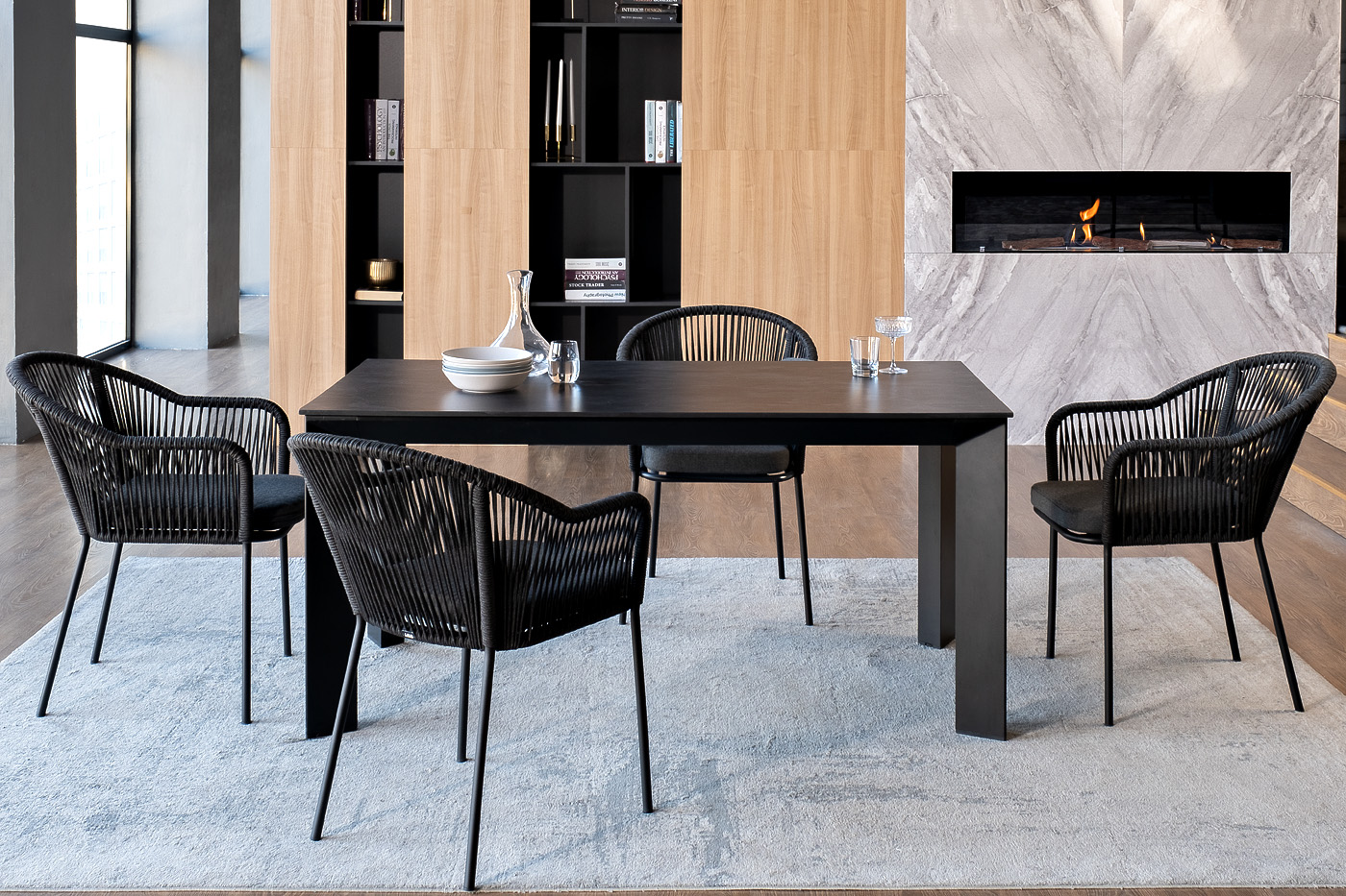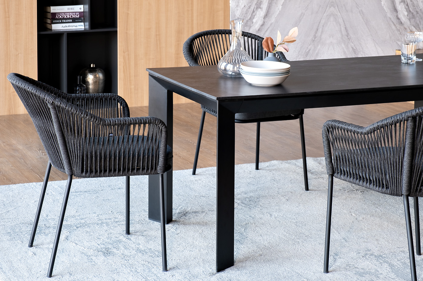 - 4 плетеных стульев «Лион» из роупа, размером - 570×620×820 мм, цвет роупа - темно-серый, каркас стальной, окрашен порошковой краской в темно-серый (RAL7024) оттенок. "Венето" обеденный стол из HPL 160х80см, цвет "серый гранит", каркас черный 1шт. 1 600Х800Х750, "Лион" стул плетеный из роупа, каркас из стали темно-серый (RAL7024) муар, роуп темно-серый круглый, ткань темно-серая 027 4шт. 570Х620Х820,