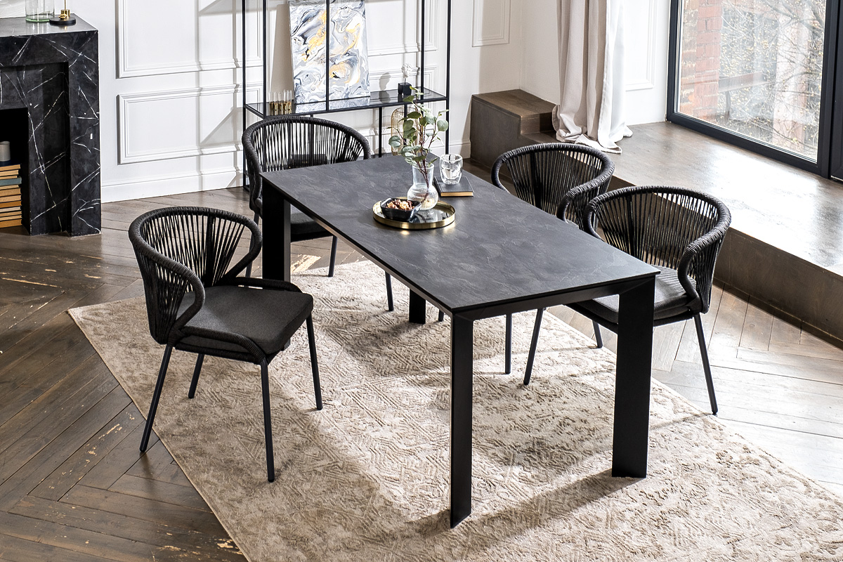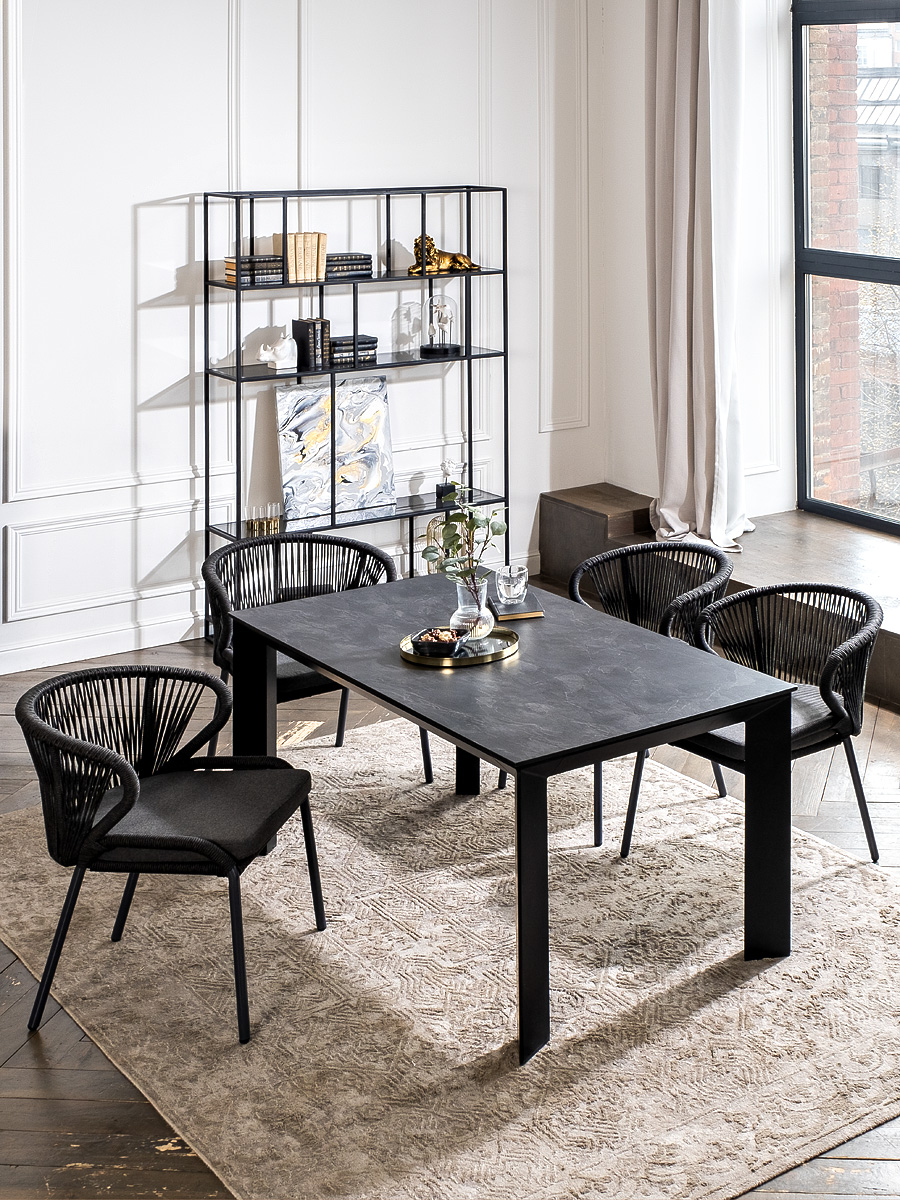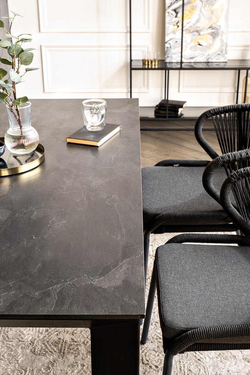 Стол «Венето» оснащен столешницей из надежного HPL-пластика, который обладает высокими показателями стойкости к истиранию, ударам, высоким температурам и влаге, обеспечивая долговечность использовани "Венето" обеденный стол из HPL 160х80см, цвет "серый гранит", каркас черный 1шт. 1 600Х800Х750, "Милан" стул плетеный из роупа, каркас алюминий темно-серый (RAL7024) муар, роуп темно-серый круглый, ткань темно-серая 027 4шт. 600Х660Х795,
