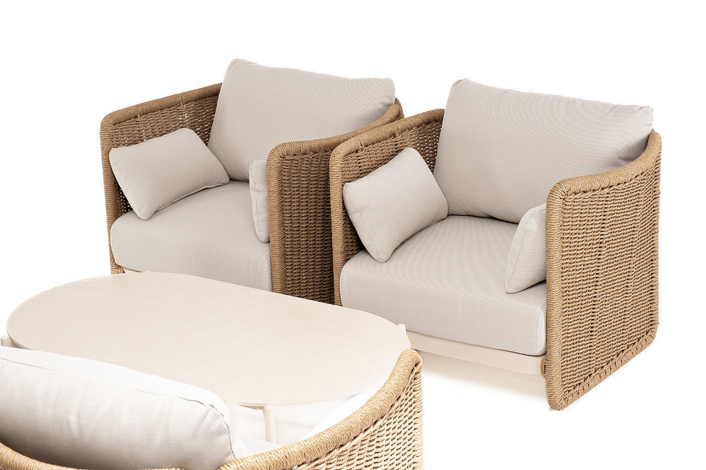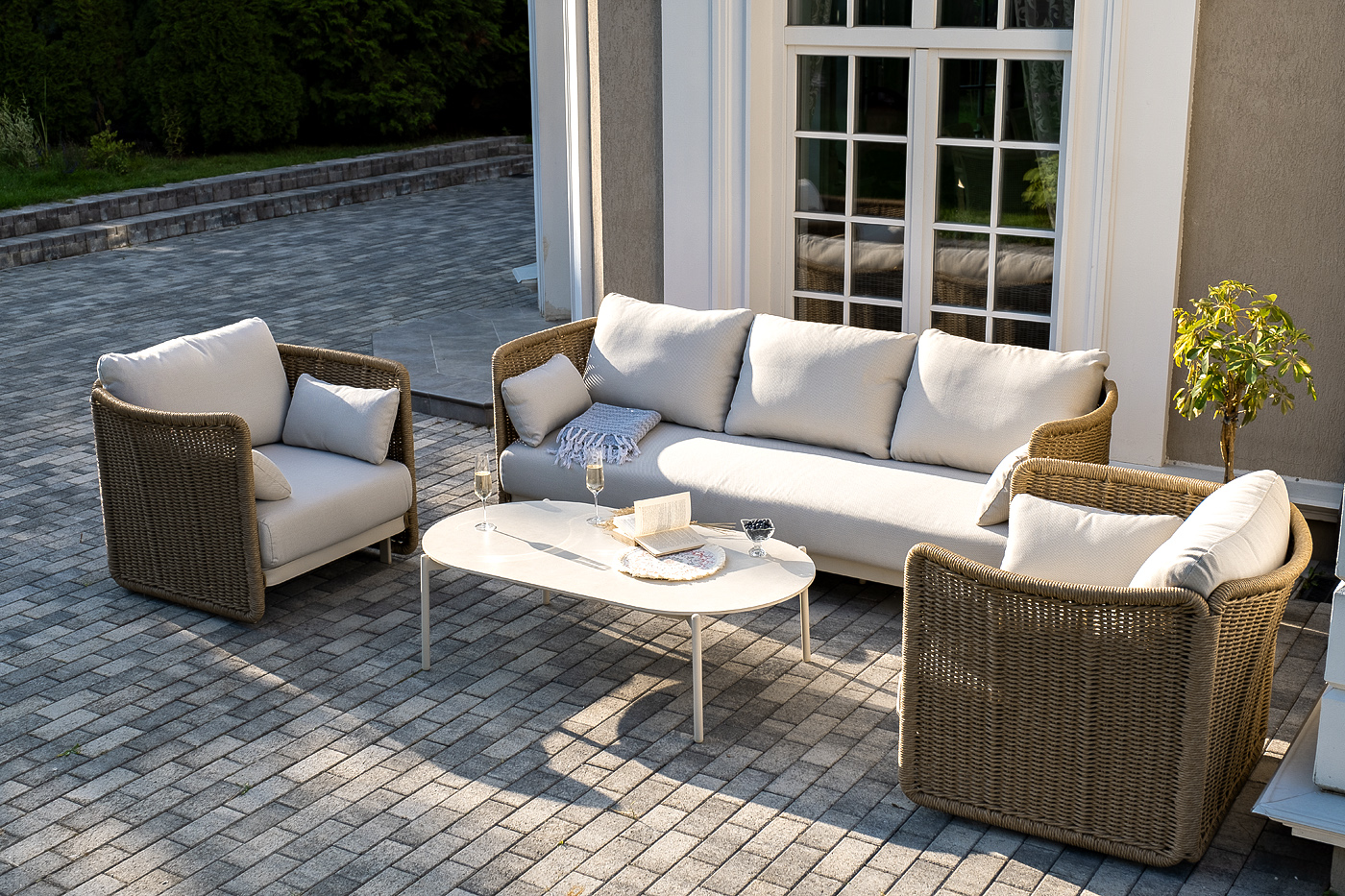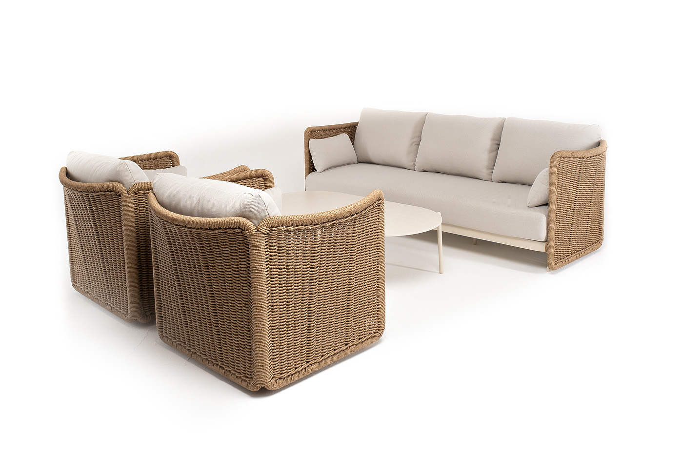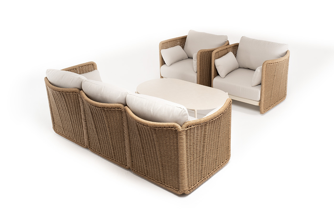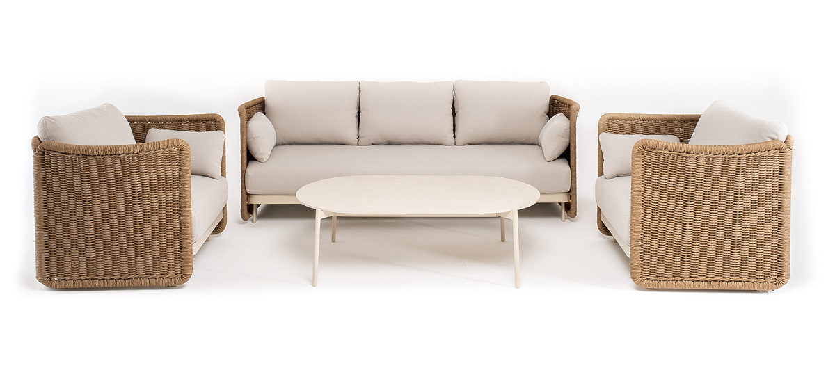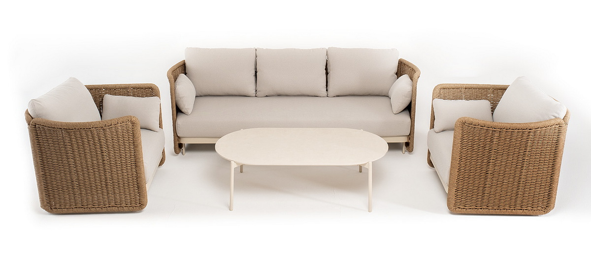 Журнальный столик выполнен из алюминия, окрашенного износостойкой краской, а его оплетка выпо "Аликанте" диван из искусственного ротанга трехместный, цвет соломенный 1шт. 2 300Х865Х730, "Аликанте" кресло из искусственного ротанга, цвет соломенный 2шт. 960Х865Х730, "Аликанте" журнальный стол из искусственного камня овальный, 130х70см, Н38, цвет белый 1шт. 1 300Х700Х380,