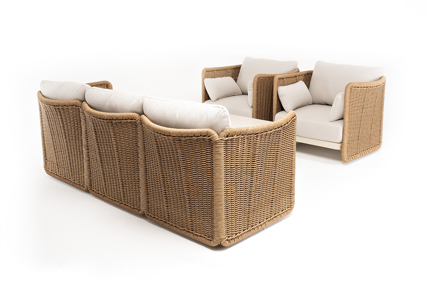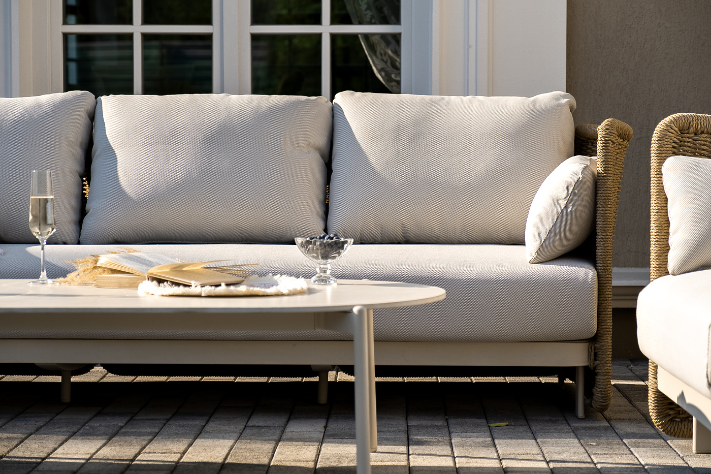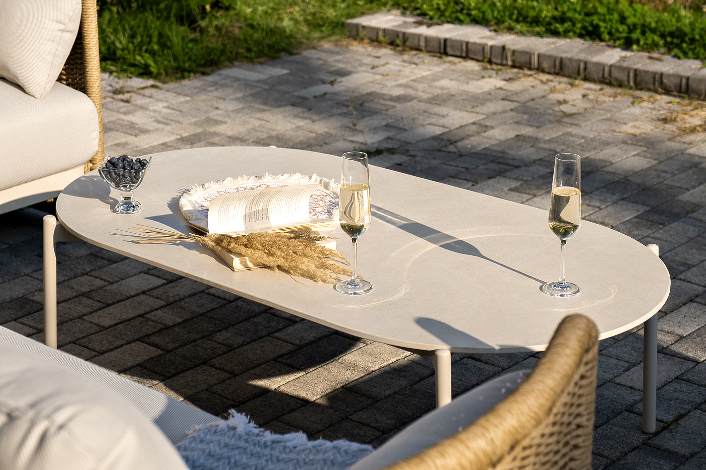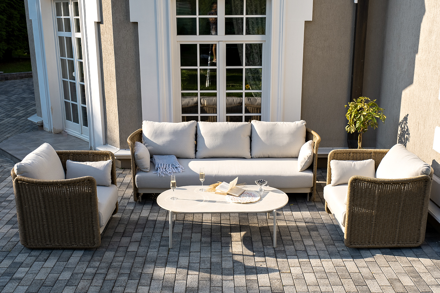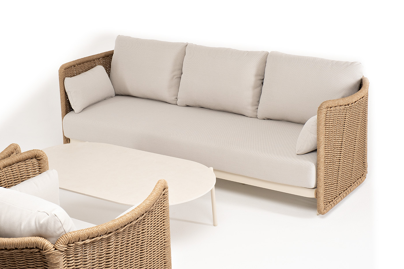 Журнальный столик выполнен из алюминия, окрашенного износостойкой краской, а его оплетка выпо "Аликанте" диван из искусственного ротанга трехместный, цвет соломенный 1шт. 2 300Х865Х730, "Аликанте" кресло из искусственного ротанга, цвет соломенный 2шт. 960Х865Х730, "Аликанте" журнальный стол из искусственного камня овальный, 130х70см, Н38, цвет белый 1шт. 1 300Х700Х380,