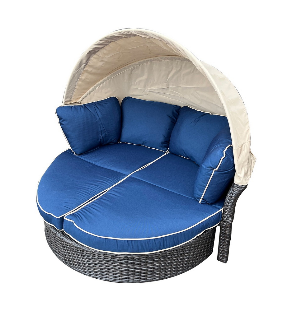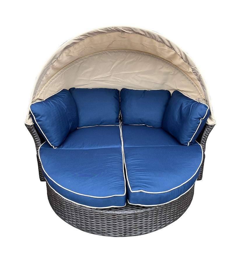 Конструкция отличается надёжностью: в основе — прочный стальной каркас, вручную оплетённый плоским искусственным ротангом. Для комфорта предусмотрена защитная функция — козырёк из 100% полиэстера, который ограничивает попадание прямых солнечных лучей.