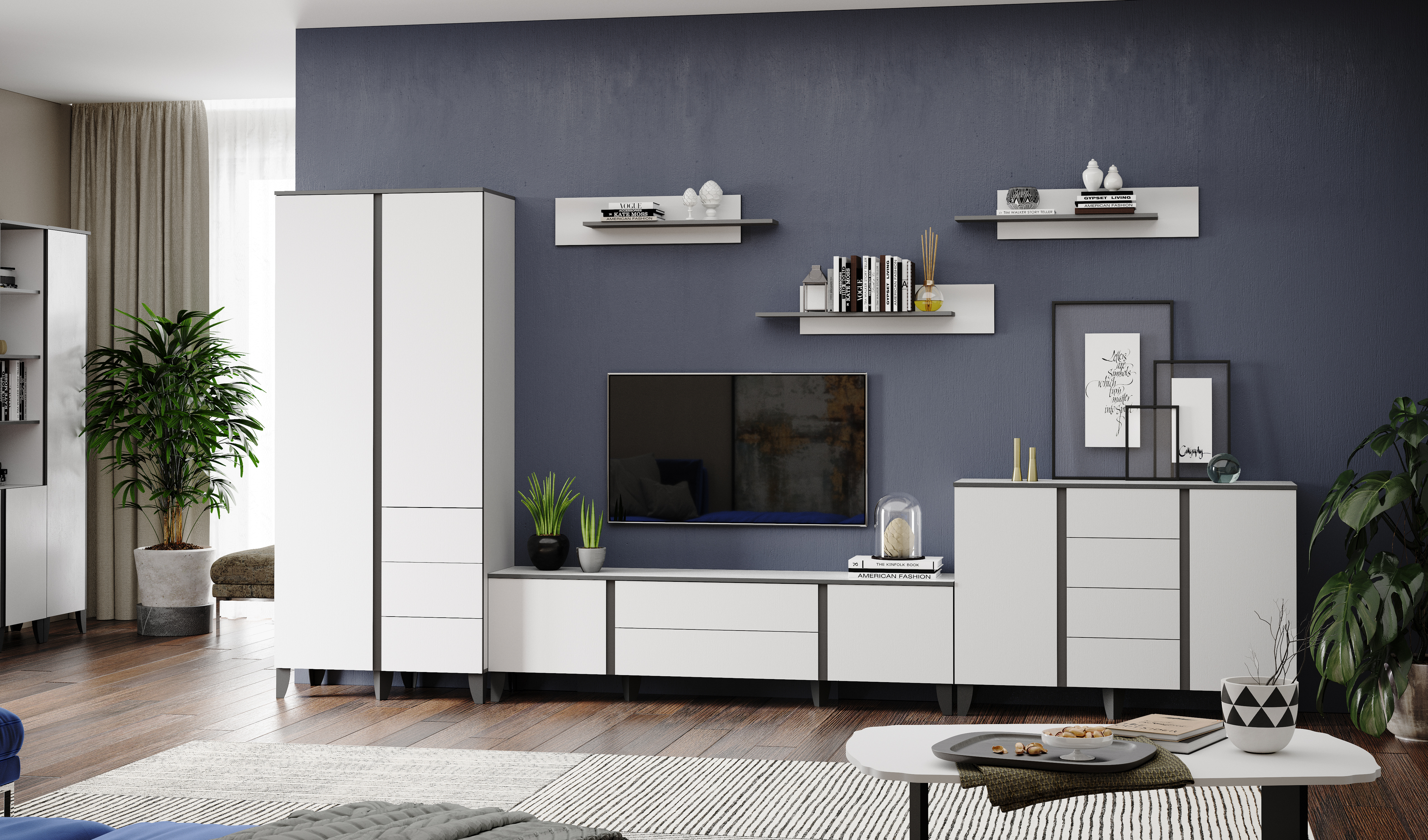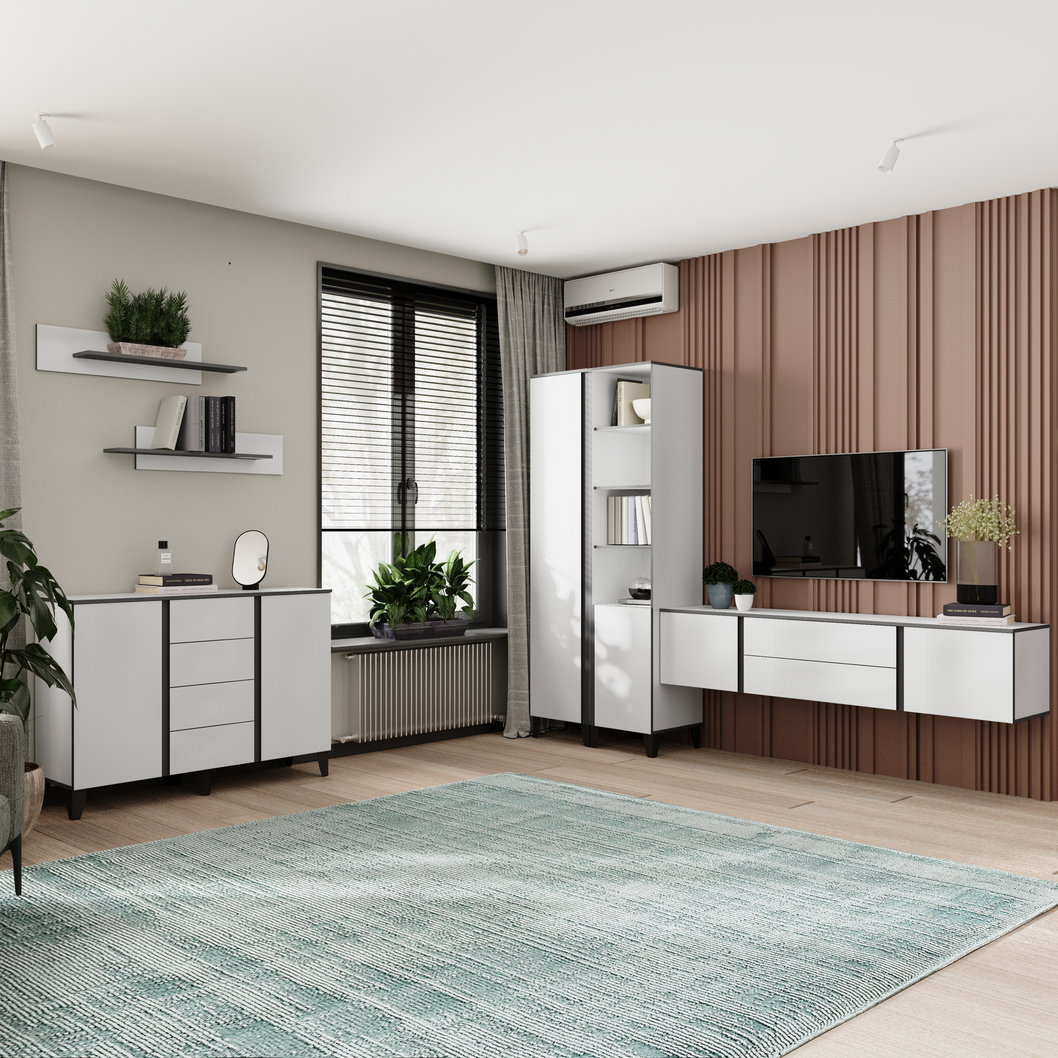 Продуманная система хранения позволяет удобно разместить книги, журналы, декоративные элементы и аксессуары для ТВ-техники, сохраняя порядок и визуальную лёгкость интерьера. Лаконичный дизайн тумбы подчёркивает современный стиль гостиной, а универсальный формат делает её уместной как в минималистичных, так и в более уютных интерьерных решениях.