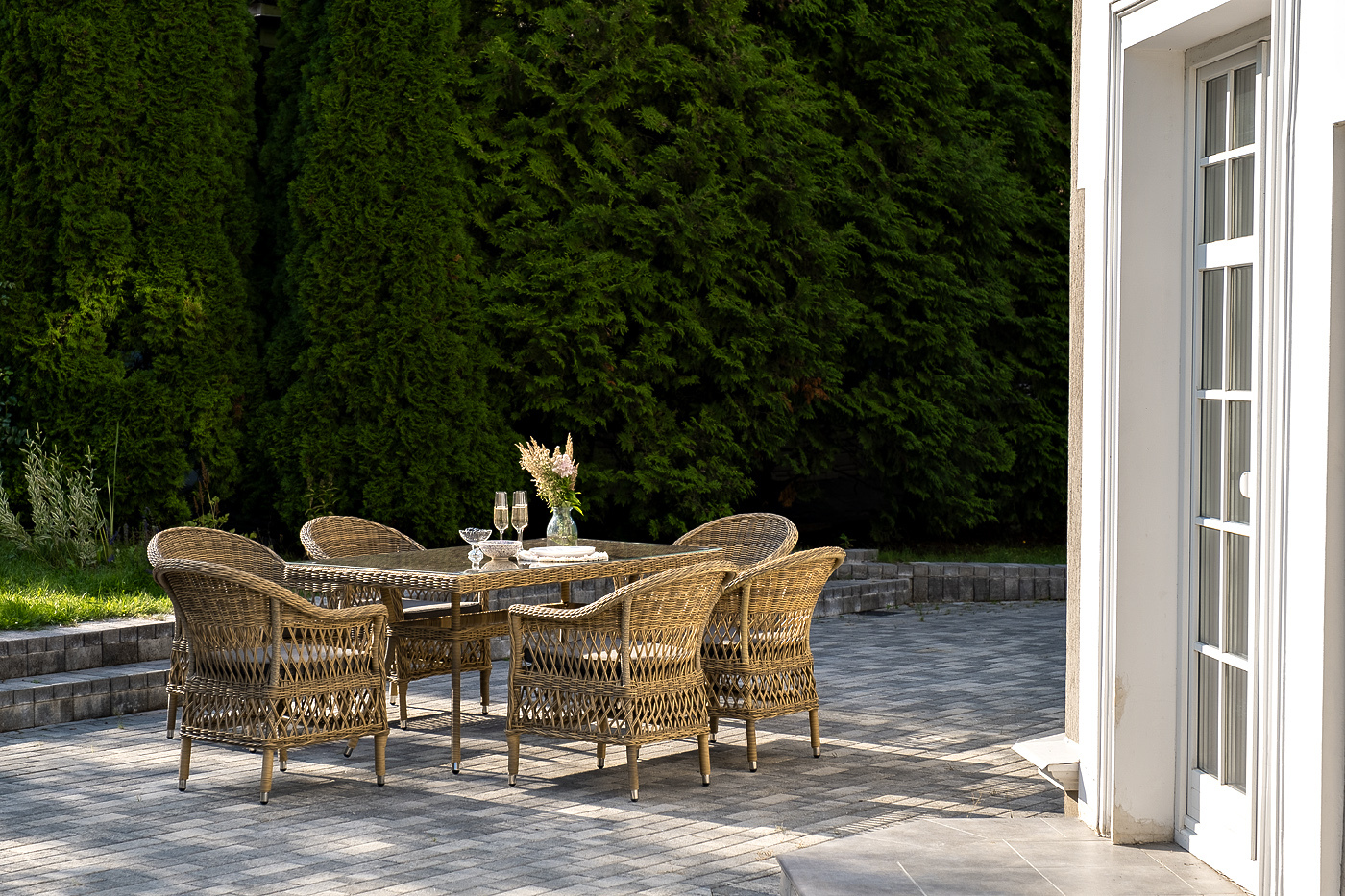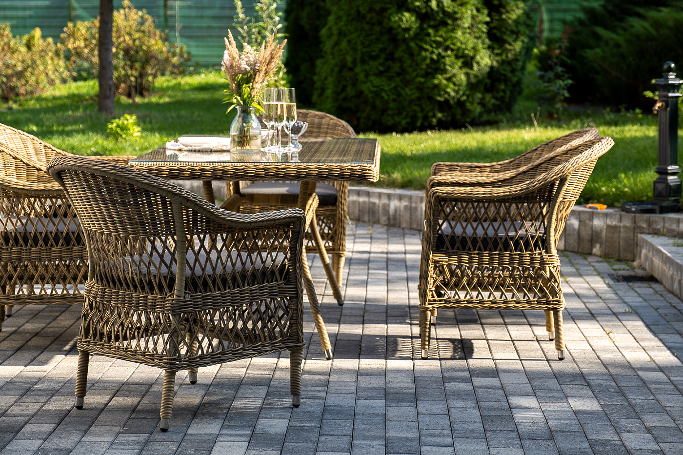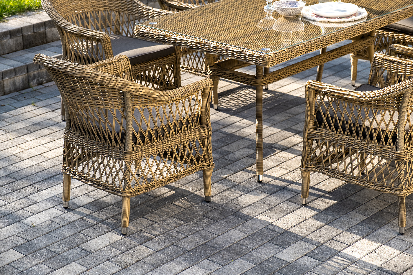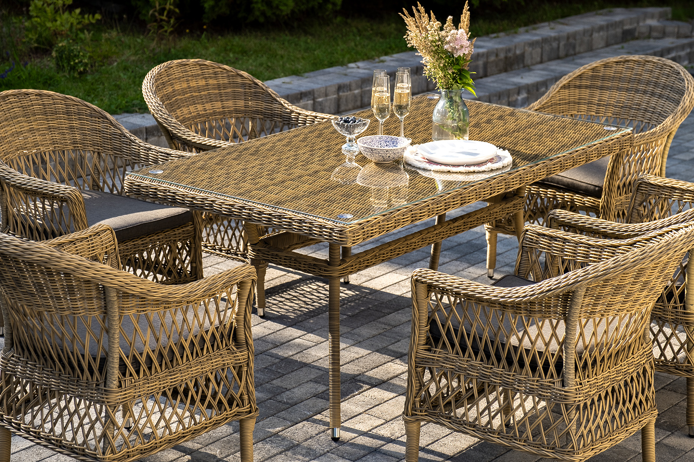 Обеденная группа «Амароне» относится к числу садовой мебели для обустройства открытых террас и веранд.