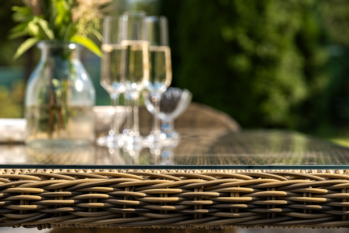 В качестве рабочей поверхности плетеного обеденного стола выступает стеклянная столешница, которая крепится при помощи вакуумных силиконовых держателей и поставляется в собранном виде.