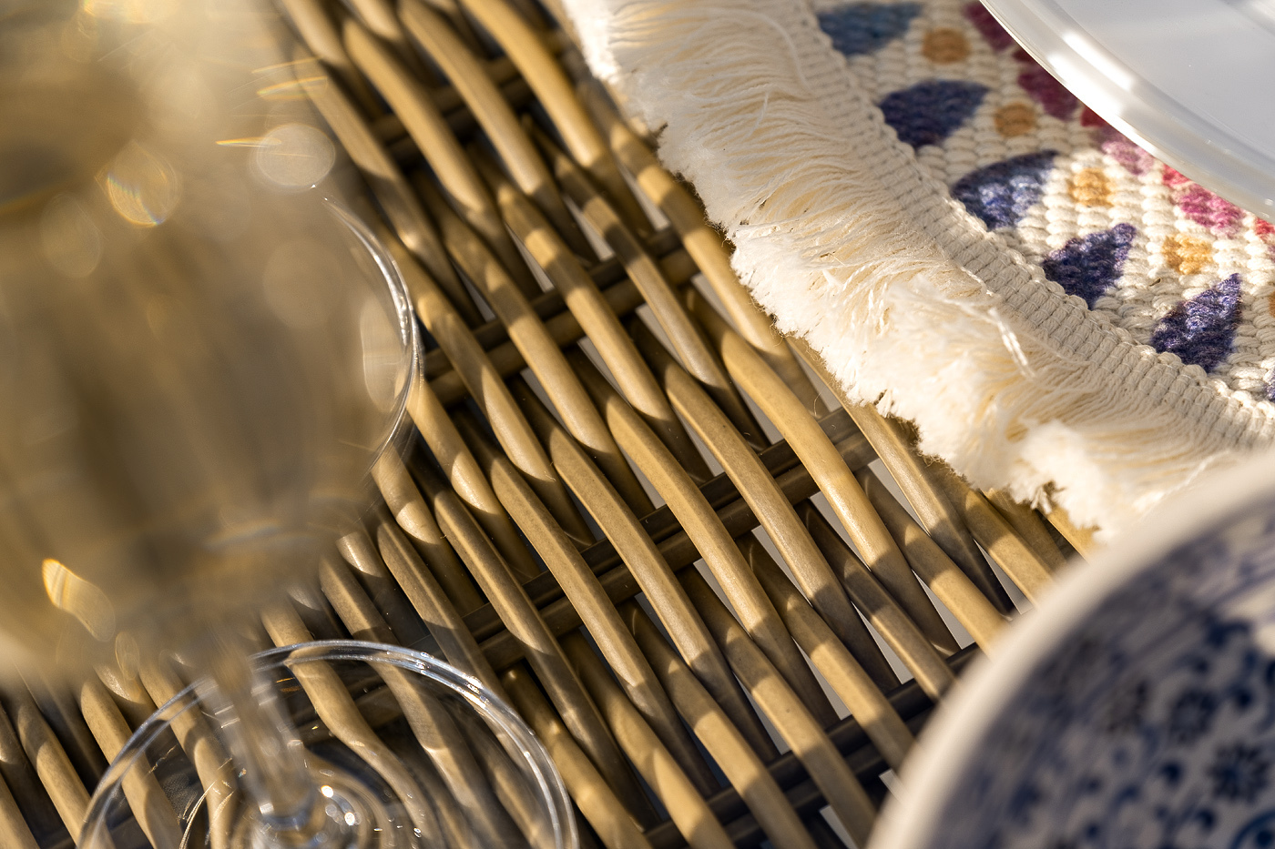 Алюминий используется при создании прочного каркаса мебели. Оформлен ручным плетением из круглого искусственного ротанга соломенного цвета.