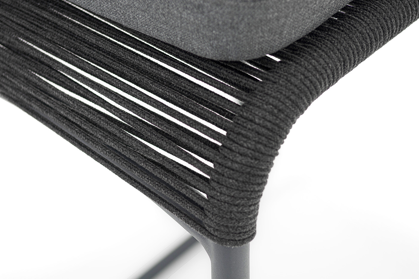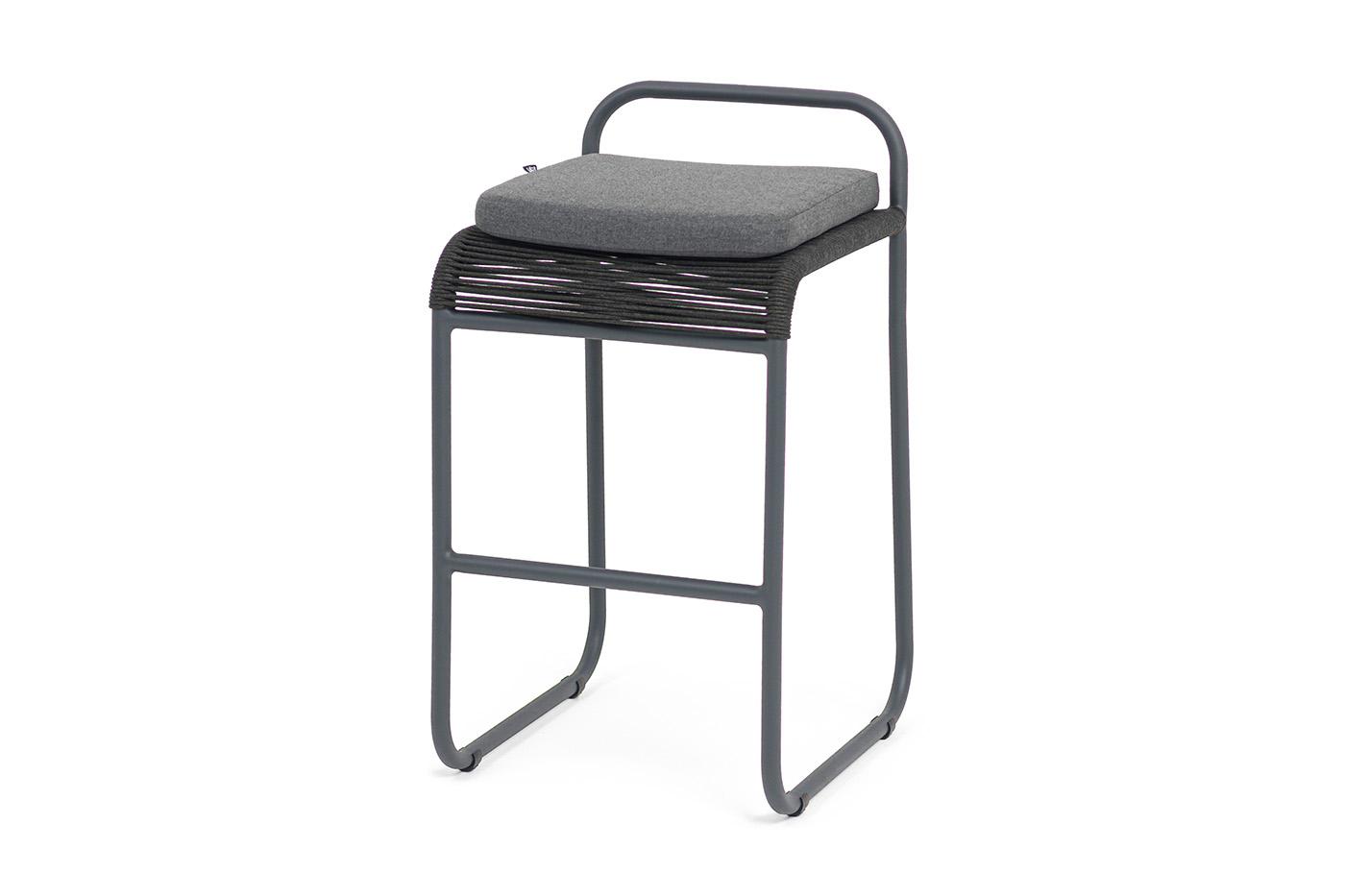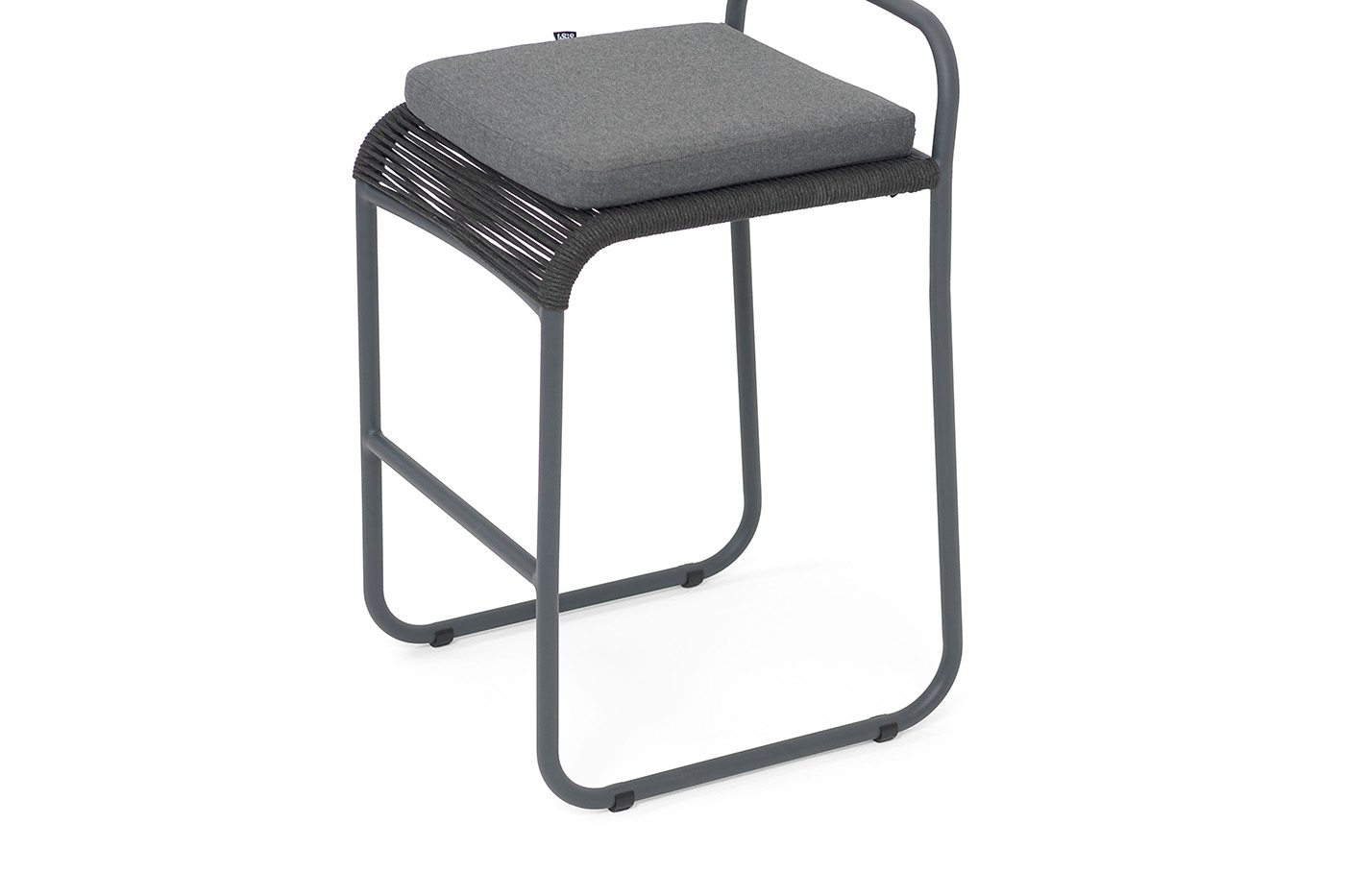 Барный стул «Ането» представлен в алюминиевом каркасе темно-серого (RAL7024) цвета. Оплетен вручную эластичными синтетическими лентами из высокопрочных полиэфирных волокон темно-серого цвета.