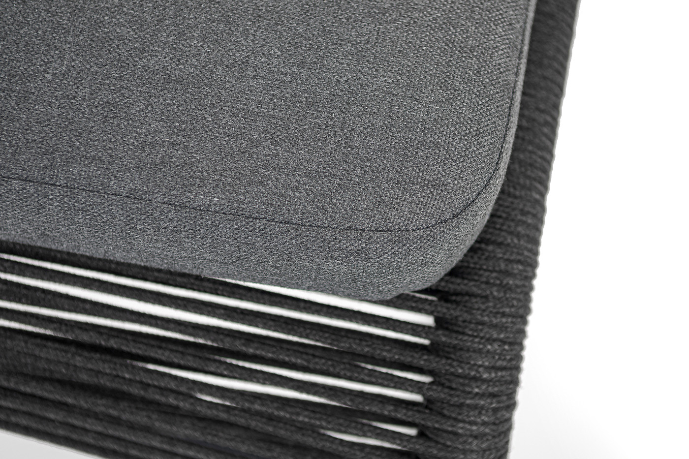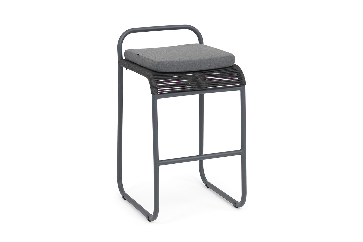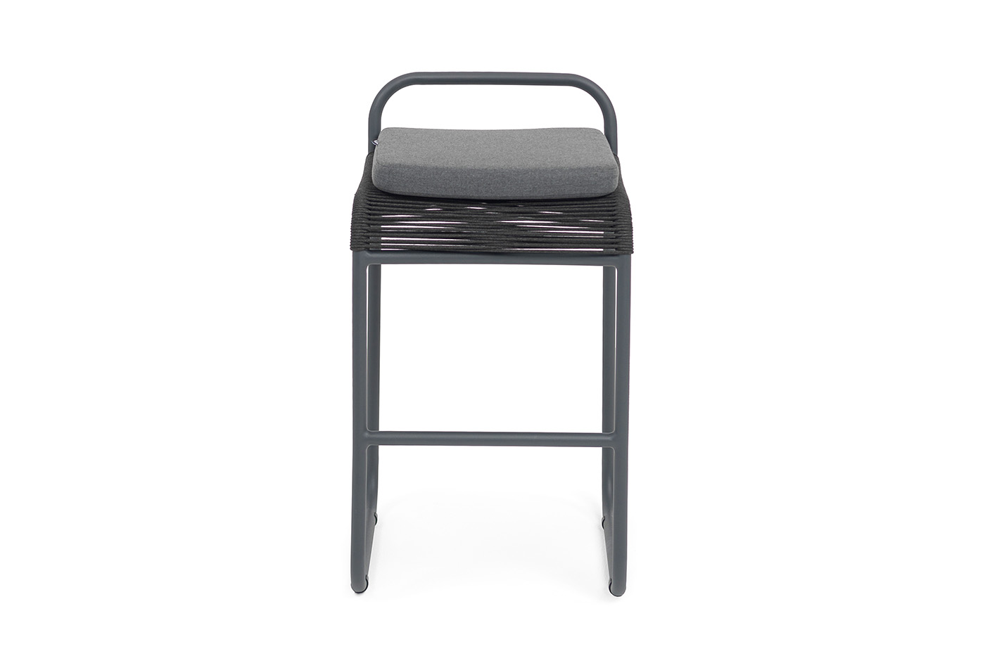 Барный стул «Ането» представлен в алюминиевом каркасе темно-серого (RAL7024) цвета. Оплетен вручную эластичными синтетическими лентами из высокопрочных полиэфирных волокон темно-серого цвета.