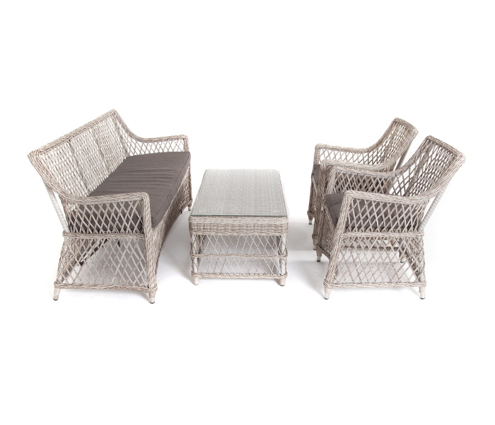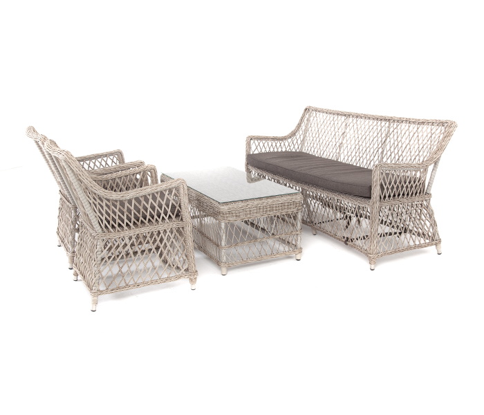 Оплетка выполнена вручную искусственным ротангом бежевого цвета, диван и кресло укомплектованы подушками из 100% полиэстера, которые пропитаны специальным составом, обладающим влагоотталкивающим свойством.