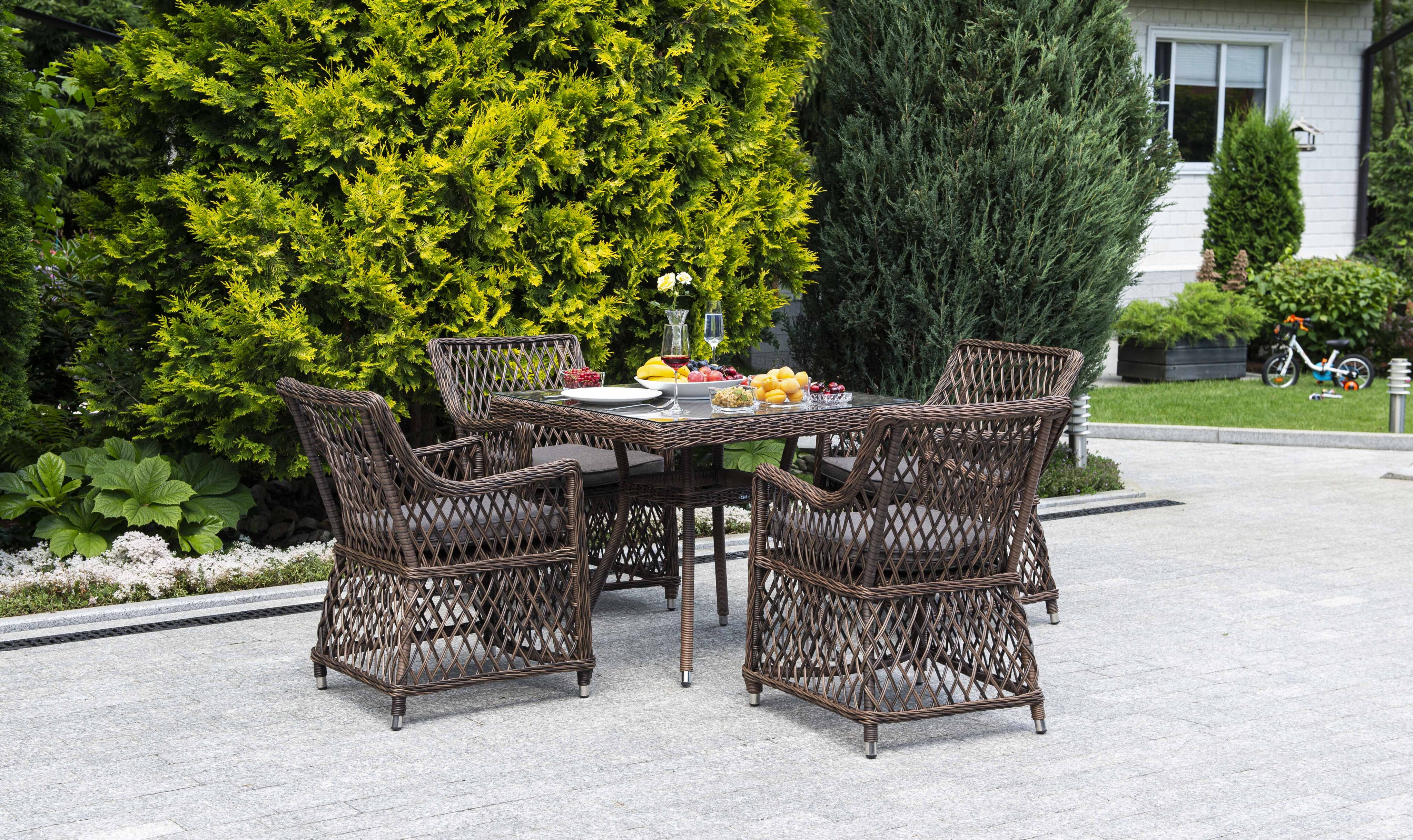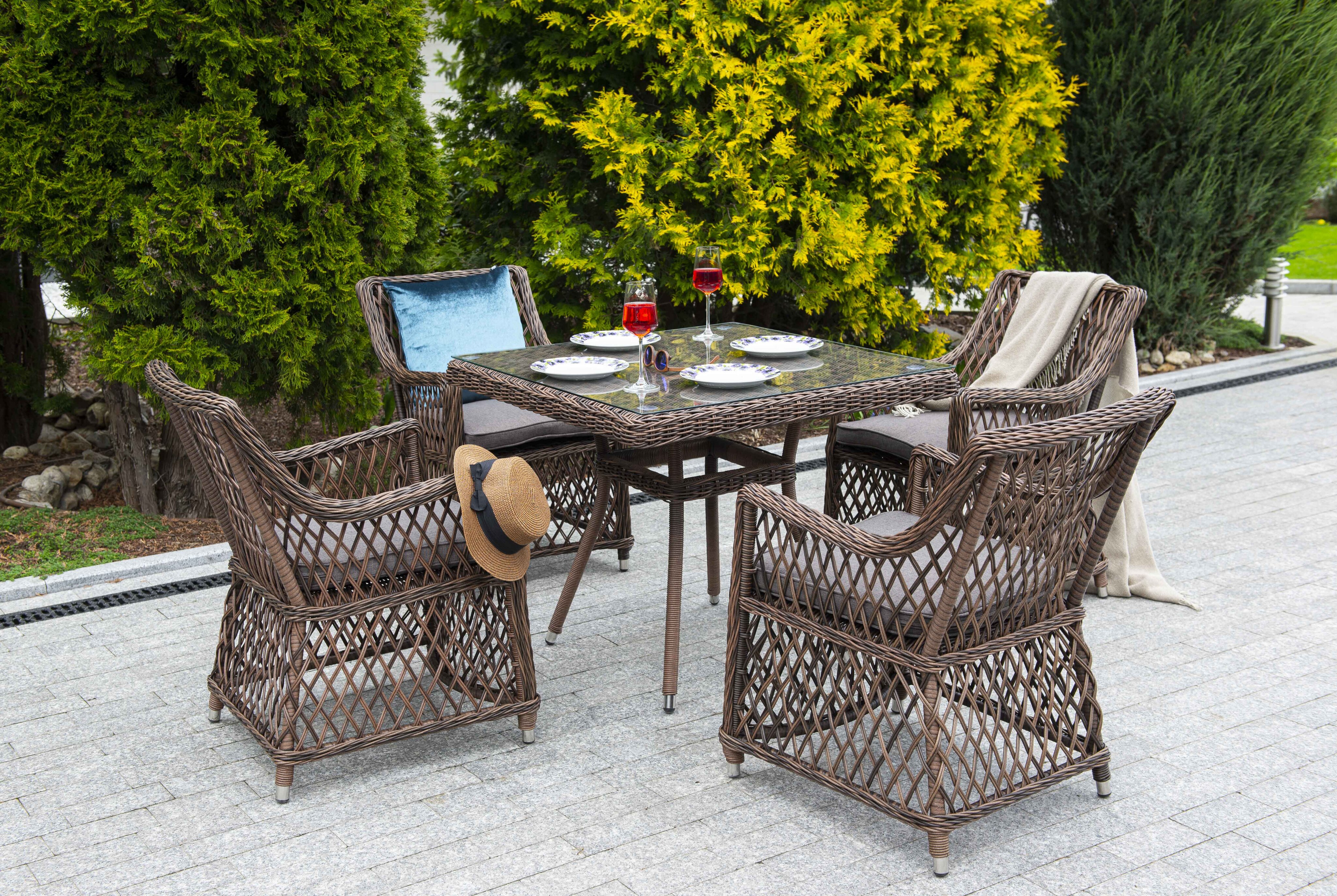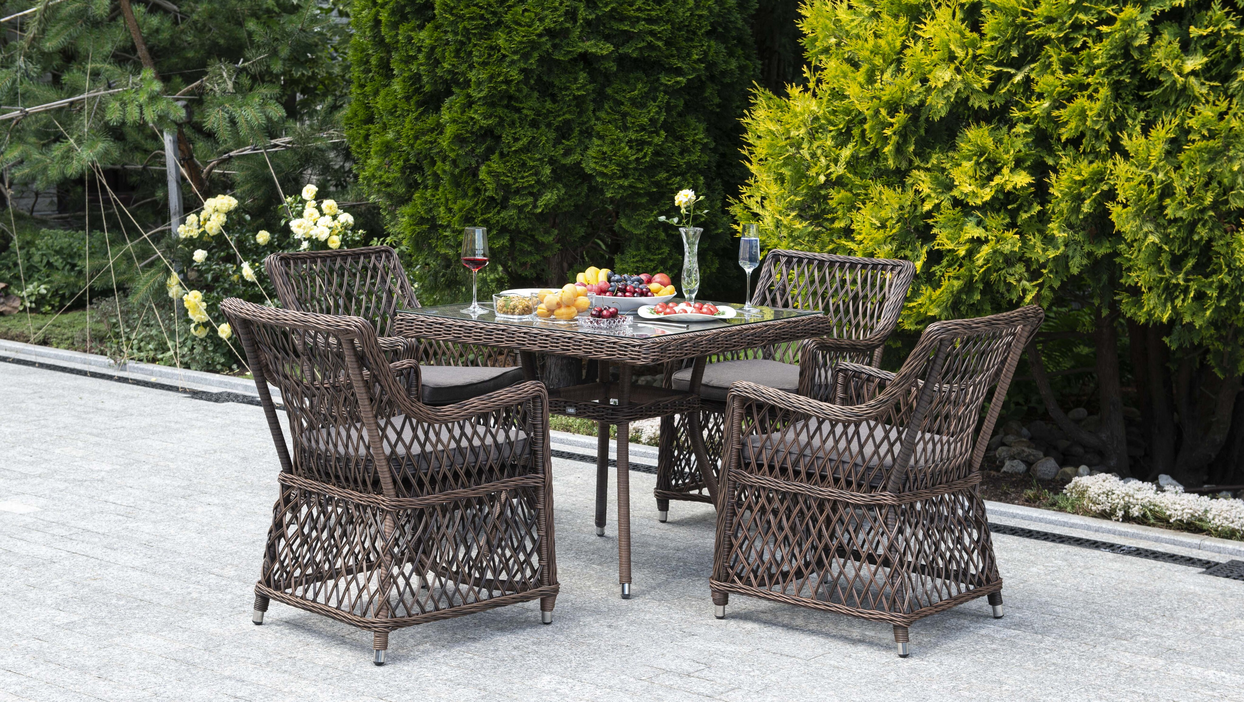 Все элементы можно заказать по отдельности "Айриш" стол плетеный из искусственного ротанга, цвет коричневый 1шт. 900Х900Х750, "Латте" плетеное кресло из искусственного ротанга, цвет коричневый 4шт. 550Х660Х850,