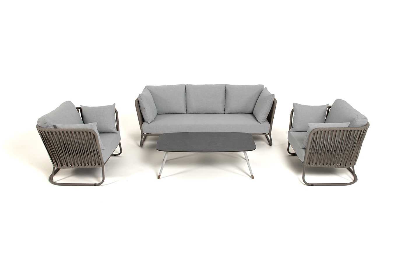 *Базовая комплектация - 12 подушек. "Багамы" диван 3-местный плетеный из роупа, каркас алюминий бежево-серый (RAL7006) муар, роуп серо-коричневый 23мм, ткань светло-серая 1шт. 2 000Х800Х735, "Багамы" кресло плетеное из роупа, каркас алюминий бежево-серый (RAL7006) муар, роуп серо-коричневый 23мм, ткань светло-серая 2шт. 920Х800Х735, "Верона" журнальный стол из HPL 120х65, H40, каркас светло-серый (RA L7035) муар, цвет столешницы "серый гранит" 1шт. 1 200Х650Х400,