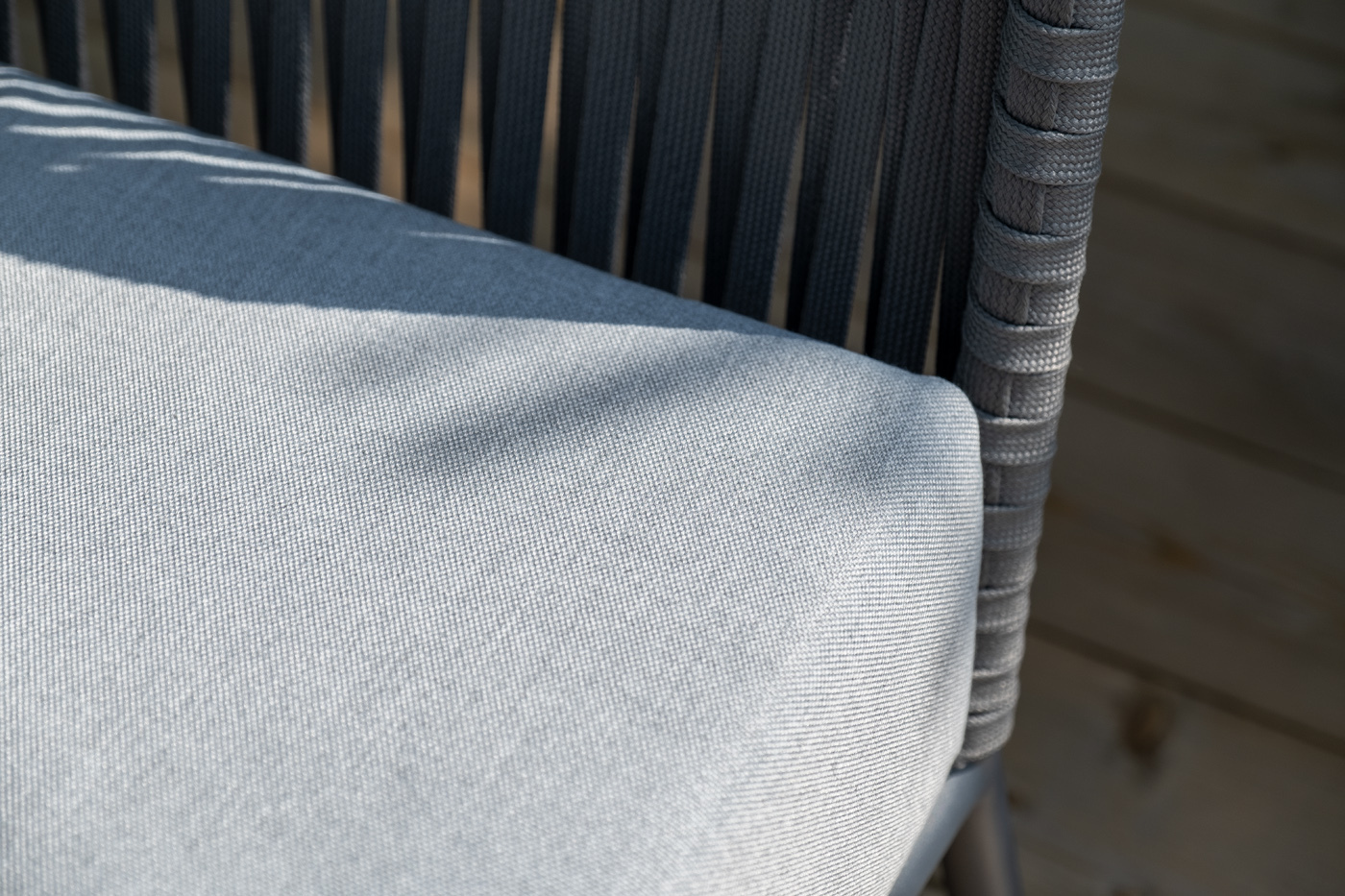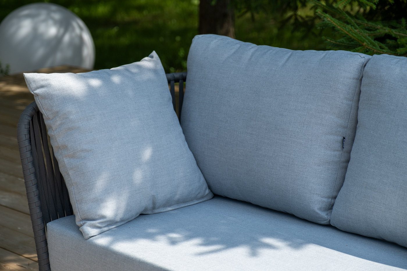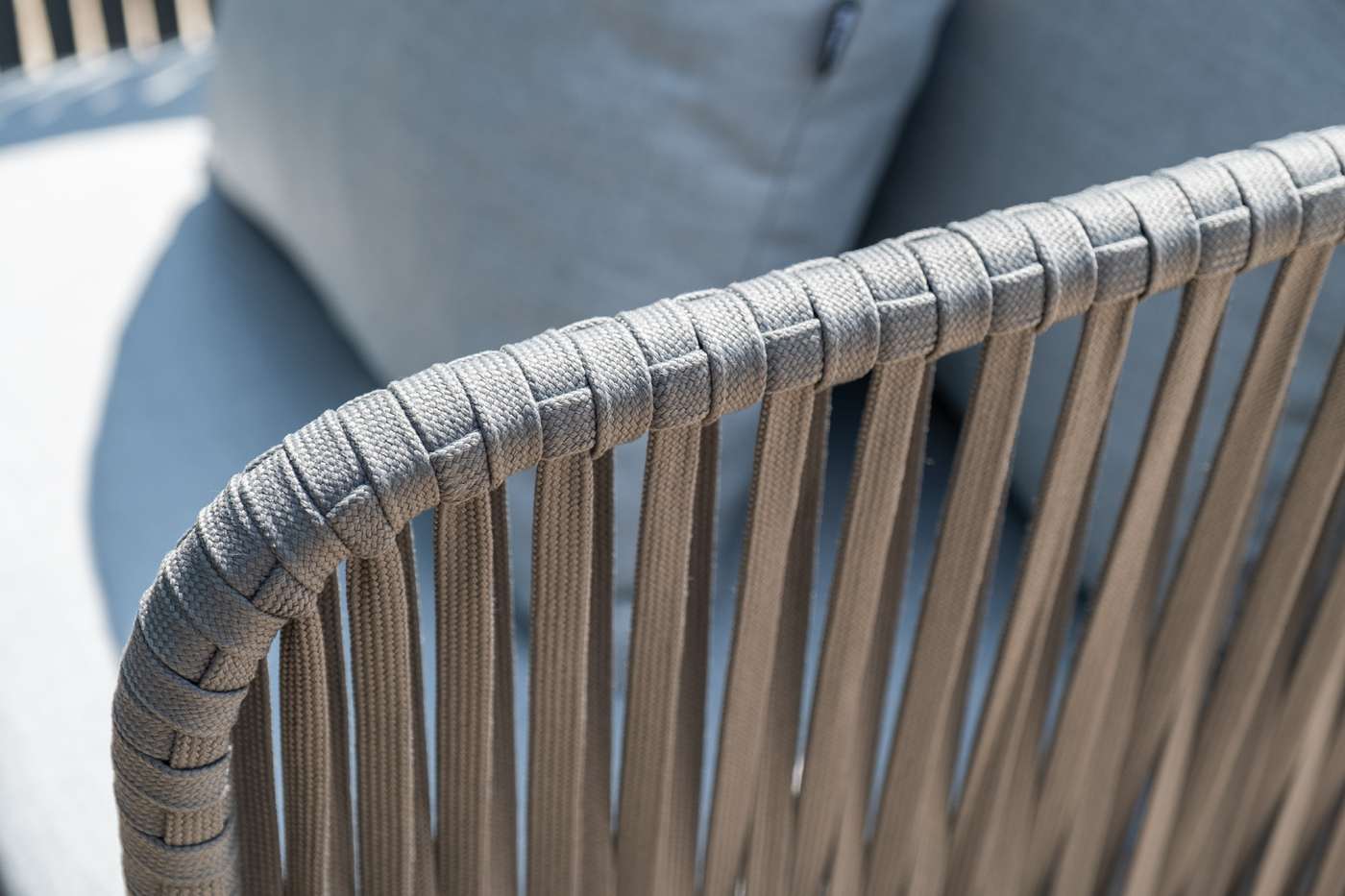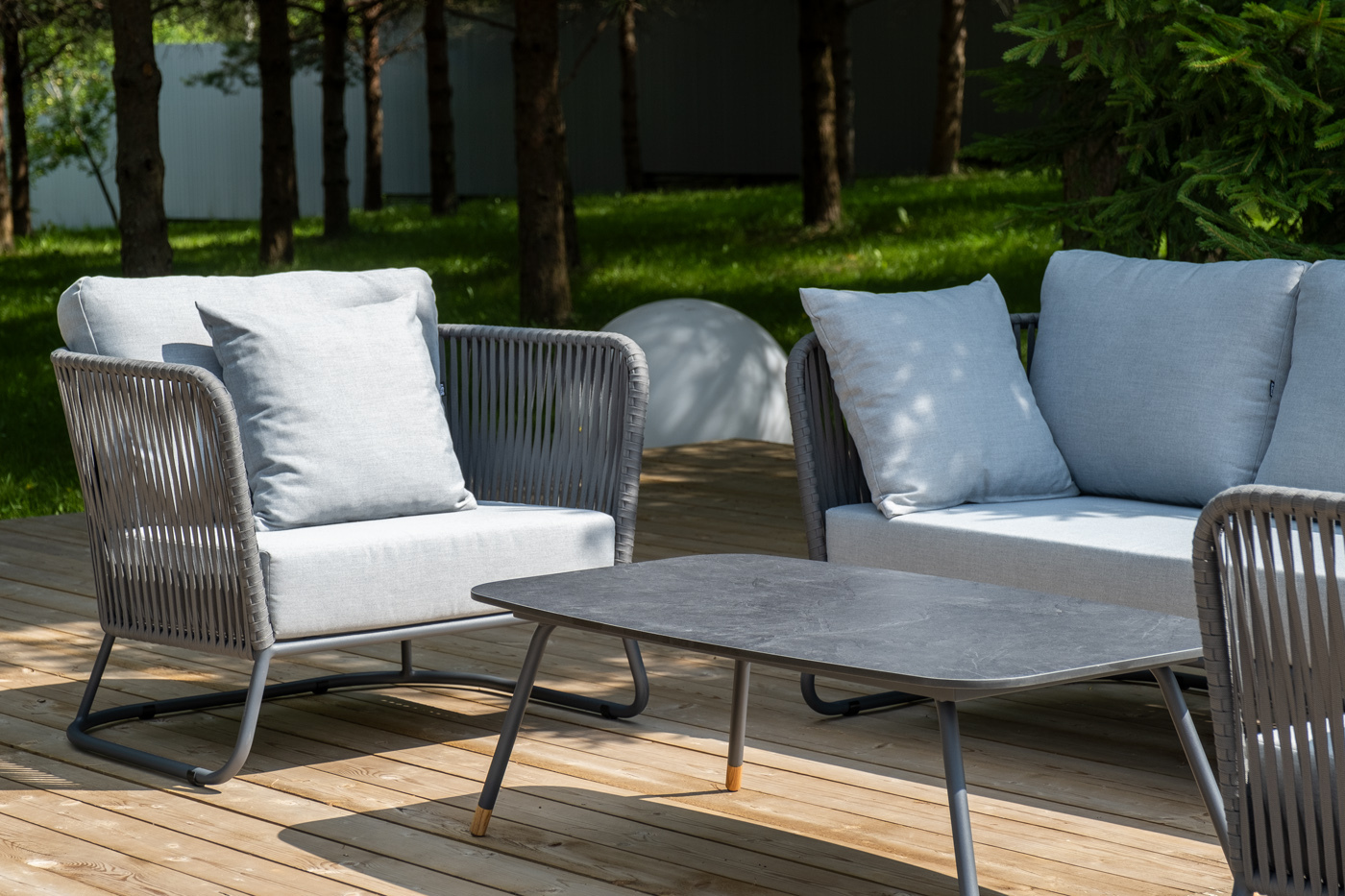 Каркас уличной мебели выполнен из износостойкого алюминия. Его дополняет серая ручная оплетка, изготовленная на основе эластичных синтетических лент из полиэфирных волокон высокой прочности (роупа).