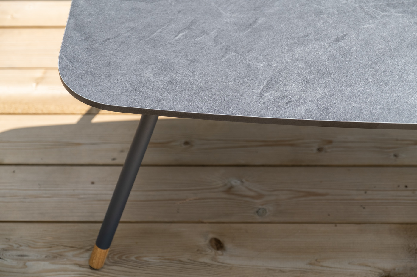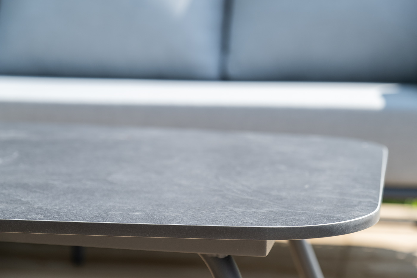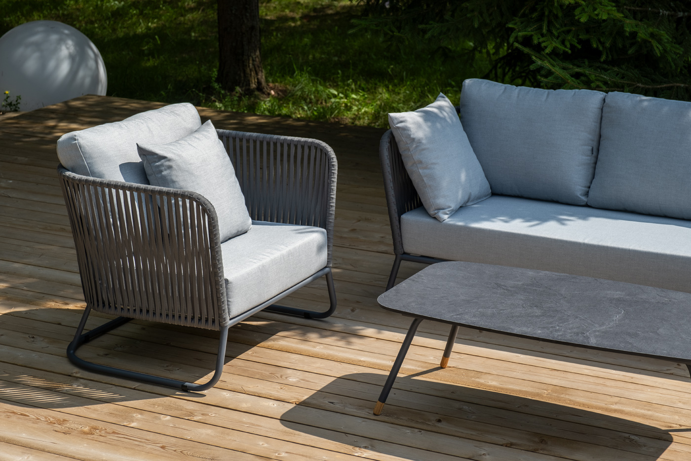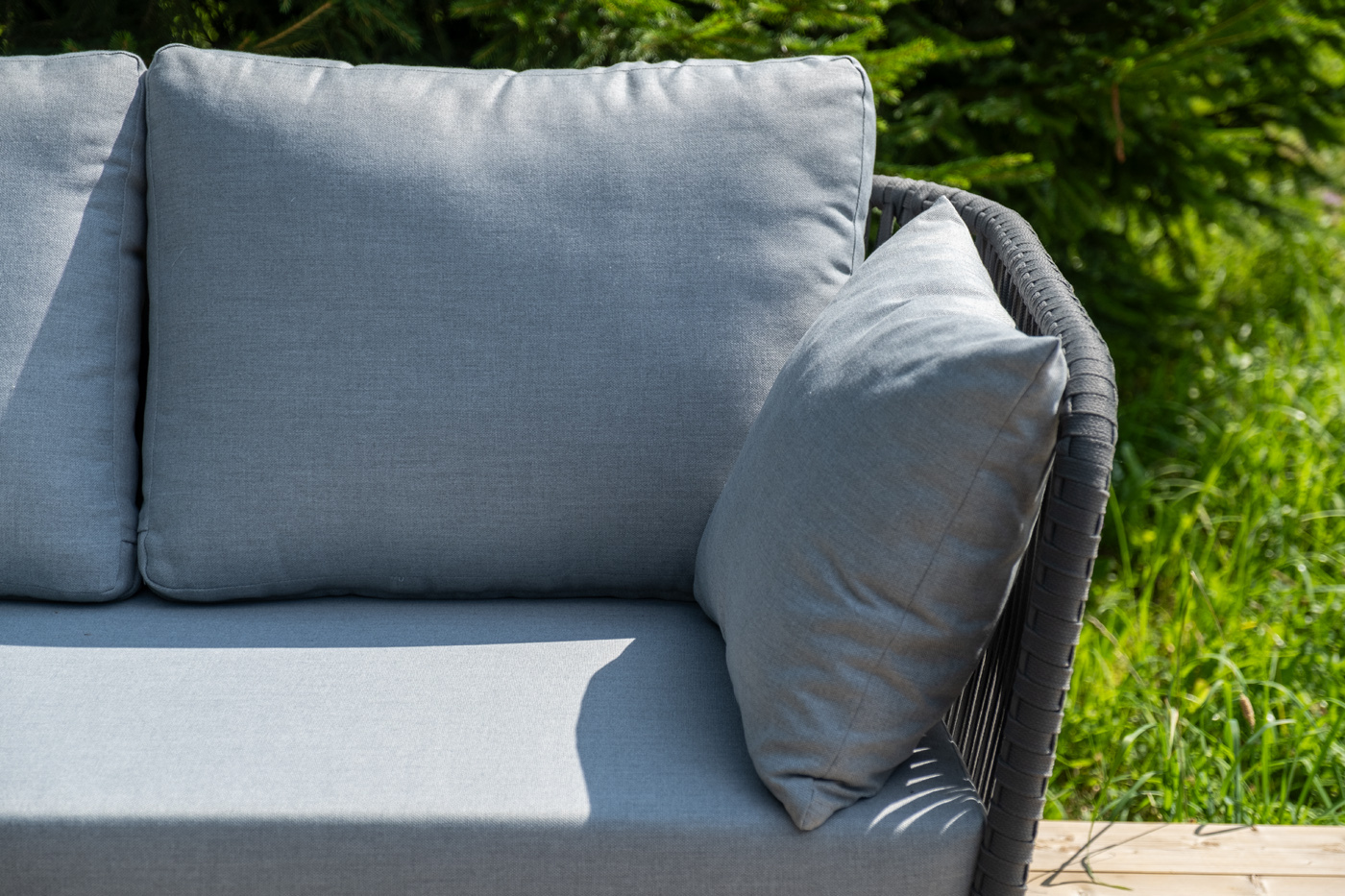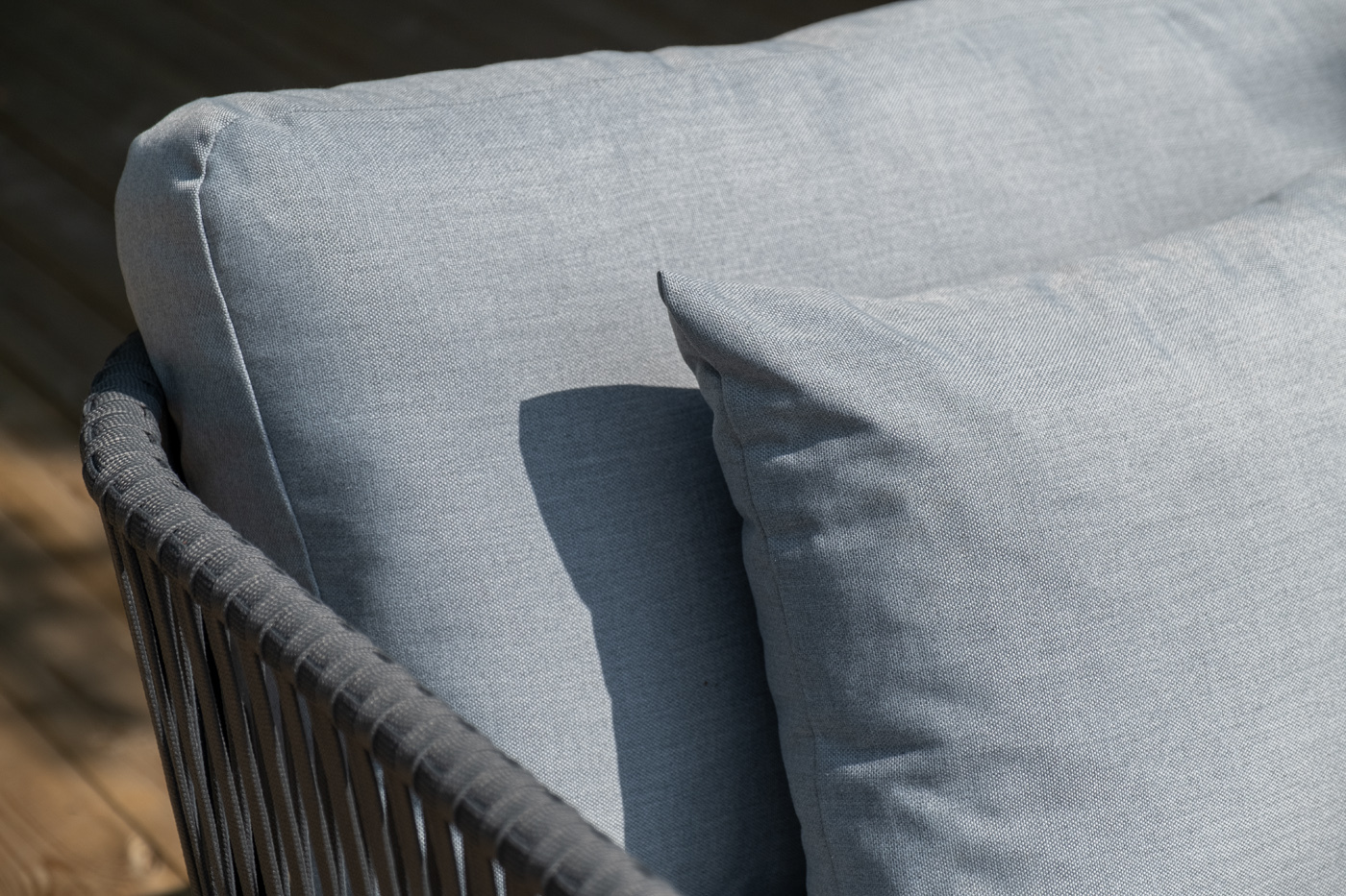 Каркас уличной мебели выполнен из износостойкого алюминия. Его дополняет серая ручная оплетка, изготовленная на основе эластичных синтетических лент из полиэфирных волокон высокой прочности (роупа).