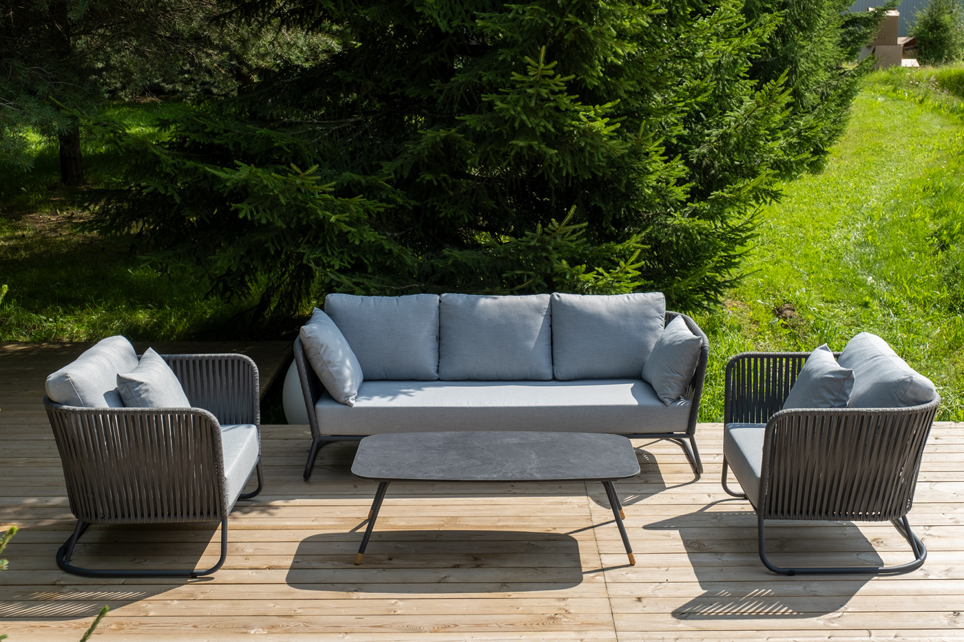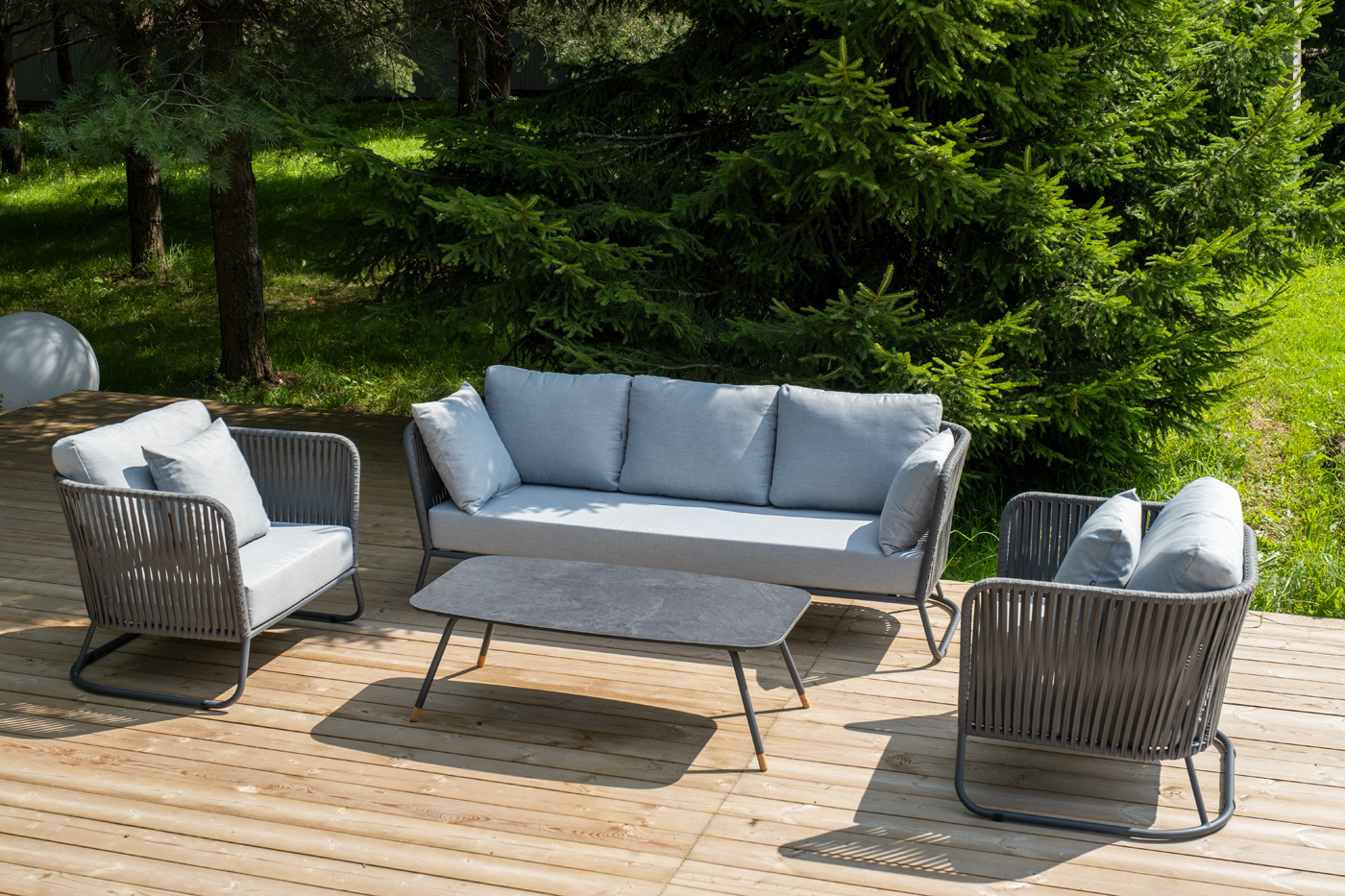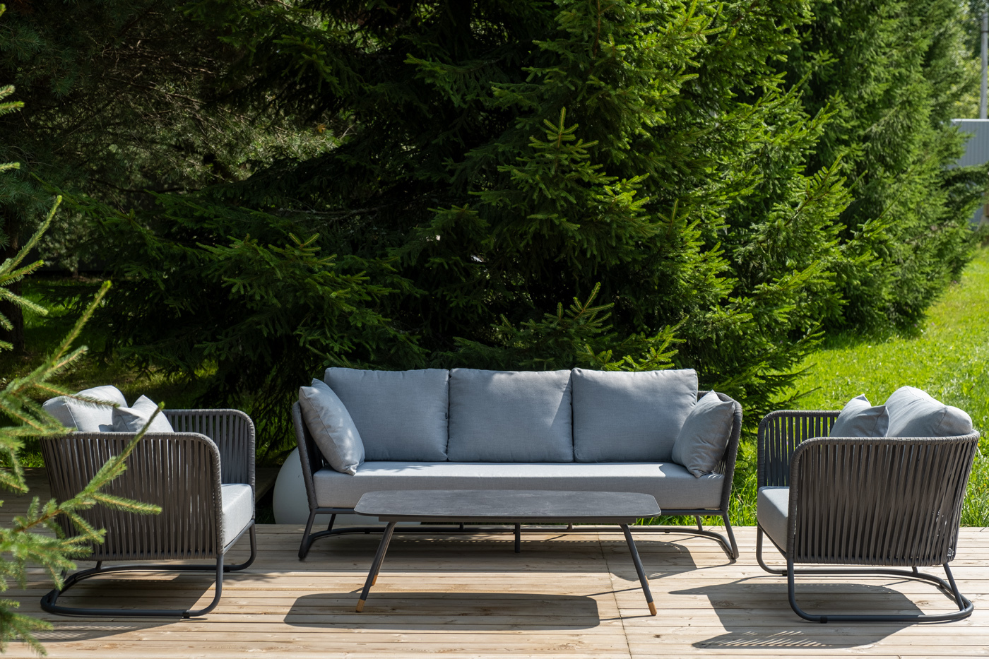 Кресла и диван идут в комплекте с мягкими подушками в чехлах светло-серого цвета. "Багамы" диван 3-местный плетеный из роупа, каркас алюминий темно-серый (RAL7024) муар, роуп серый 15мм, ткань светло-серая 1шт. 2 000Х800Х735, "Багамы" кресло плетеное из роупа, каркас алюминий темно-серый (RAL7024) муар, роуп серый 15мм, ткань светло-серая 2шт. 920Х800Х735, "Верона" журнальный стол из HPL 120х65, H40, каркас черный муар, цвет столешницы "серый гранит" 1шт. 1 200Х650Х400,