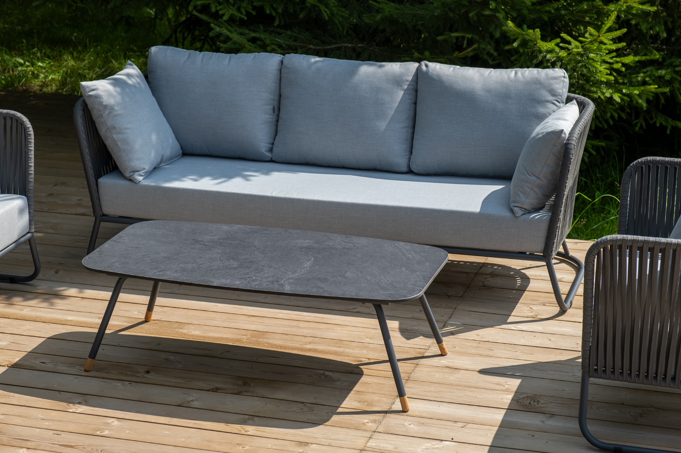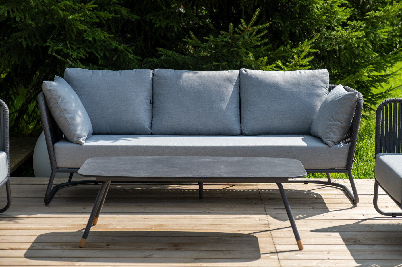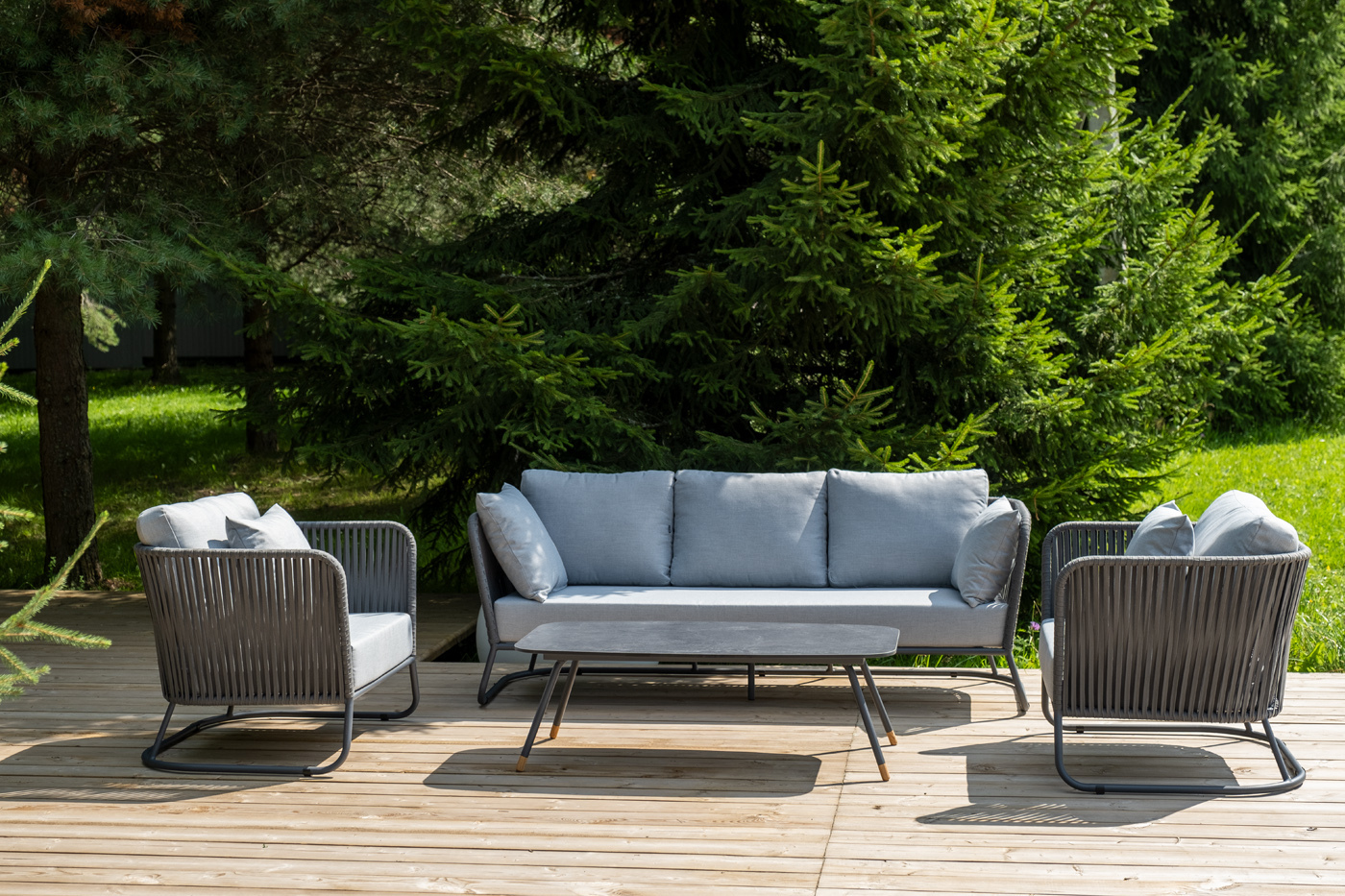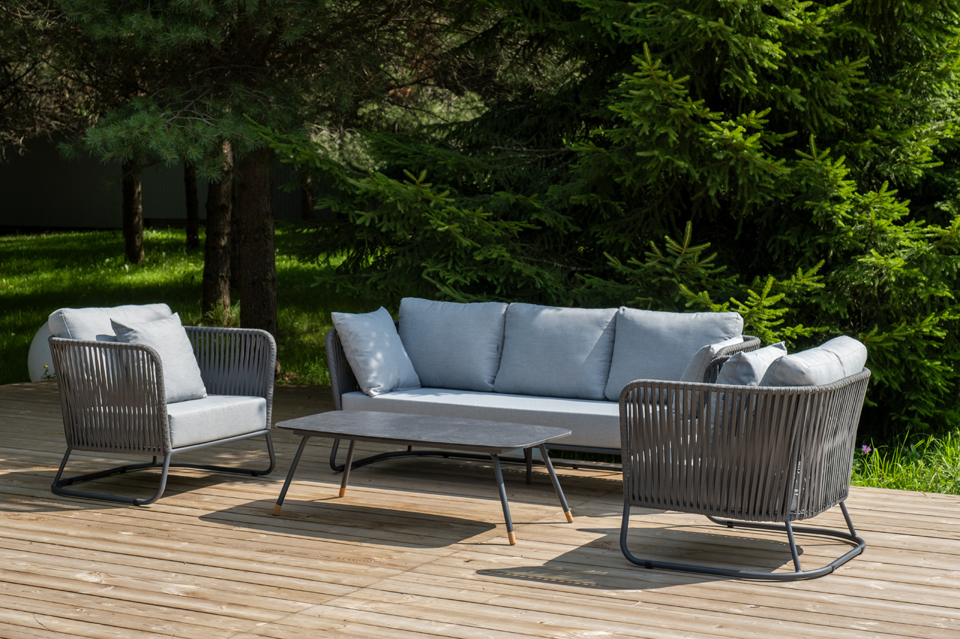 Кресла и диван идут в комплекте с мягкими подушками в чехлах светло-серого цвета. "Багамы" диван 3-местный плетеный из роупа, каркас алюминий темно-серый (RAL7024) муар, роуп серый 15мм, ткань светло-серая 1шт. 2 000Х800Х735, "Багамы" кресло плетеное из роупа, каркас алюминий темно-серый (RAL7024) муар, роуп серый 15мм, ткань светло-серая 2шт. 920Х800Х735, "Верона" журнальный стол из HPL 120х65, H40, каркас черный муар, цвет столешницы "серый гранит" 1шт. 1 200Х650Х400,