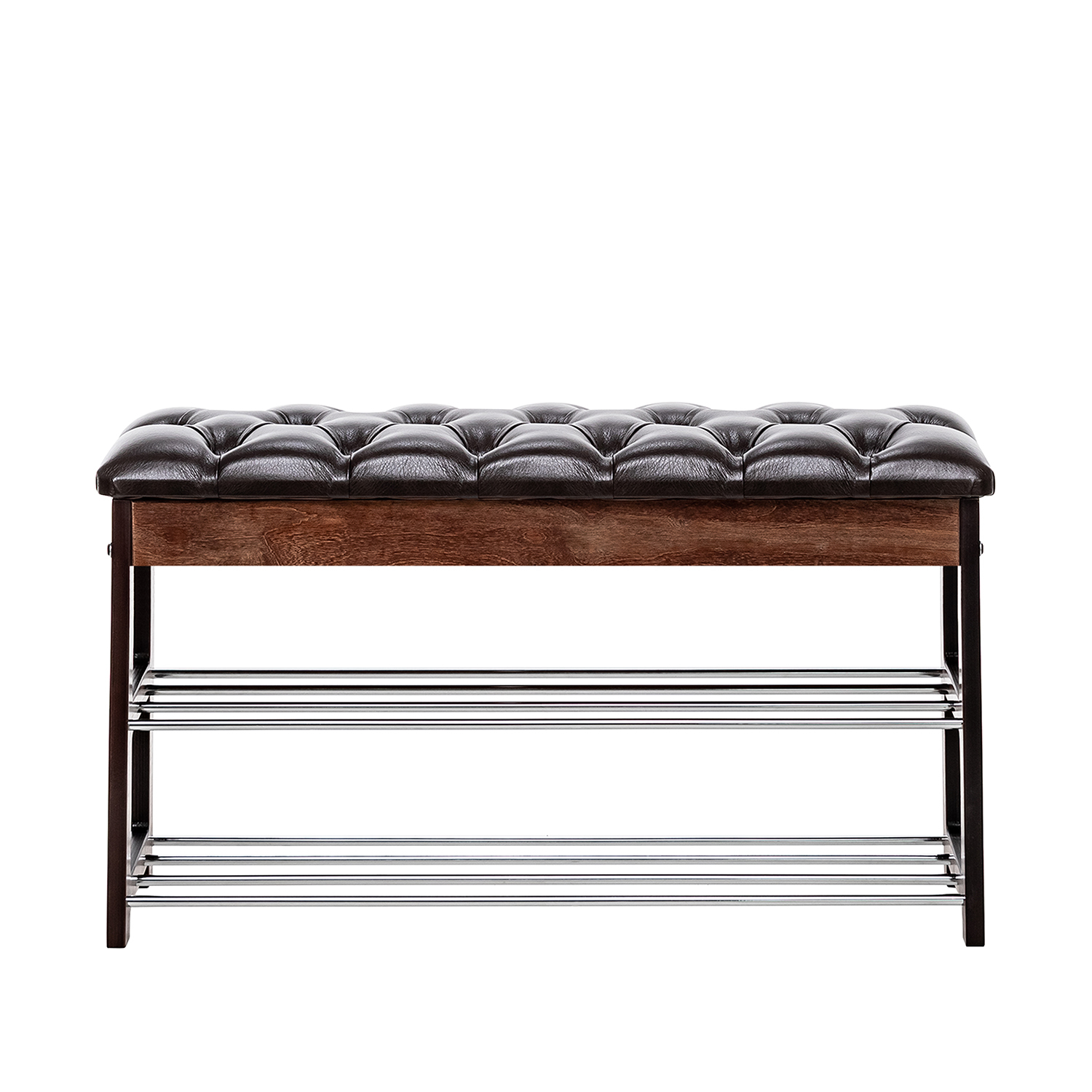 Широкая двухместная банкетка с мягким сиденьем и полкой для обуви. Она сделана в незамысловатом дизайне и органично впишется в любой интерьер.
