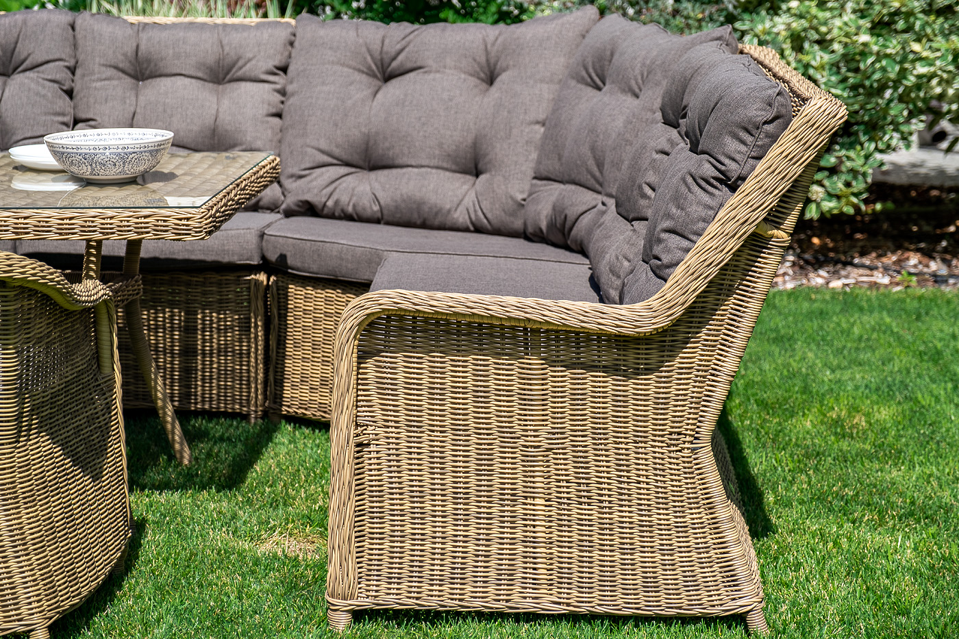 Угловая модульная лаунж зона с обеденным столом и тремя стульями. Искусственный ротанг, плетение круглое, цвет соломенный, алюминиевый каркас. Столешница из закаленого стекла 5 мм.