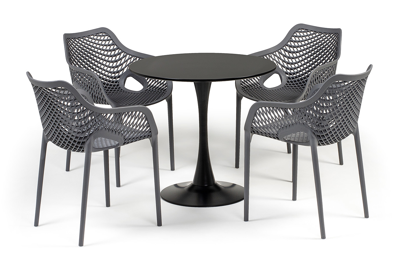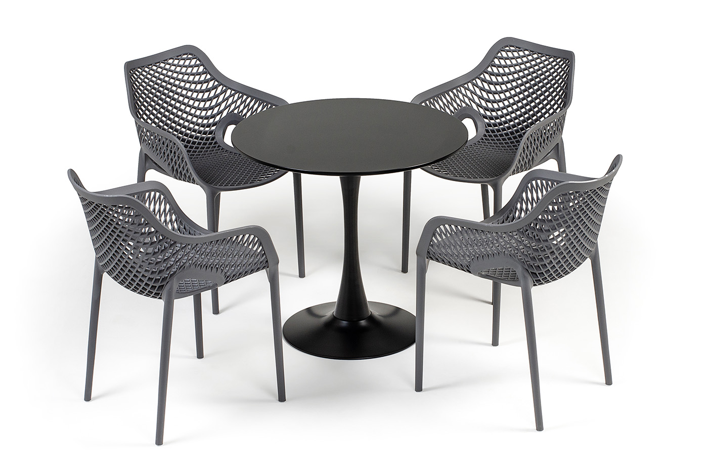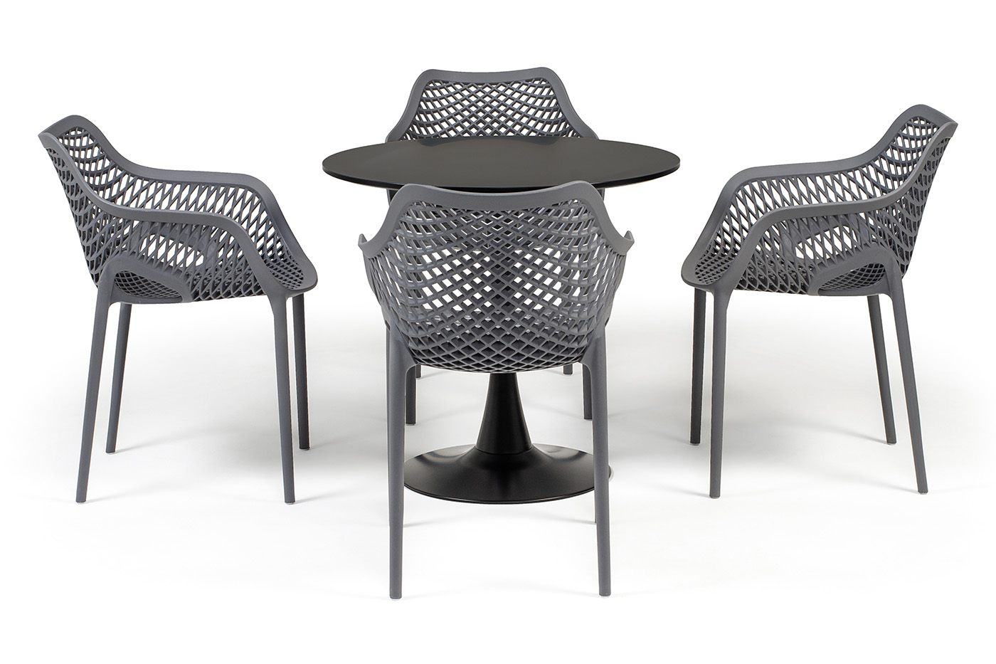Стулья изготовлены из полипропилена, прочного и стойкого пластика, устойчивого к УФ-излучению, благодаря этому стул сохраняет свой первоначальный вид и не выцветает на солнце даже несмотря на активную эксплуат "Беллини" пластиковый круглый стол Ø80см, цвет темно-серый 1шт. 800Х800Х750, "Беллини" стул пластиковый, цвет темно-серый 4шт. 540Х610Х810,
