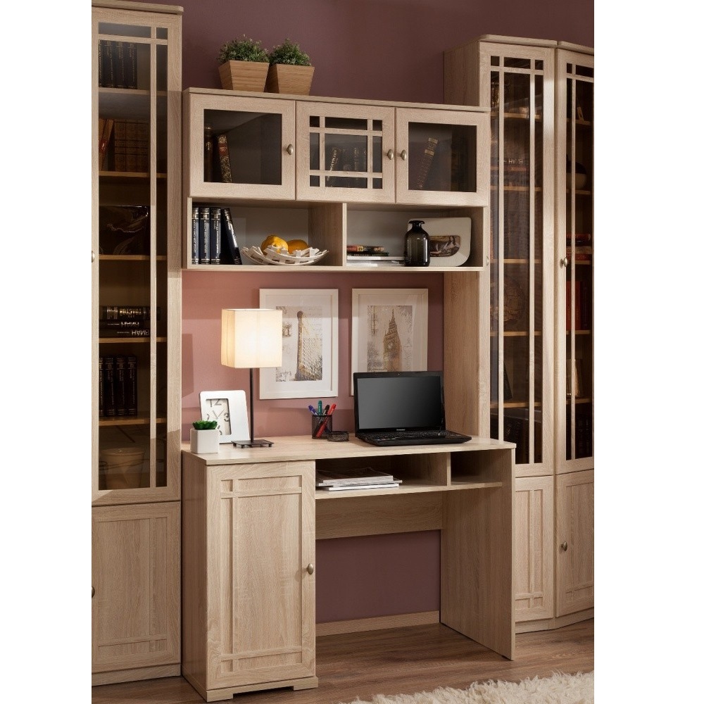 Идеальным местом для обустройства библиотеки в квартире является домашний кабинет. В нем Вы сможете заняться важными делами в спокойной обстановке или просто почитать любимую книгу. Благодаря модульности, библиотеку SHERLOCK можно расположить в Вашем домашнем кабинете, выбрав для компоновки именно те модули, которые Вам нужны. Письменный стол, расположенный у окна, сделает чтение и работу с документами максимально комфортным. В высоких изящных шкафах библиотеки SHERLOCK поместятся книги любого формата: от самых маленьких книг до больших иллюстрированных альбомов, поскольку Вы сами можете регулировать высоту полок. Тонированные стекла фасадов высоких книжных шкафов защитят книги от прямых солнечных лучей, пожелтения страниц, пыли и позволят без проблем найти нужную книгу. Завершающие модули библиотеки SHERLOCK: SHERLOCK 34 и 35 Шкаф для книг, позволят создать гармоничную и, в то же время, изысканную атмосферу в кабинете. Библиотека выполнена в одном декоре и стиле с гостиной SHERLOCK — Дуб Сонома. Поэтому из е