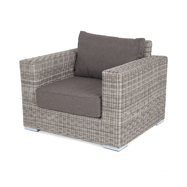 Кресло оснащено каркасом из прочного алюминия, ручное круглое плетение является основным декоративным элементом мебели. Оно выполнено из искусственного ротанга в графитовом цвете.