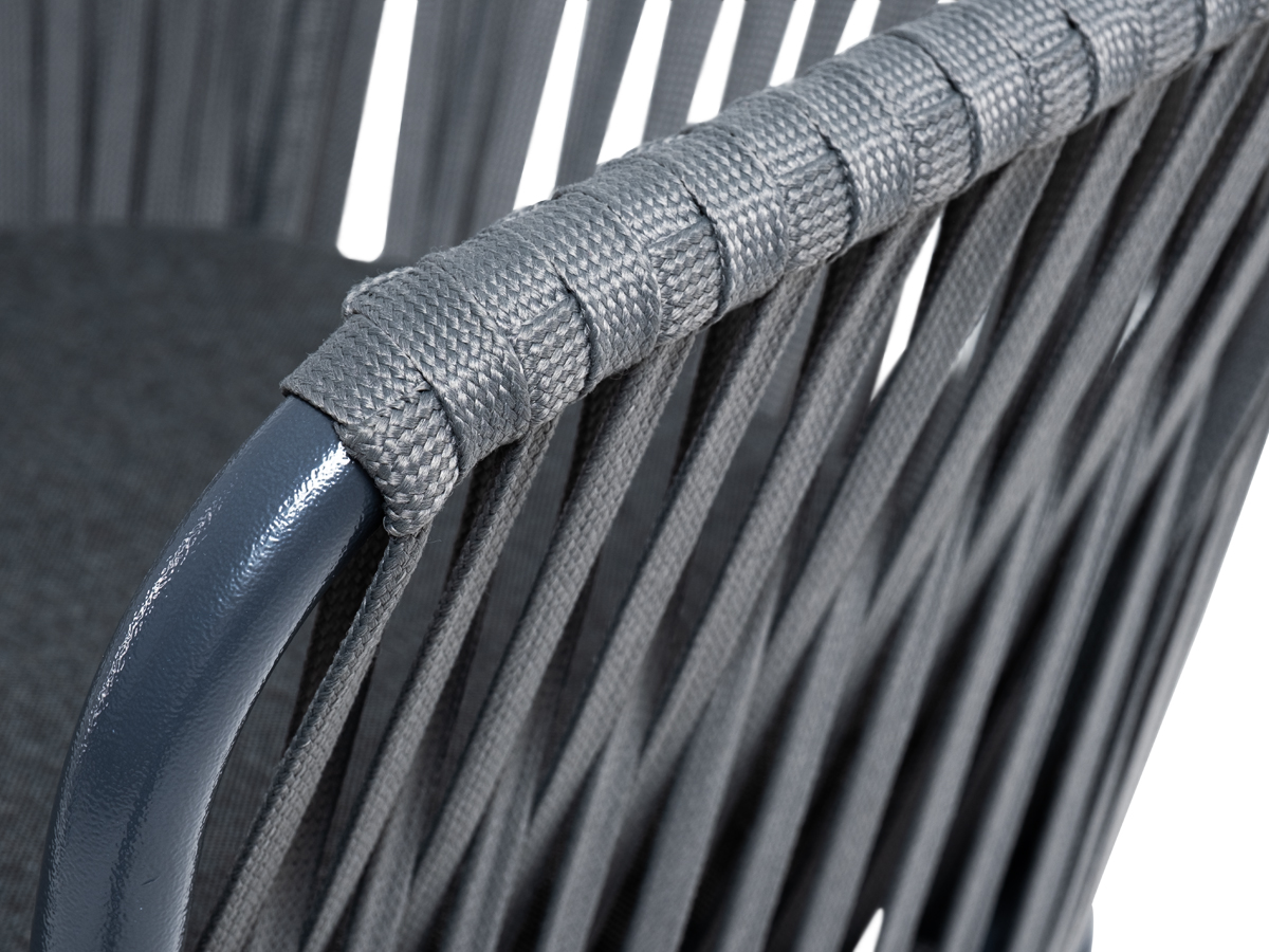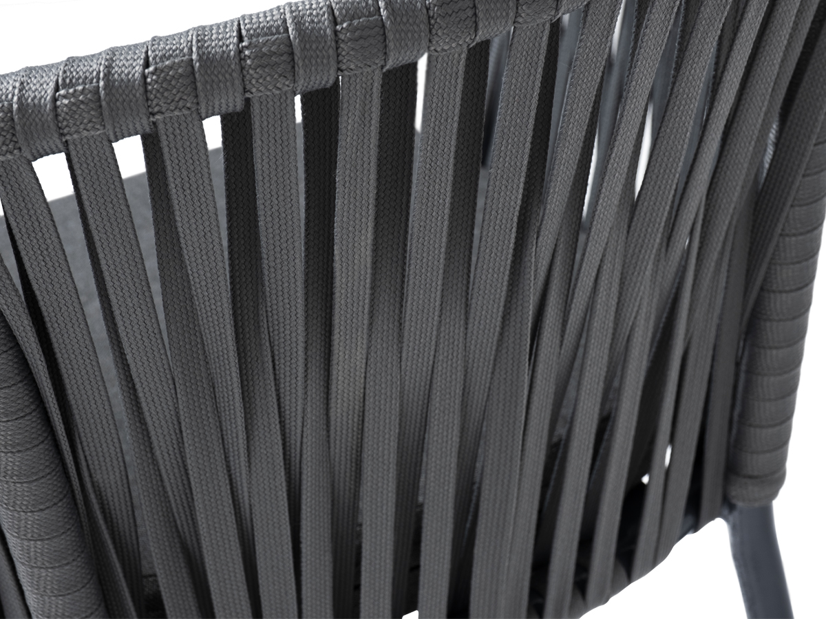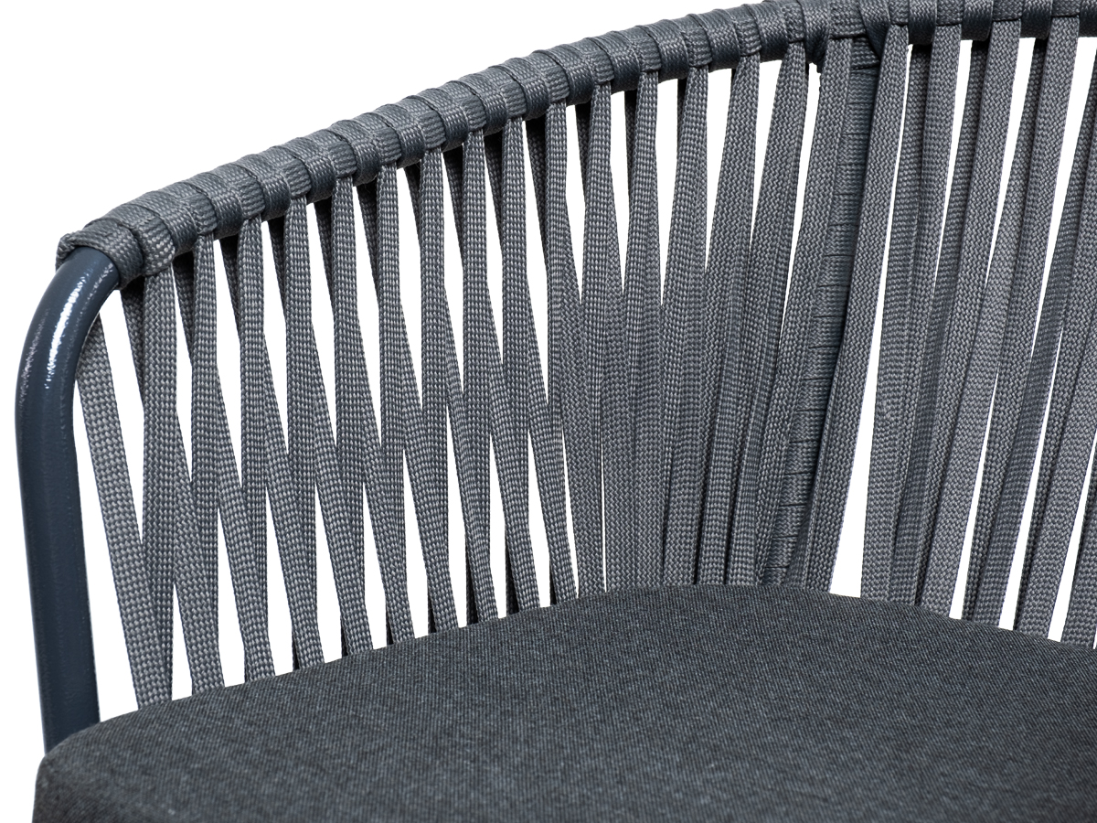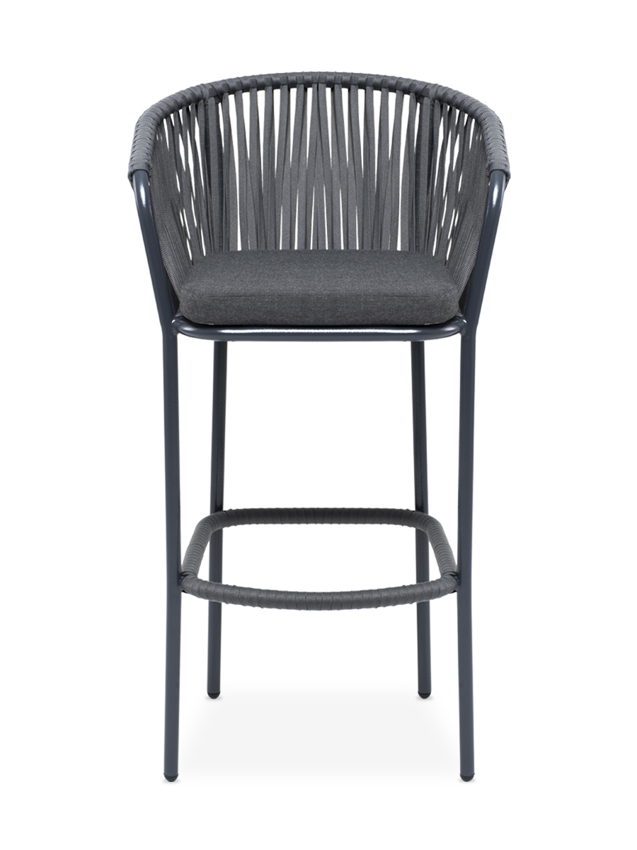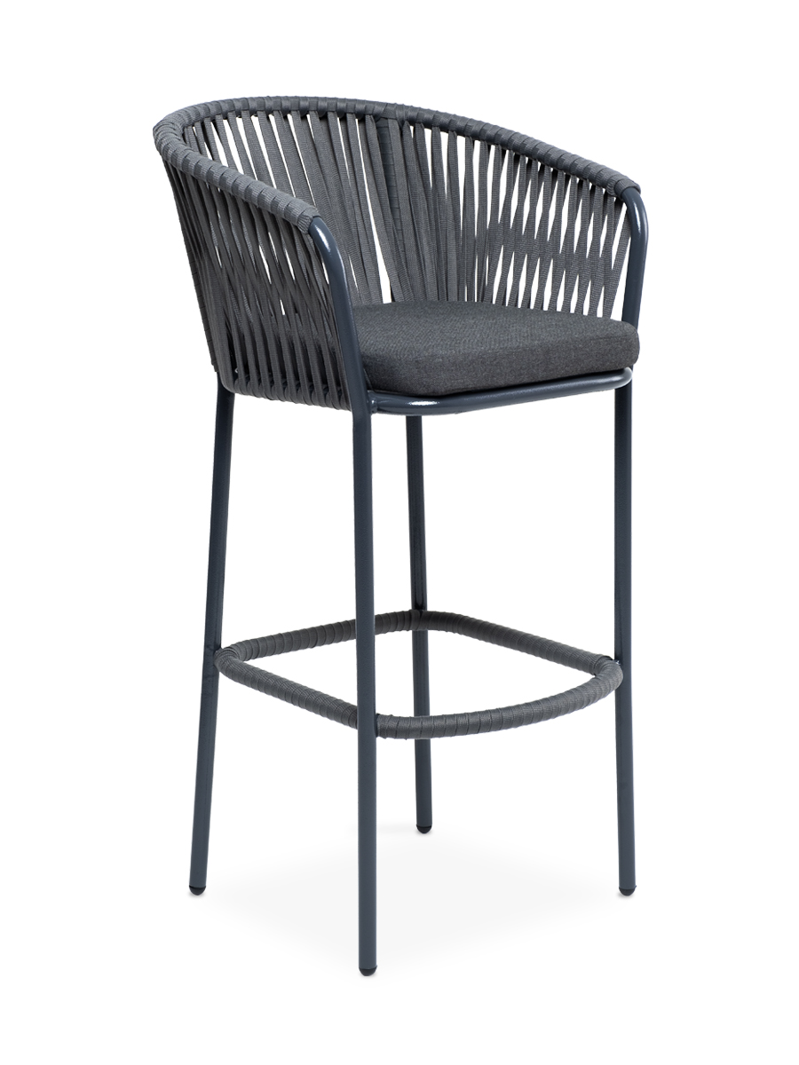 Барный стул «Бордо» представлен в стальном каркасе темно-серого цвета. Оплетен вручную эластичными синтетическими лентами из высокопрочных полиэфирных волокон серого цвета.