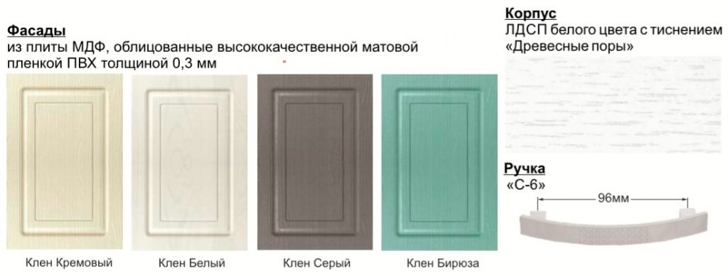 — Корпус из ЛДСП белого цвета с тиснением «Древесные поры», фасады из плиты МДФ, облицованные высококачественной матовой пленкой ПВХ толщиной 0,3 мм