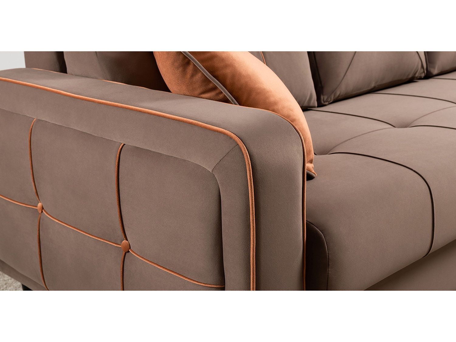 - декор Декоративные канты на подушках и вставке подлокотников. Пуговицы в местах пересечения кантов на подушке и вставке подлокотников. По торцам подлокотников и думках контрастный декоративный кант. Защипы на сиденье и средней большой подушке.