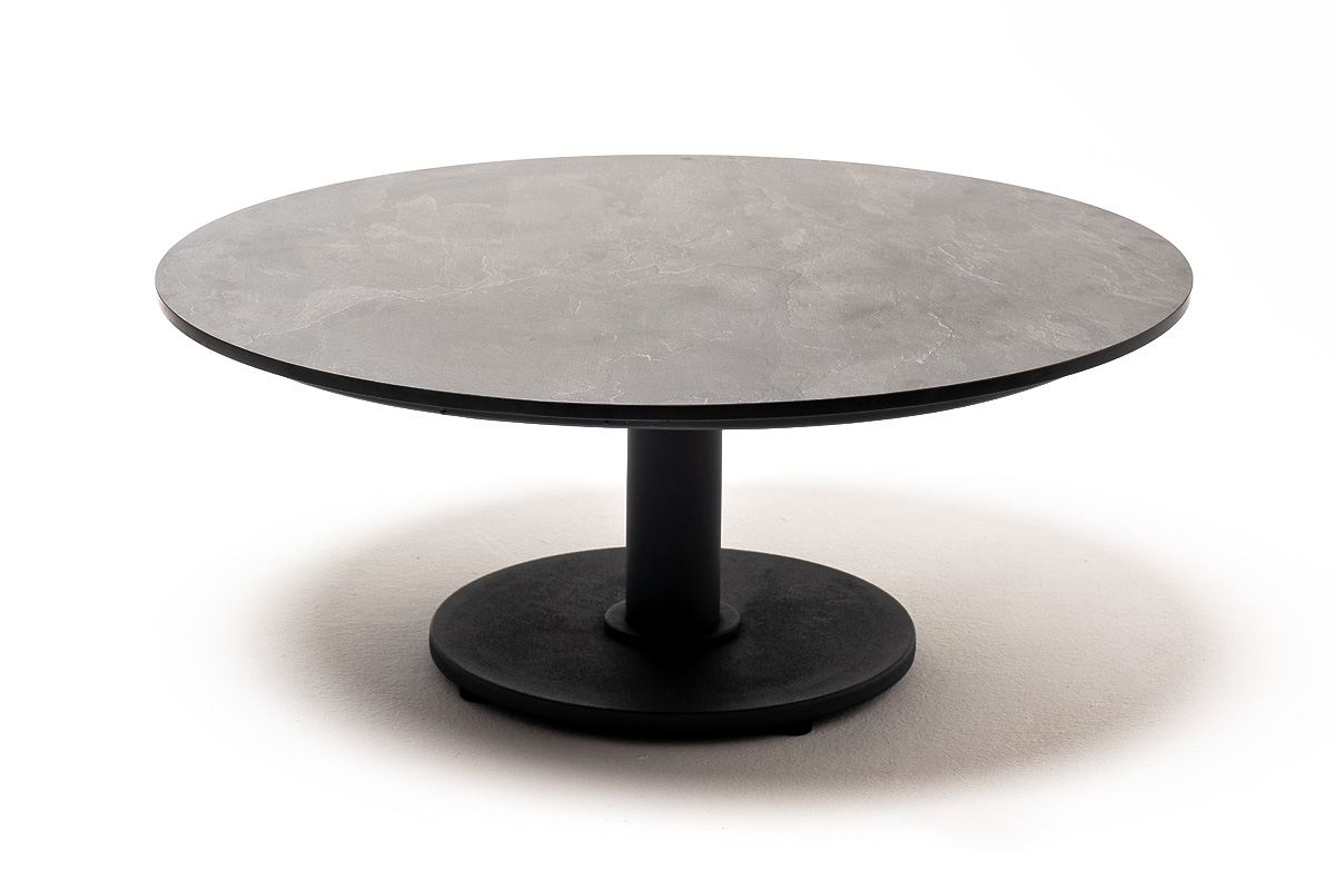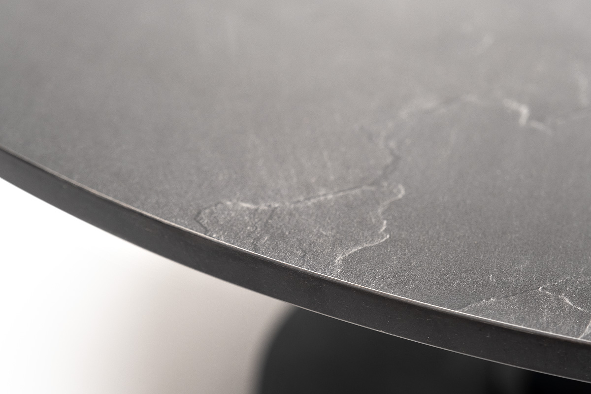 Столешница журнального столика выполнена из высококачественного монолитного компакт-пластика HPL, в цвете «серый гранит». Имеет диаметр - 80 см. Толщина HPL - 12 мм.