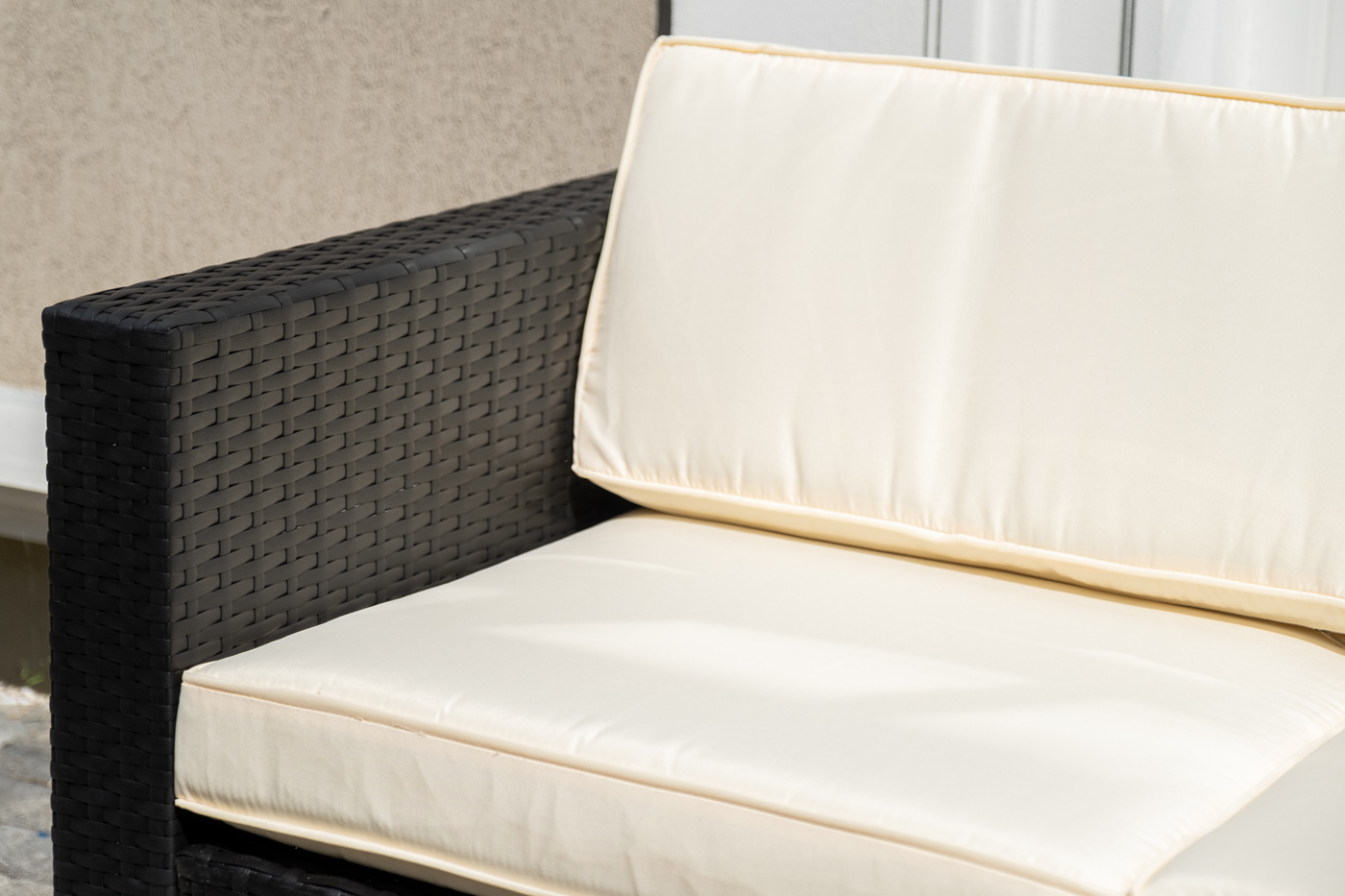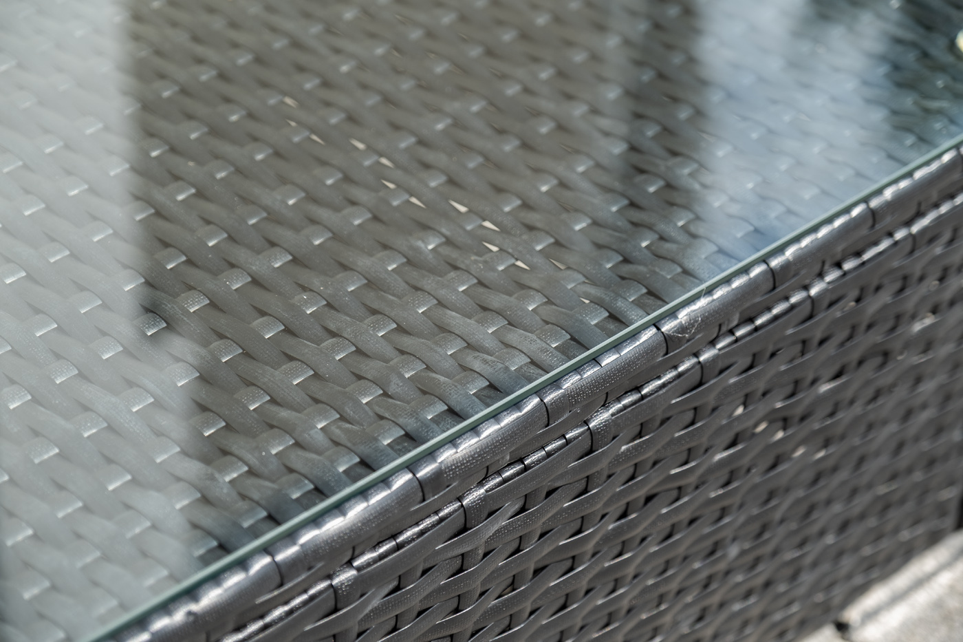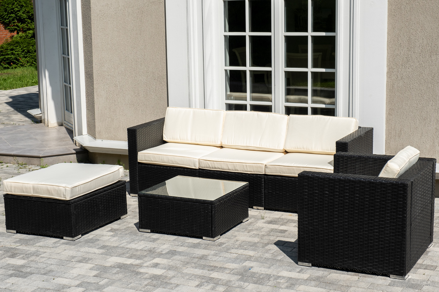 В основе мебели - стальной каркас и плоский искусственный ротанг. Каркас оплетен с помощью ручного метода и представлен в черном цвете.
