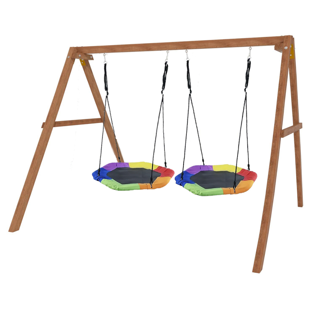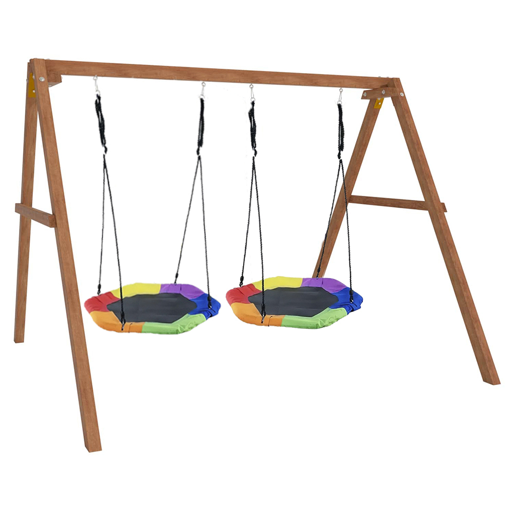 Детские игровые качели National Tree Company отлично подходят для использования на даче и во дворе частного дома, способствуют развитию координации и балансировки у детей. Такие уличные качели – это не только развлечение, но и возможность для детей развивать социальные навыки. Игры на качелях способны объединять детей, способствуя взаимодействию и коммуникации во время веселых совместных развлечений. Качели, выполненные из качественного дерева, легко вписываются в любой ландшафт и могут стать отличным дополнением к садовому дизайну. Естественные материалы устойчивы к воздействию внешней среды, что обеспечивает долгий срок службы. Все карабины и кронштейны в комплекте помогают создать надежную конструкцию. Благодаря этому, качели отличаются высокой безопасностью для малышей с разным весом. В конечном итоге, детские игровые качели – это не просто предмет для игры, а важный элемент, способствующий всестороннему развитию ребенка и укреплению семейных связей Комплектация и размеры В комплект входят: деревянный каркас, качели гнездо Гексагон - 2 шт, карабины и кронштейны. Размеры качелей составляют 2900*2700*2200 мм, а вес - 54 кг. Установка и размещение Деревянные уличные качели устанавливается в землю и не требует бетонирования. Размещается на улице, подходит для детей от 3 до 14 лет.