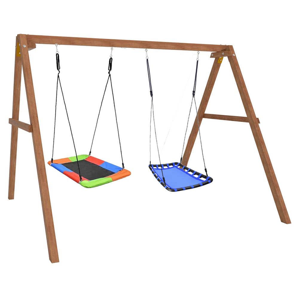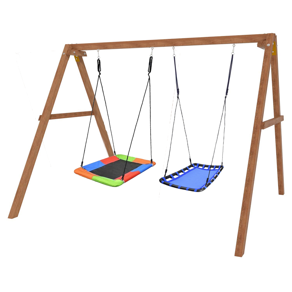 Детские игровые качели National Tree Company отлично подходят для использования на даче и во дворе частного дома, способствуют развитию координации и балансировки у детей. Такие уличные качели – это не только развлечение, но и возможность для детей развивать социальные навыки. Игры на качелях способны объединять детей, способствуя взаимодействию и коммуникации во время веселых совместных развлечений. Качели, выполненные из качественного дерева, легко вписываются в любой ландшафт и могут стать отличным дополнением к садовому дизайну. Естественные материалы устойчивы к воздействию внешней среды, что обеспечивает долгий срок службы. Все карабины и кронштейны в комплекте помогают создать надежную конструкцию. Благодаря этому, качели отличаются высокой безопасностью для малышей с разным весом. В конечном итоге, детские игровые качели – это не просто предмет для игры, а важный элемент, способствующий всестороннему развитию ребенка и укреплению семейных связей Комплектация и размеры В комплект входят: деревянный каркас, качели гнездо лодка разноцветное - 2 шт, карабины и кронштейны. Размеры качелей составляют 2900*2700*2200 мм, а вес - 54 кг. Установка и размещение Деревянные уличные качели устанавливается в землю и не требует бетонирования. Размещается на улице, подходит для детей от 3 до 14 лет.