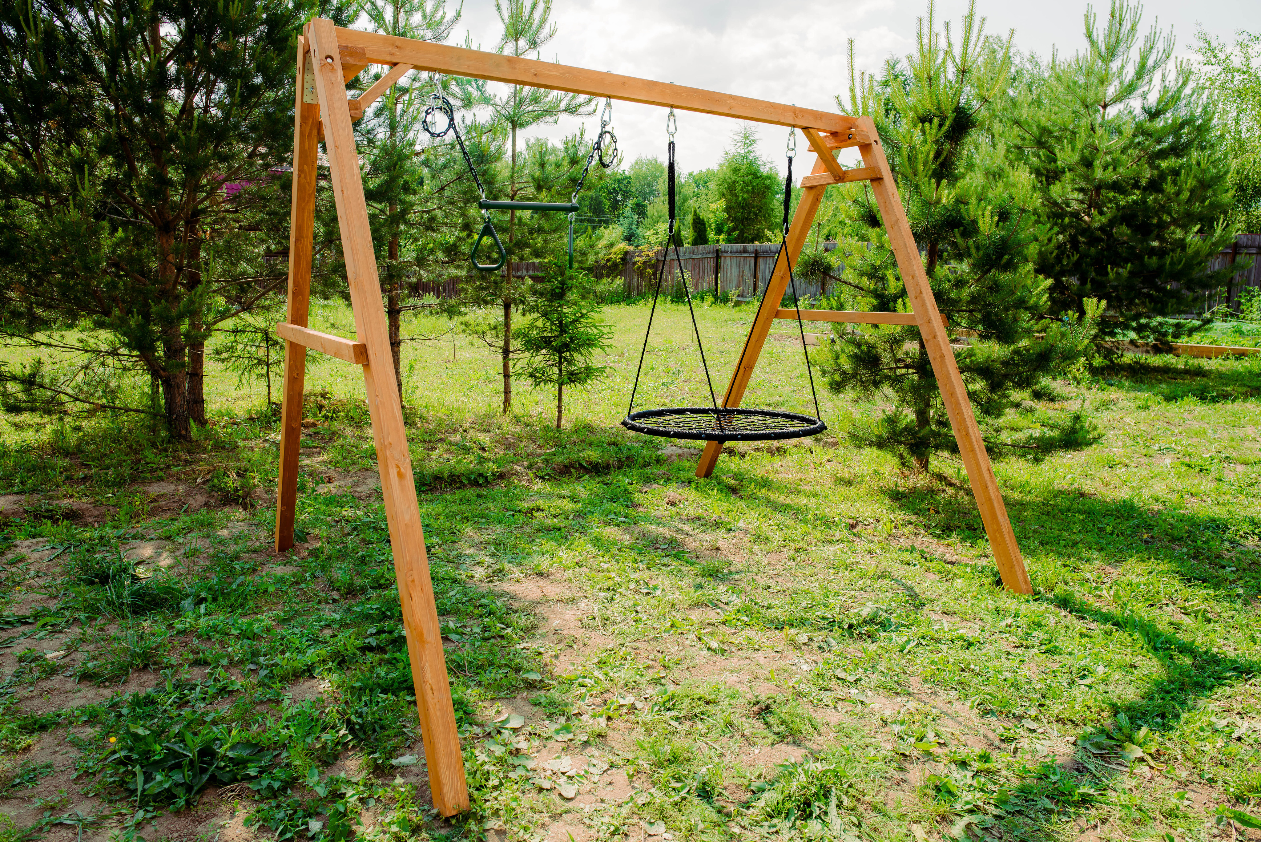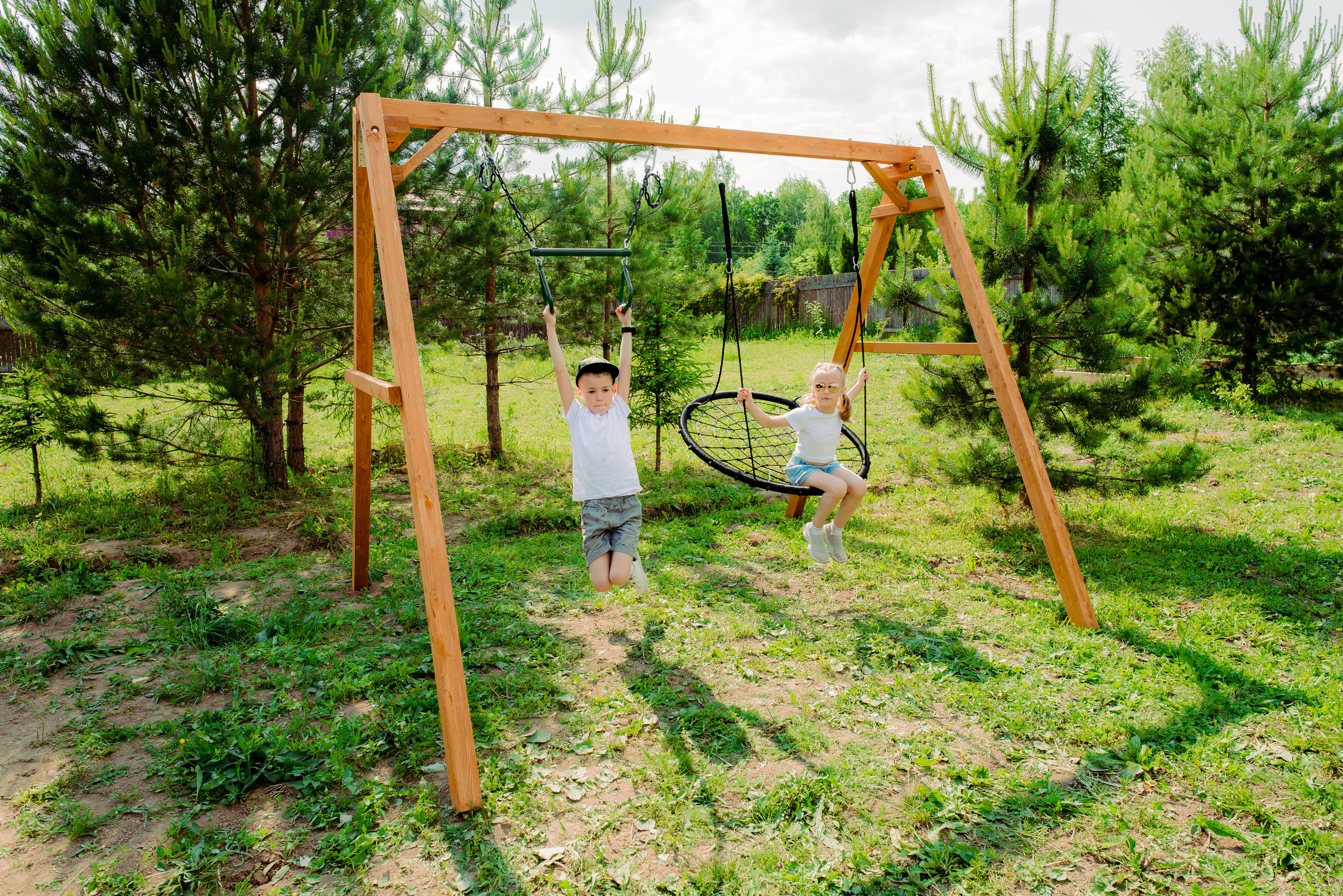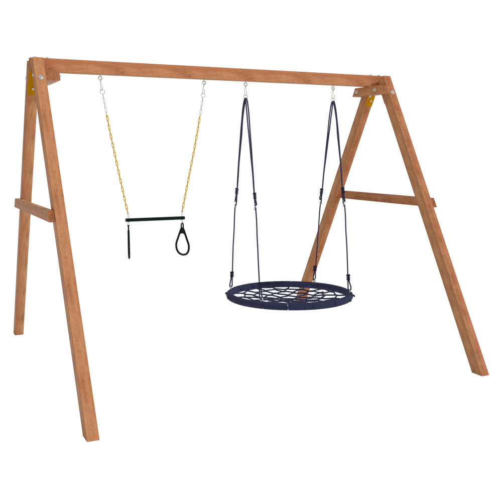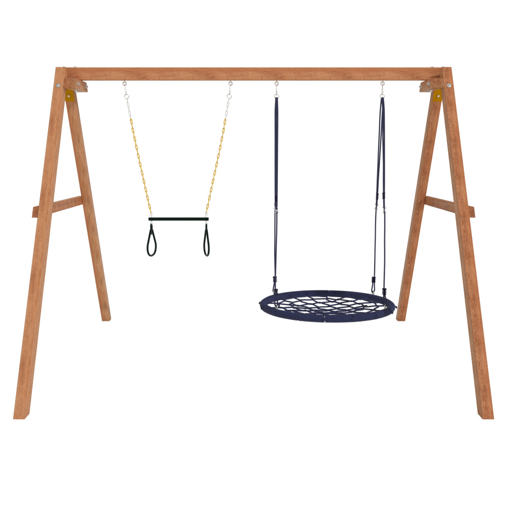 Детские игровые качели National Tree Company отлично подходят для использования на даче и во дворе частного дома, способствуют развитию координации и балансировки у детей. Такие уличные качели – это не только развлечение, но и возможность для детей развивать социальные навыки. Игры на качелях способны объединять детей, способствуя взаимодействию и коммуникации во время веселых совместных развлечений. Качели, выполненные из качественного дерева, легко вписываются в любой ландшафт и могут стать отличным дополнением к садовому дизайну. Естественные материалы устойчивы к воздействию внешней среды, что обеспечивает долгий срок службы. Все карабины и кронштейны в комплекте помогают создать надежную конструкцию. Благодаря этому, качели отличаются высокой безопасностью для малышей с разным весом. В конечном итоге, детские игровые качели – это не просто предмет для игры, а важный элемент, способствующий всестороннему развитию ребенка и укреплению семейных связей Комплектация и размеры В комплект входят: деревянный каркас, качели трапеция- 1 шт, качели гнездо 1 шт, карабины и кронштейны. Размеры качелей составляют 2900*2700*2200 мм, а вес - 54 кг. Установка и размещение Деревянные уличные качели устанавливается в землю и не требует бетонирования. Размещается на улице, подходит для детей от 3 до 14 лет.