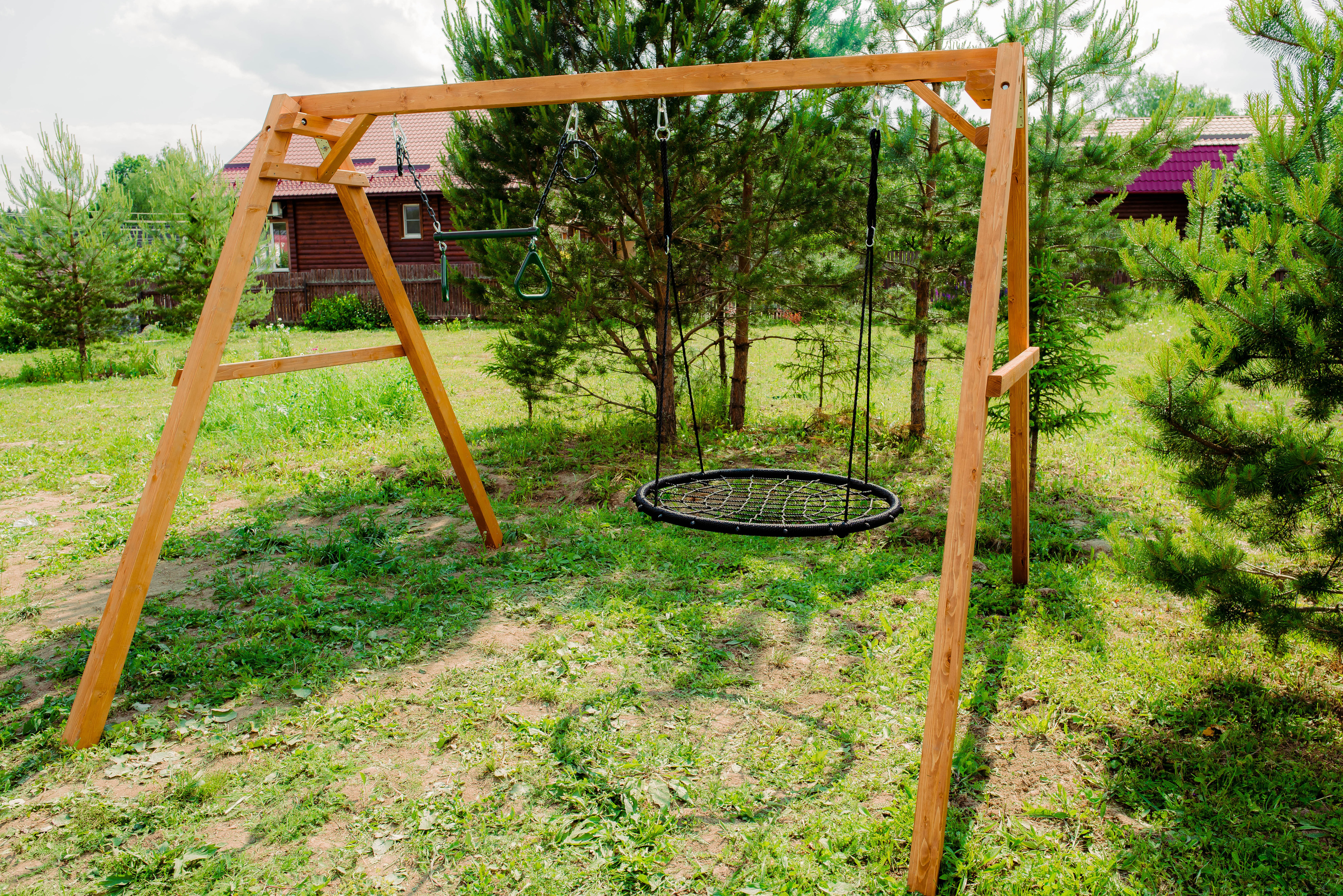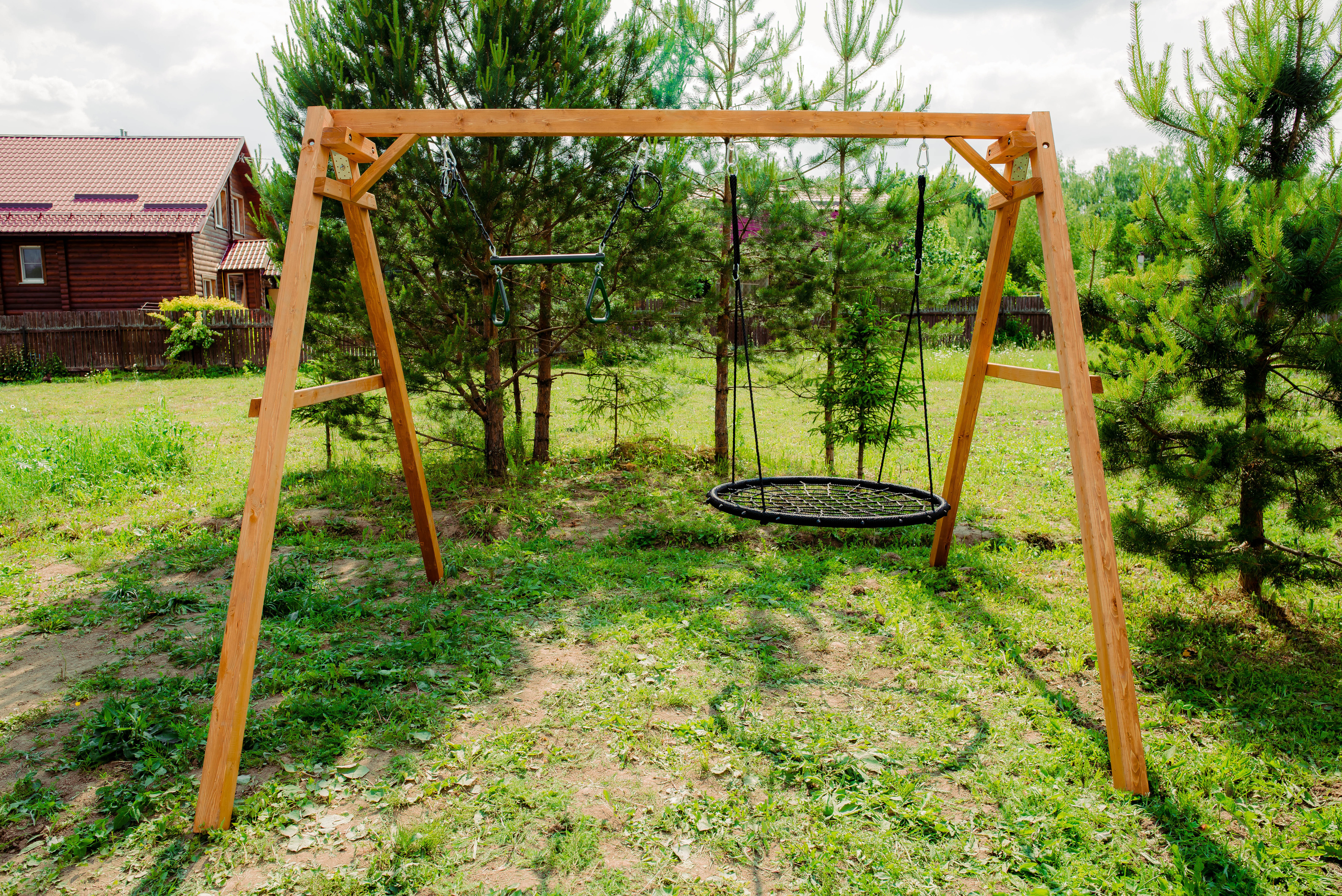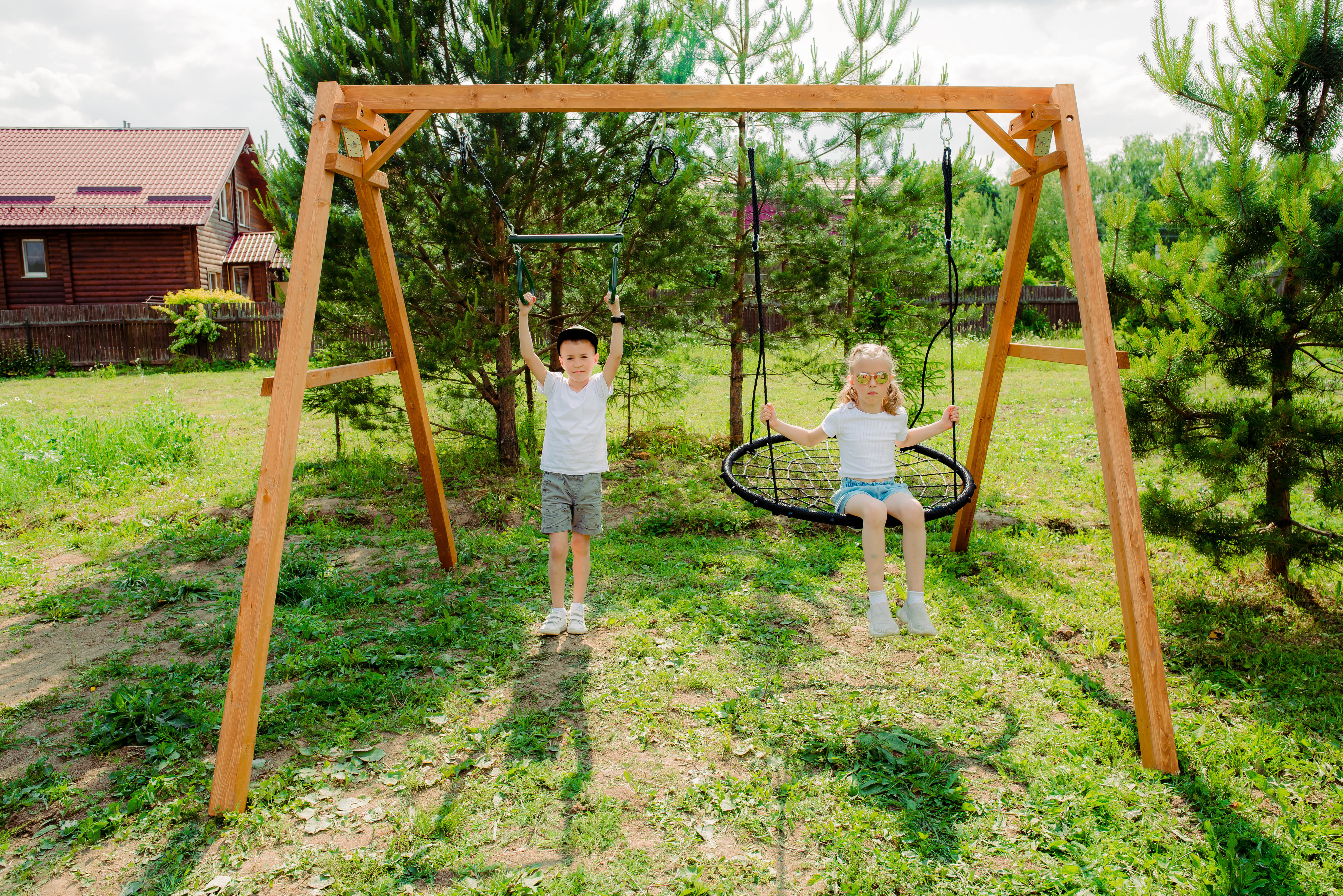 Детские игровые качели National Tree Company отлично подходят для использования на даче и во дворе частного дома, способствуют развитию координации и балансировки у детей. Такие уличные качели – это не только развлечение, но и возможность для детей развивать социальные навыки. Игры на качелях способны объединять детей, способствуя взаимодействию и коммуникации во время веселых совместных развлечений. Качели, выполненные из качественного дерева, легко вписываются в любой ландшафт и могут стать отличным дополнением к садовому дизайну. Естественные материалы устойчивы к воздействию внешней среды, что обеспечивает долгий срок службы. Все карабины и кронштейны в комплекте помогают создать надежную конструкцию. Благодаря этому, качели отличаются высокой безопасностью для малышей с разным весом. В конечном итоге, детские игровые качели – это не просто предмет для игры, а важный элемент, способствующий всестороннему развитию ребенка и укреплению семейных связей Комплектация и размеры В комплект входят: деревянный каркас, качели трапеция- 1 шт, качели гнездо 1 шт, карабины и кронштейны. Размеры качелей составляют 2900*2700*2200 мм, а вес - 54 кг. Установка и размещение Деревянные уличные качели устанавливается в землю и не требует бетонирования. Размещается на улице, подходит для детей от 3 до 14 лет.