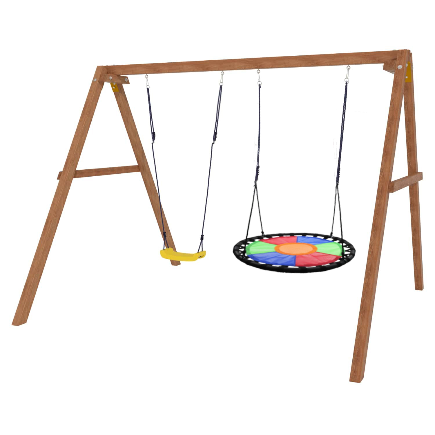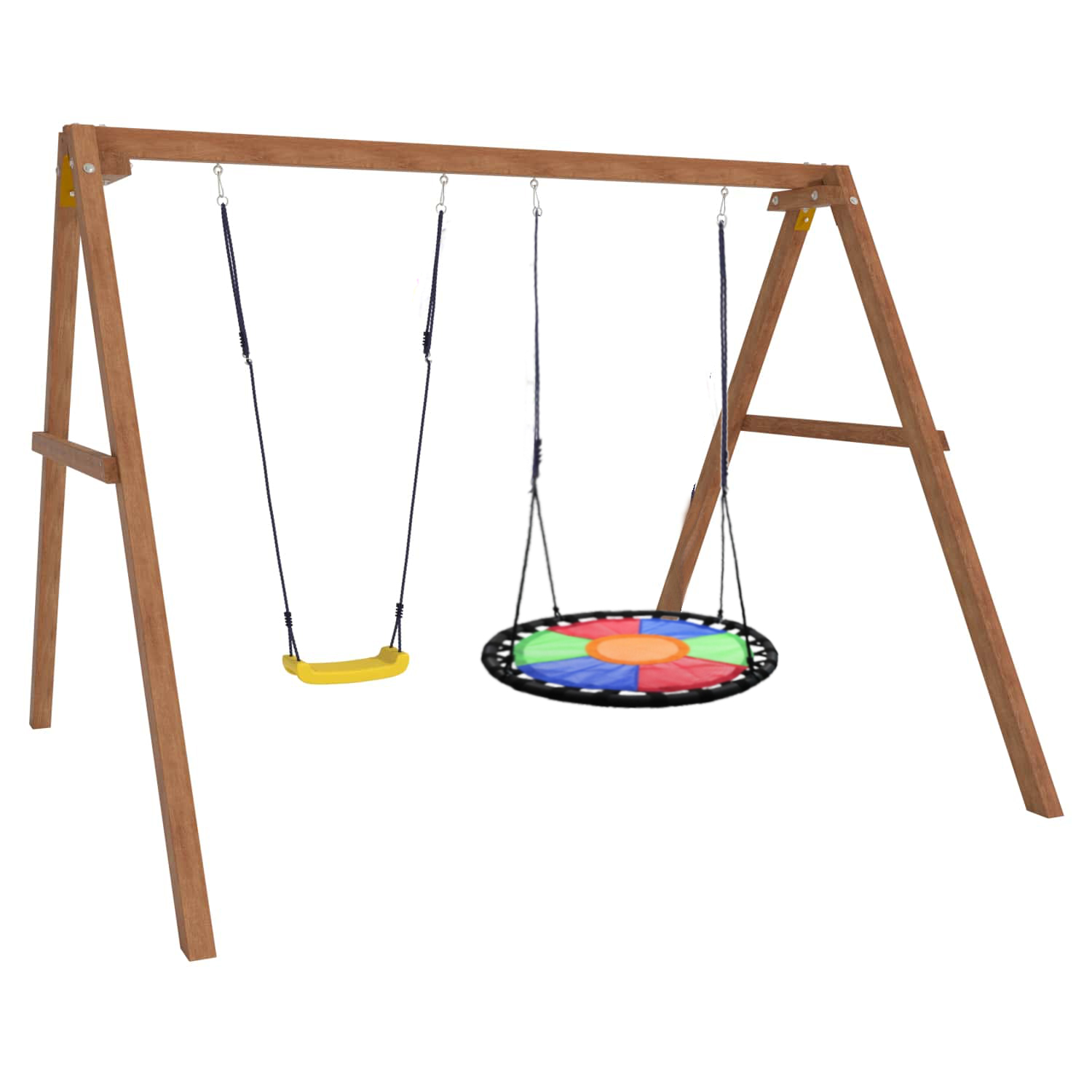 Детские игровые качели National Tree Company отлично подходят для использования на даче и во дворе частного дома, способствуют развитию координации и балансировки у детей. Такие уличные качели – это не только развлечение, но и возможность для детей развивать социальные навыки. Игры на качелях способны объединять детей, способствуя взаимодействию и коммуникации во время веселых совместных развлечений. Качели, выполненные из качественного дерева, легко вписываются в любой ландшафт и могут стать отличным дополнением к садовому дизайну. Естественные материалы устойчивы к воздействию внешней среды, что обеспечивает долгий срок службы. Все карабины и кронштейны в комплекте помогают создать надежную конструкцию. Благодаря этому, качели отличаются высокой безопасностью для малышей с разным весом. В конечном итоге, детские игровые качели – это не просто предмет для игры, а важный элемент, способствующий всестороннему развитию ребенка и укреплению семейных связей Комплектация и размеры В комплект входят: деревянный каркас, качели лодочка - 1 шт, качели гнездо Свиби разноцветное - 1 шт, карабины и кронштейны. Размеры качелей составляют 2900*2700*2200 мм, а вес - 54 кг. Установка и размещение Деревянные уличные качели устанавливается в землю и не требует бетонирования. Размещается на улице, подходит для детей от 3 до 14 лет.