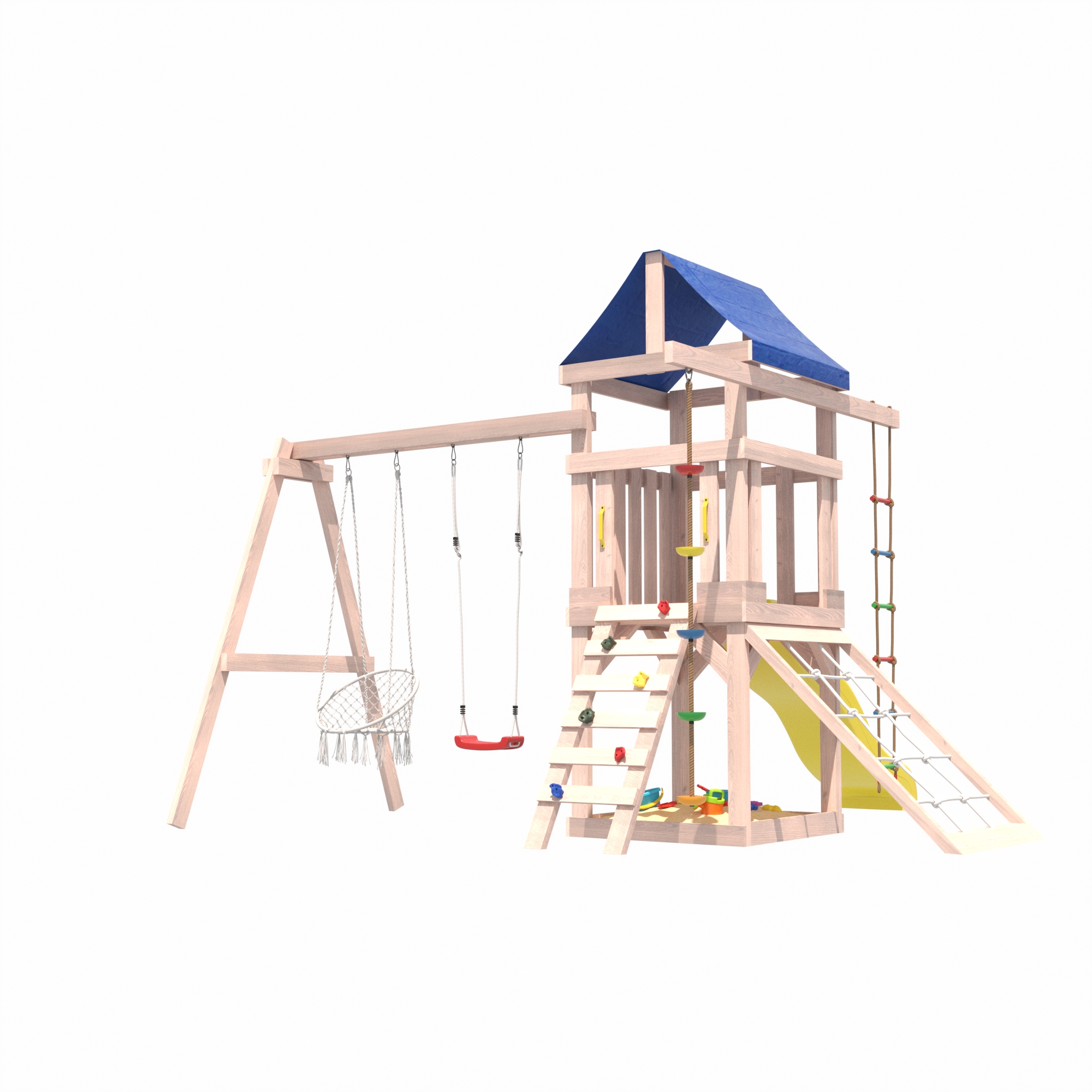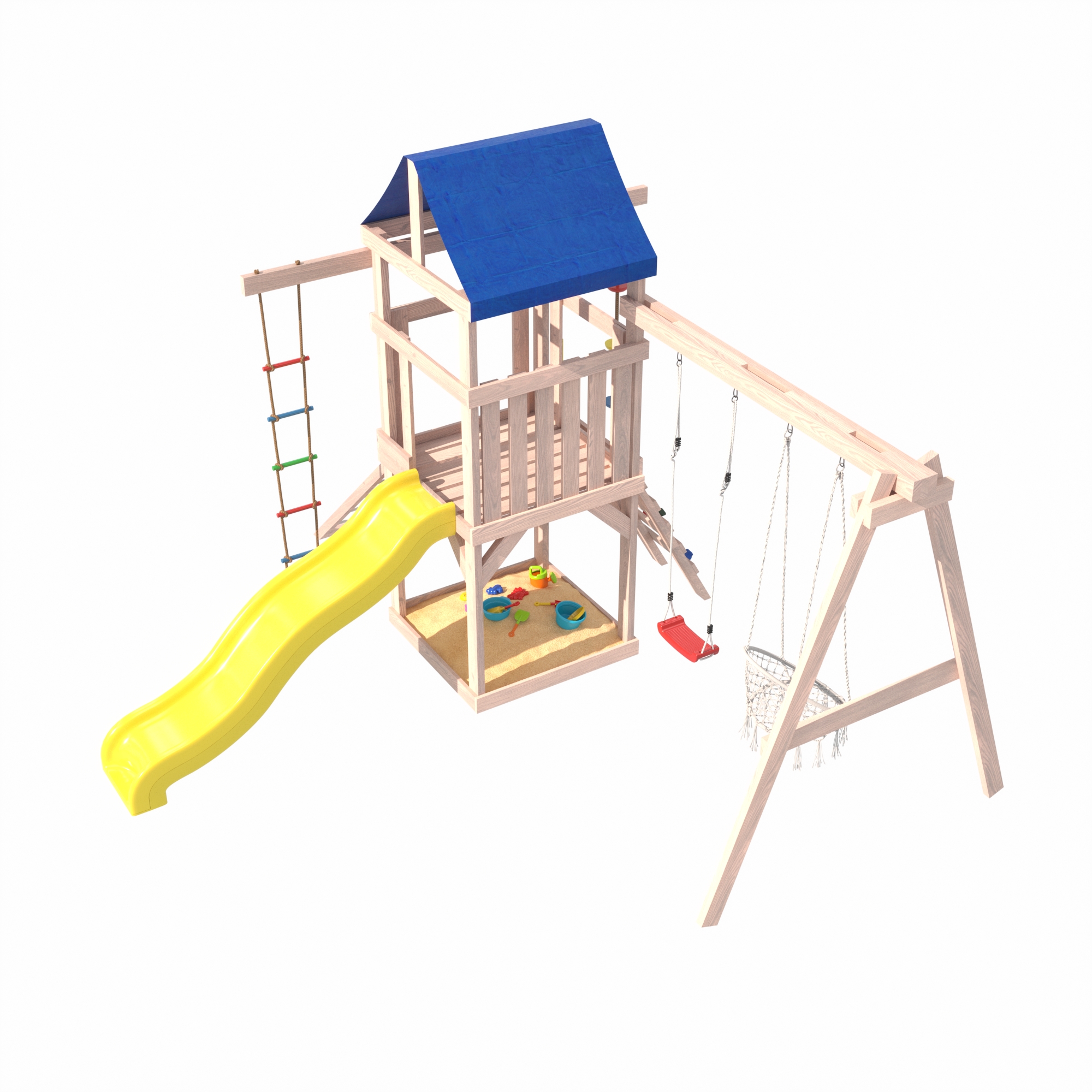 Песочница под башней становится отличным местом для творческих игр, а подвесные качели приносят ощущение свободы и радости, позволяя детям весело проводить время на свежем воздухе.Веревочная лестница и канат добавят элемент приключения и помогут развить физическую силу и ловкость у детей. Приставная сетка станет отличной базой для веселых игр и забав, позволяя детям фантазировать и создавать собственные миры.