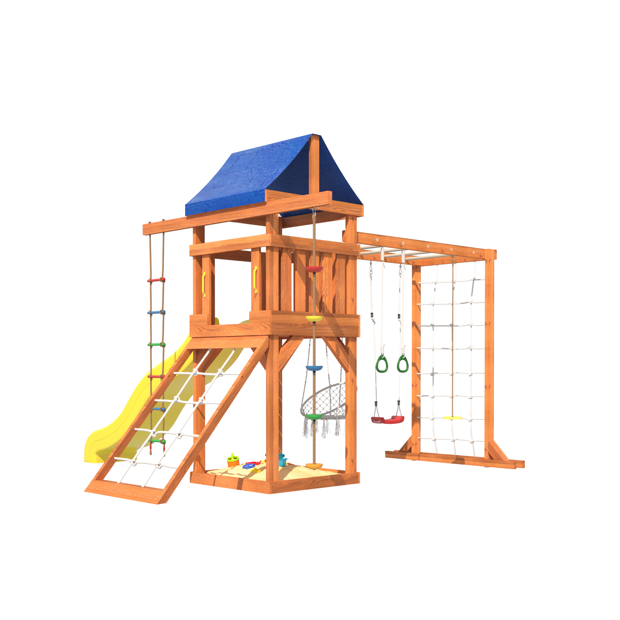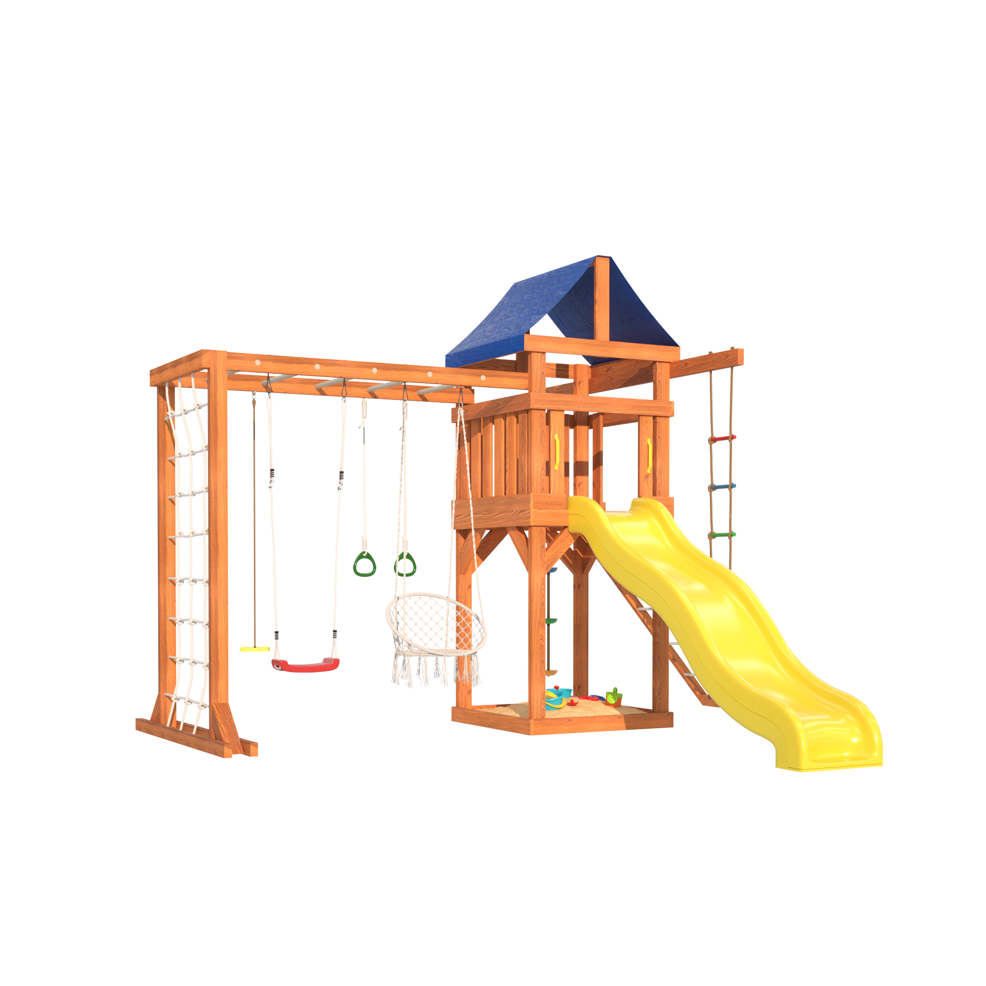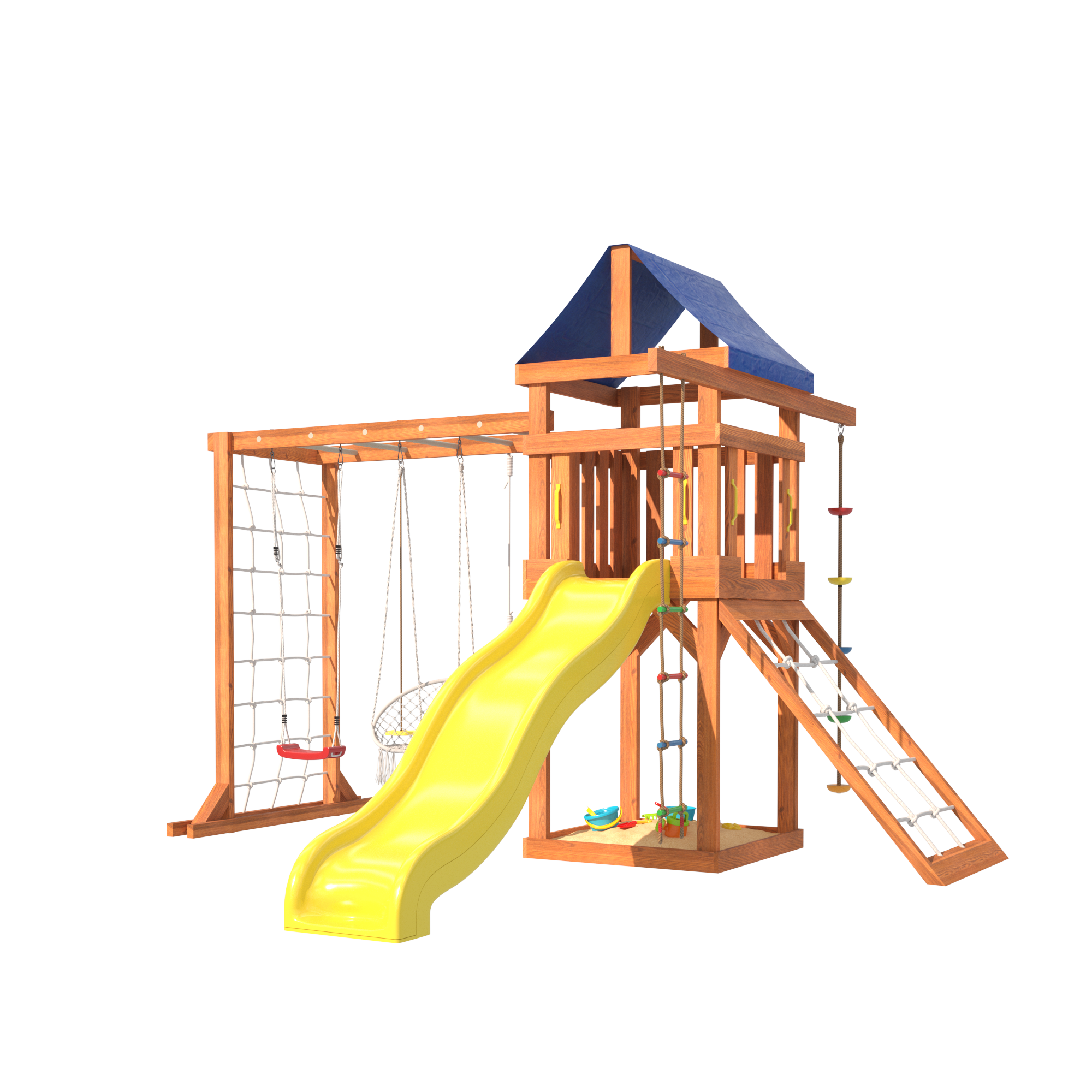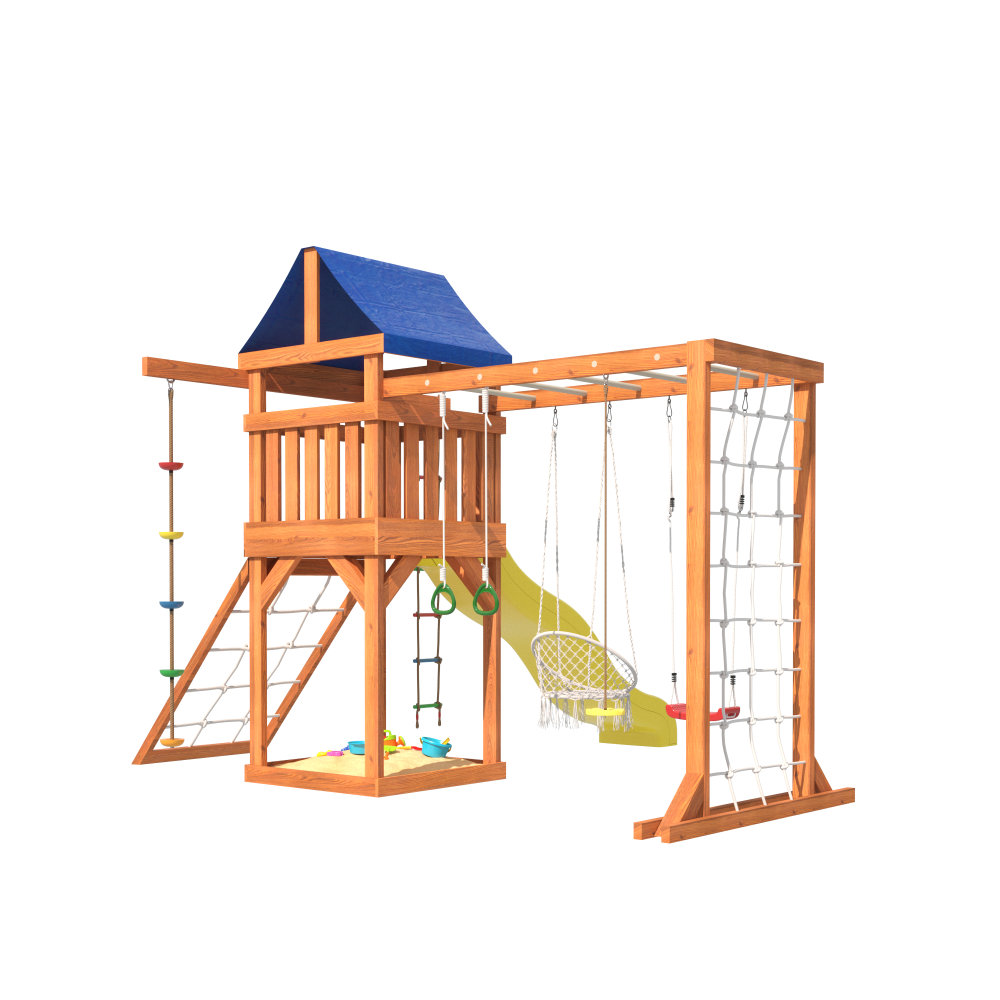 Сетчатая стенка позволяет детям лазить и играть, как настоящие альпинисты. В то время как качели в форме лодочки дарят ощущение свободы и полета, поднимая настроение и создавая атмосферу радости. Подвесное плетеное кресло – это идеальное место для спокойного отдыха, где ребенок сможет почитать книгу или просто пофантазировать.