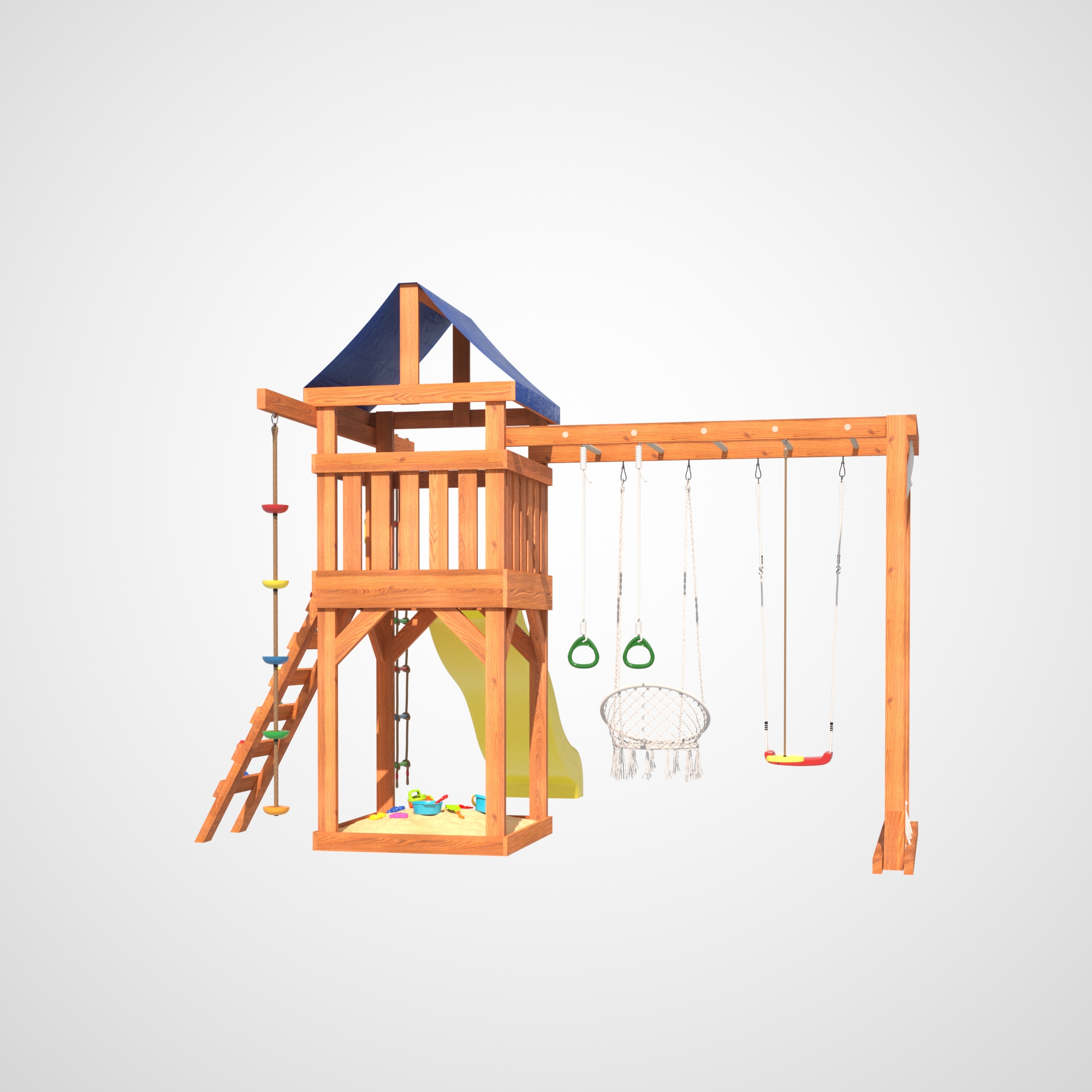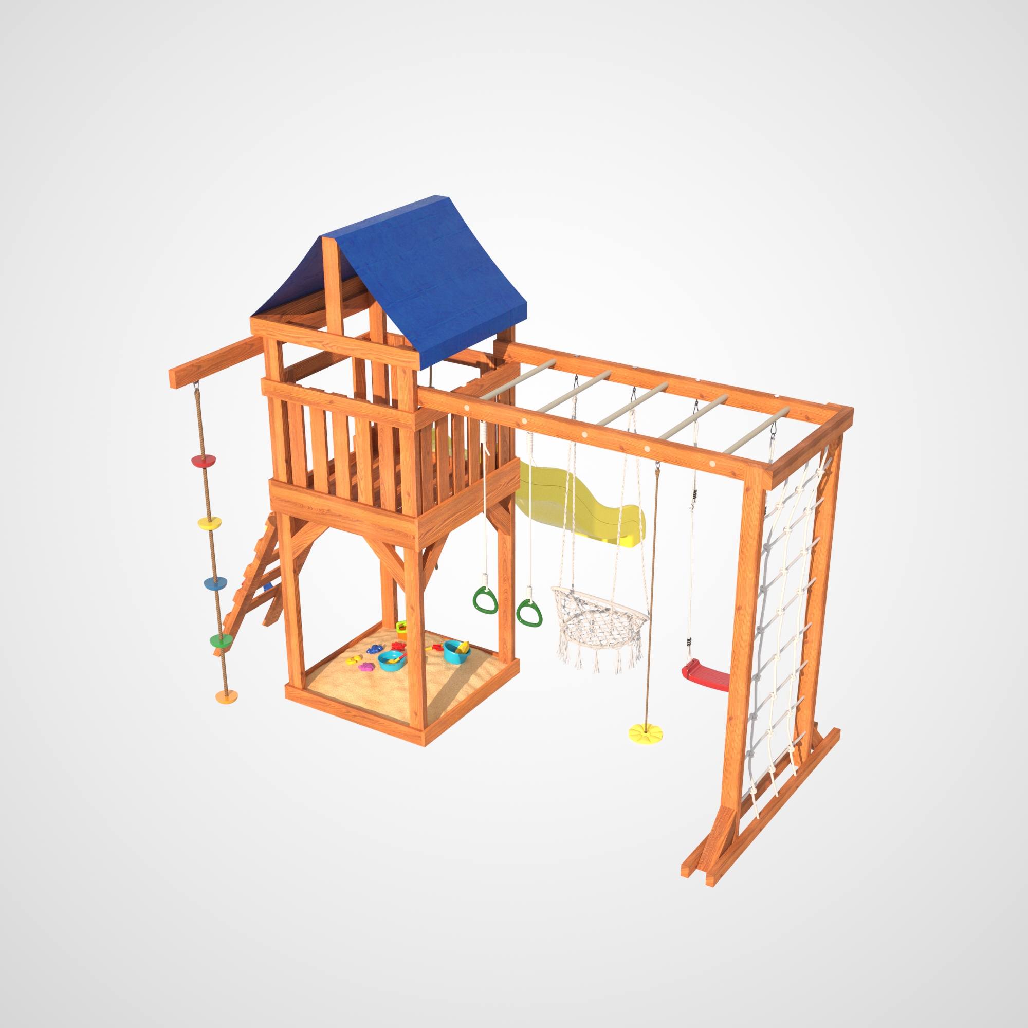 Сетчатая стенка позволяет детям лазить и играть, как настоящие альпинисты. В то время как качели в форме лодочки дарят ощущение свободы и полета, поднимая настроение и создавая атмосферу радости. Подвесное плетеное кресло – это идеальное место для спокойного отдыха, где ребенок сможет почитать книгу или просто пофантазировать.