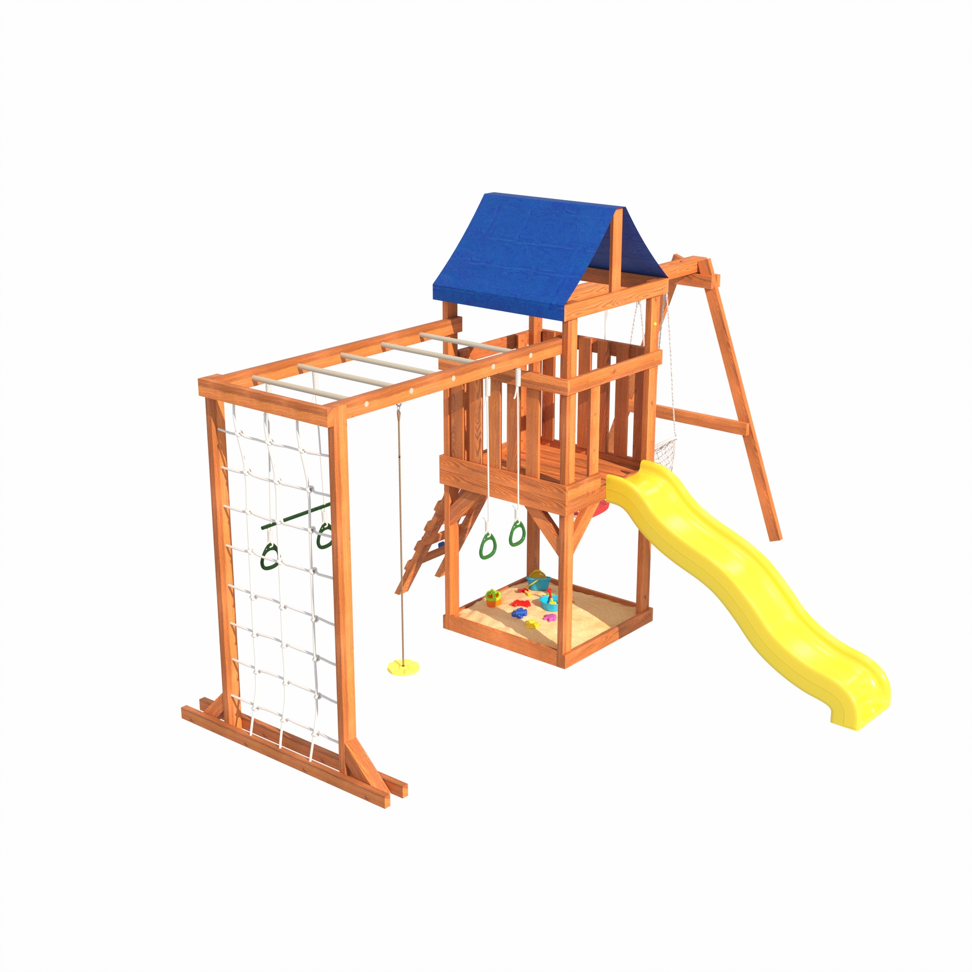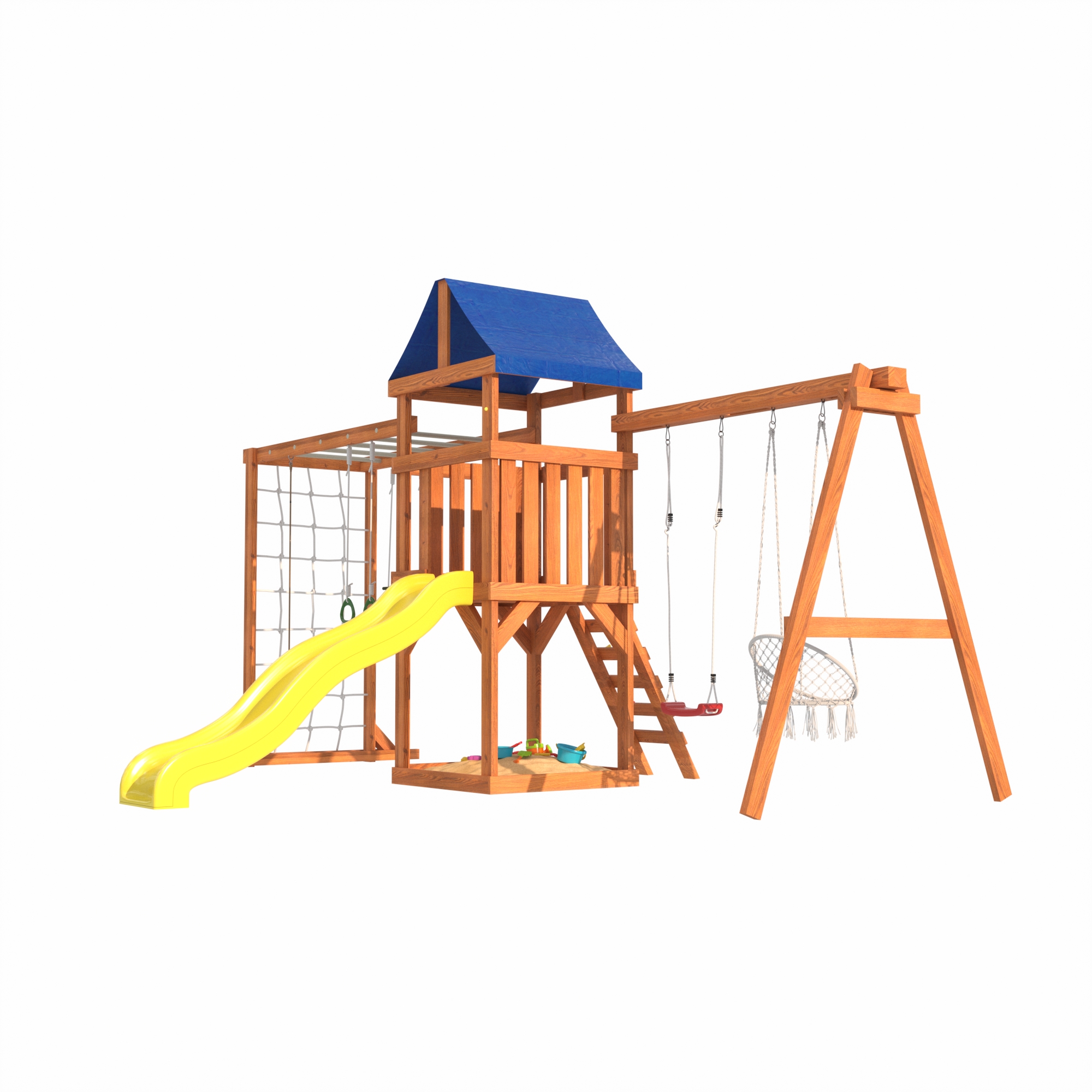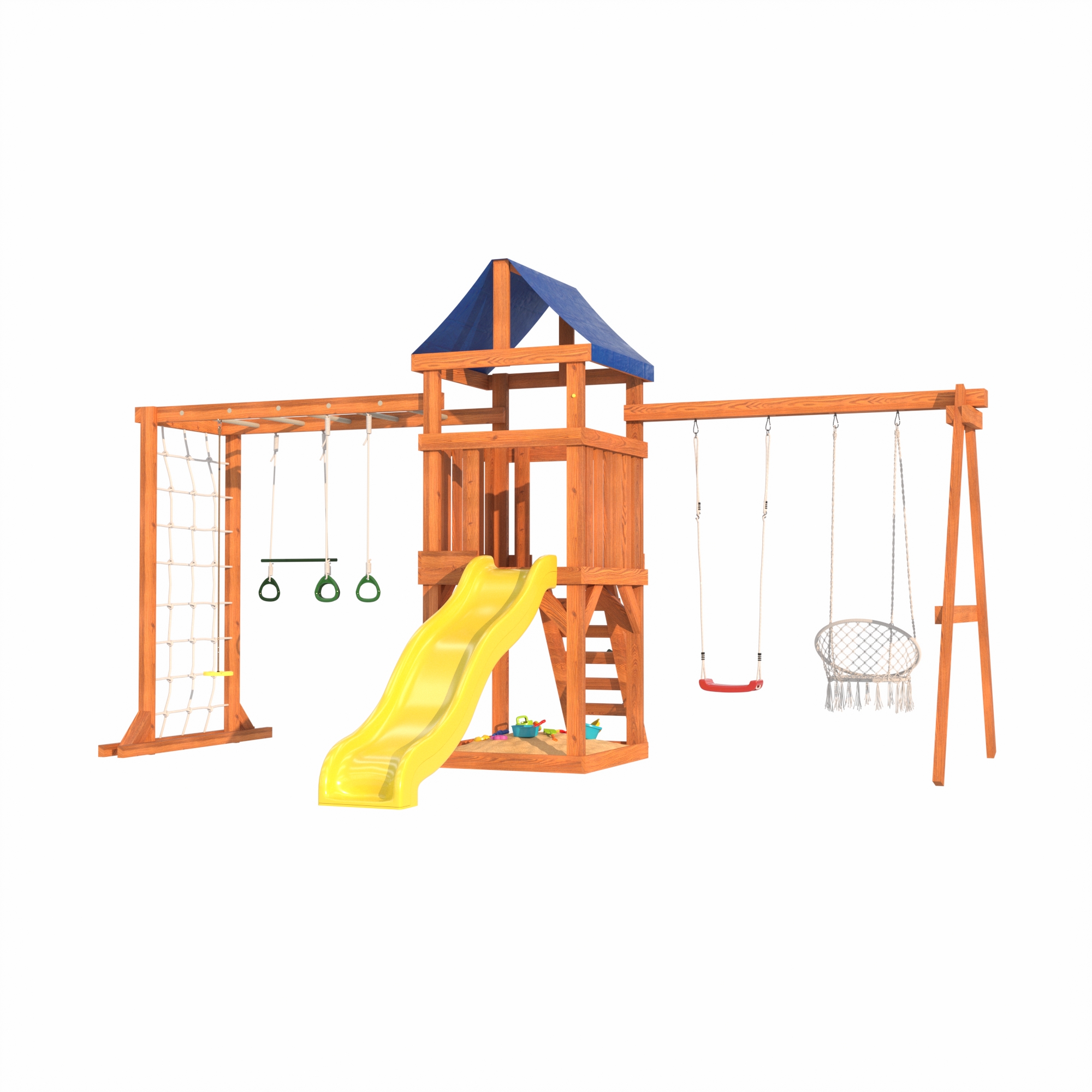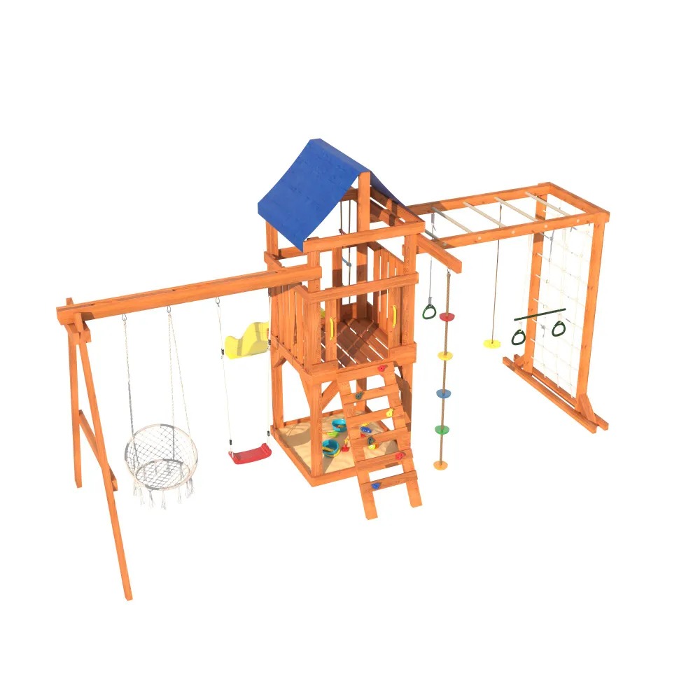 Сетчатая стенка позволяет детям лазить и играть, как настоящие альпинисты. В то время как качели в форме лодочки дарят ощущение свободы и полета, поднимая настроение и создавая атмосферу радости. Подвесное плетеное кресло – это идеальное место для спокойного отдыха, где ребенок сможет почитать книгу или просто пофантазировать.
