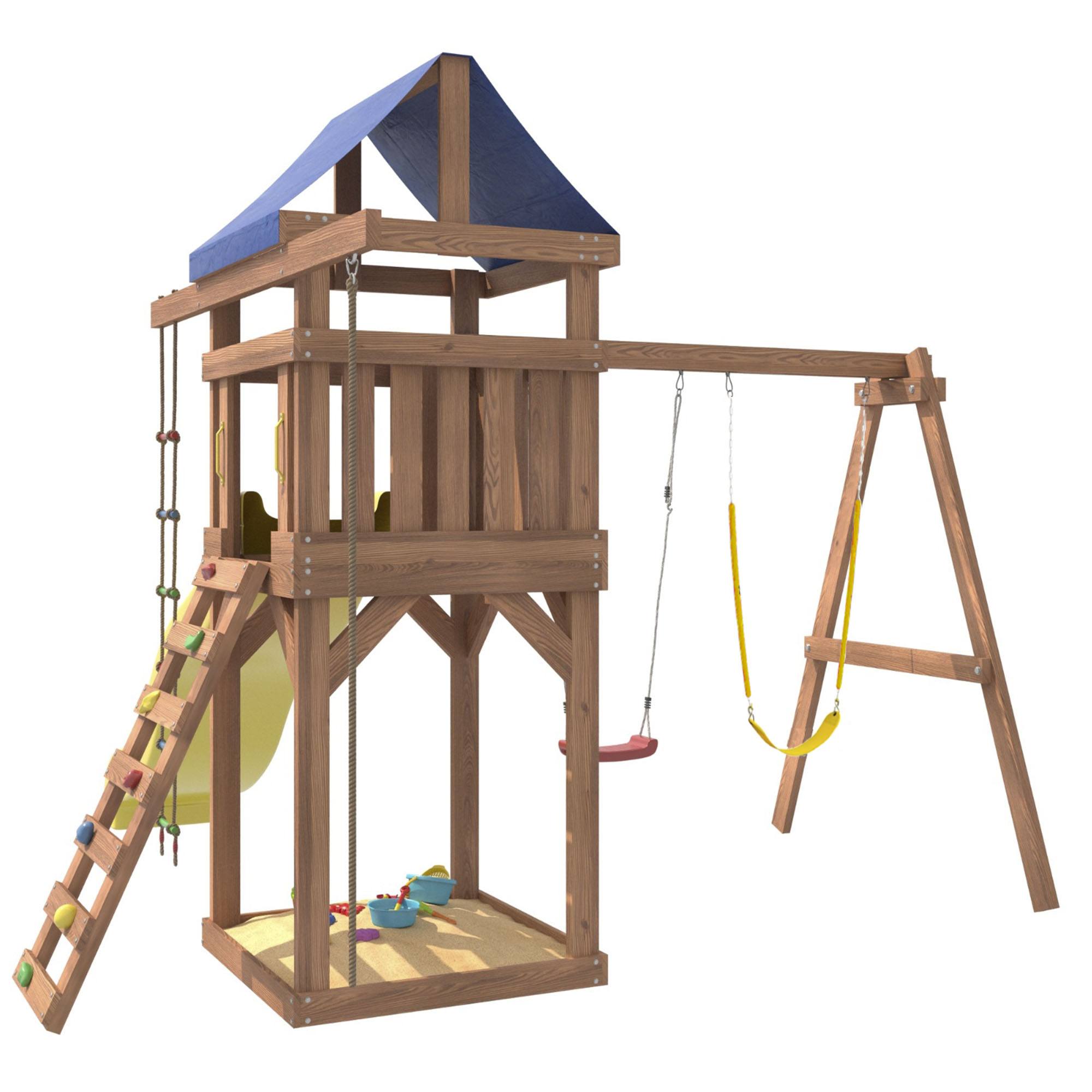 Площадка изготавливается из лесоматериалов лиственных и хвойных пород. Материал имеет естественную древесную текстуру, обработан специальными составами для большего срока использования и предохранения от разрушения древесины. Все элементы проходят предварительную шлифовку, а края изделия закруглены. Небольшое количество металлических элементов значительно исключает возможность получения ребенком травм.