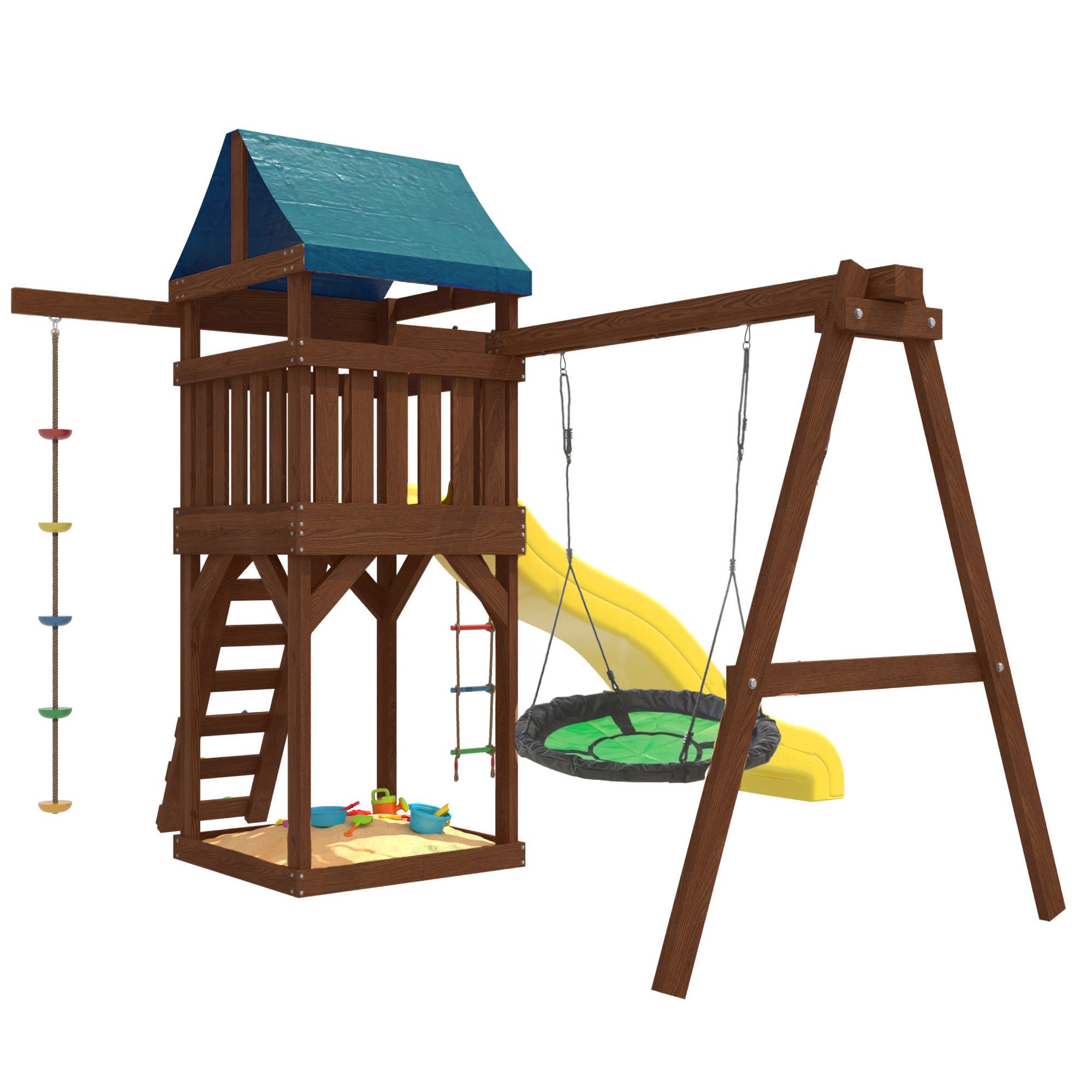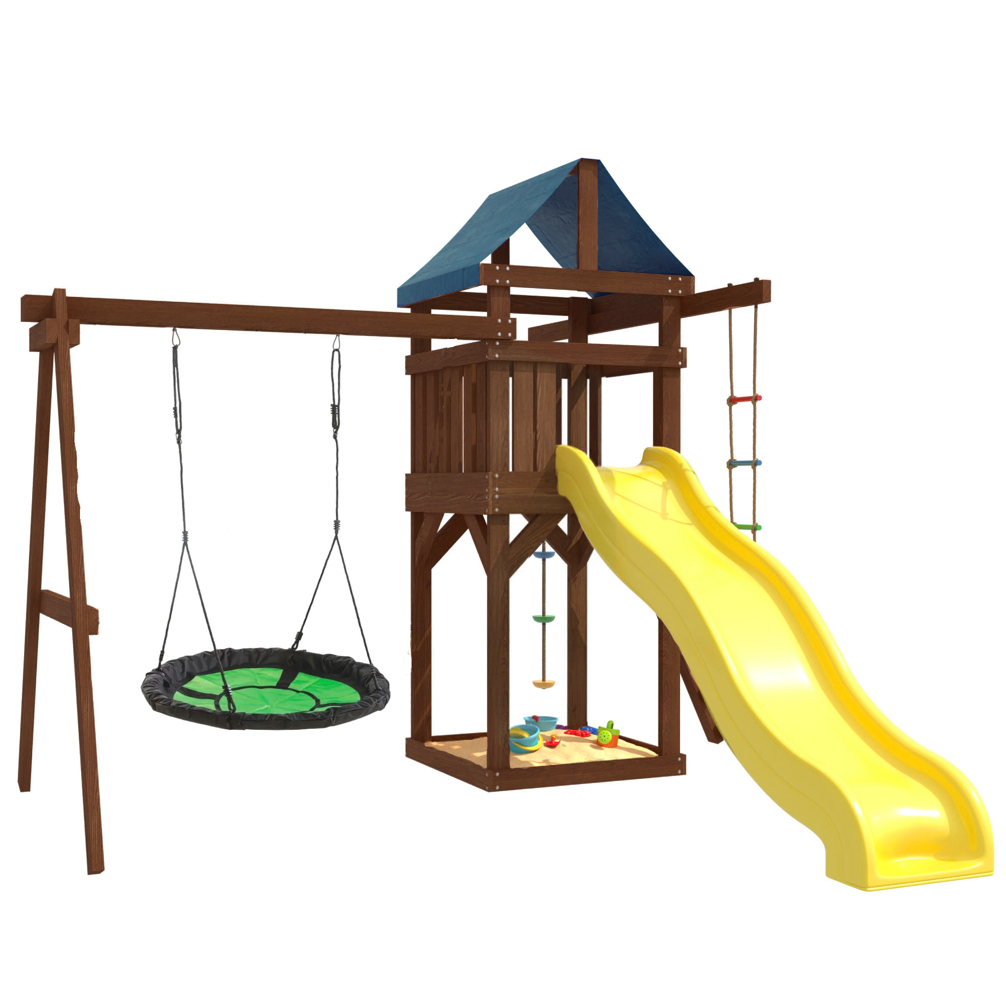 Площадка изготавливается из лесоматериалов лиственных и хвойных пород. Материал имеет естественную древесную текстуру, обработан специальными составами для большего срока использования и предохранения от разрушения древесины. Все элементы проходят предварительную шлифовку, а края изделия закруглены. Небольшое количество металлических элементов значительно исключает возможность получения ребенком травм.