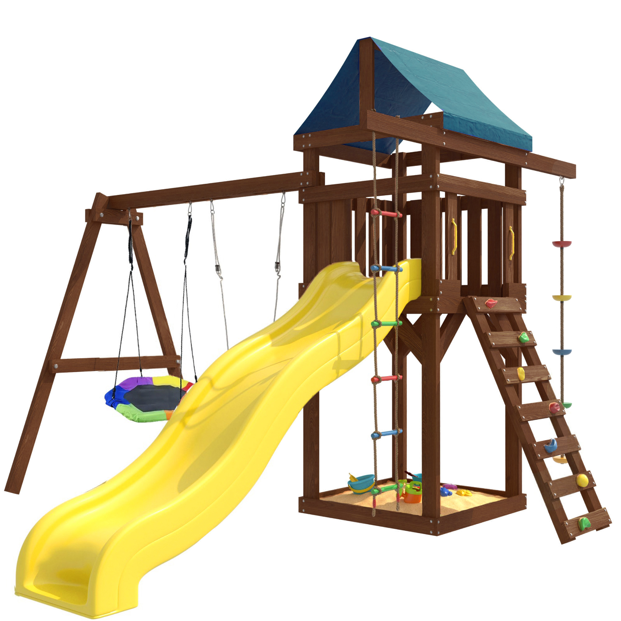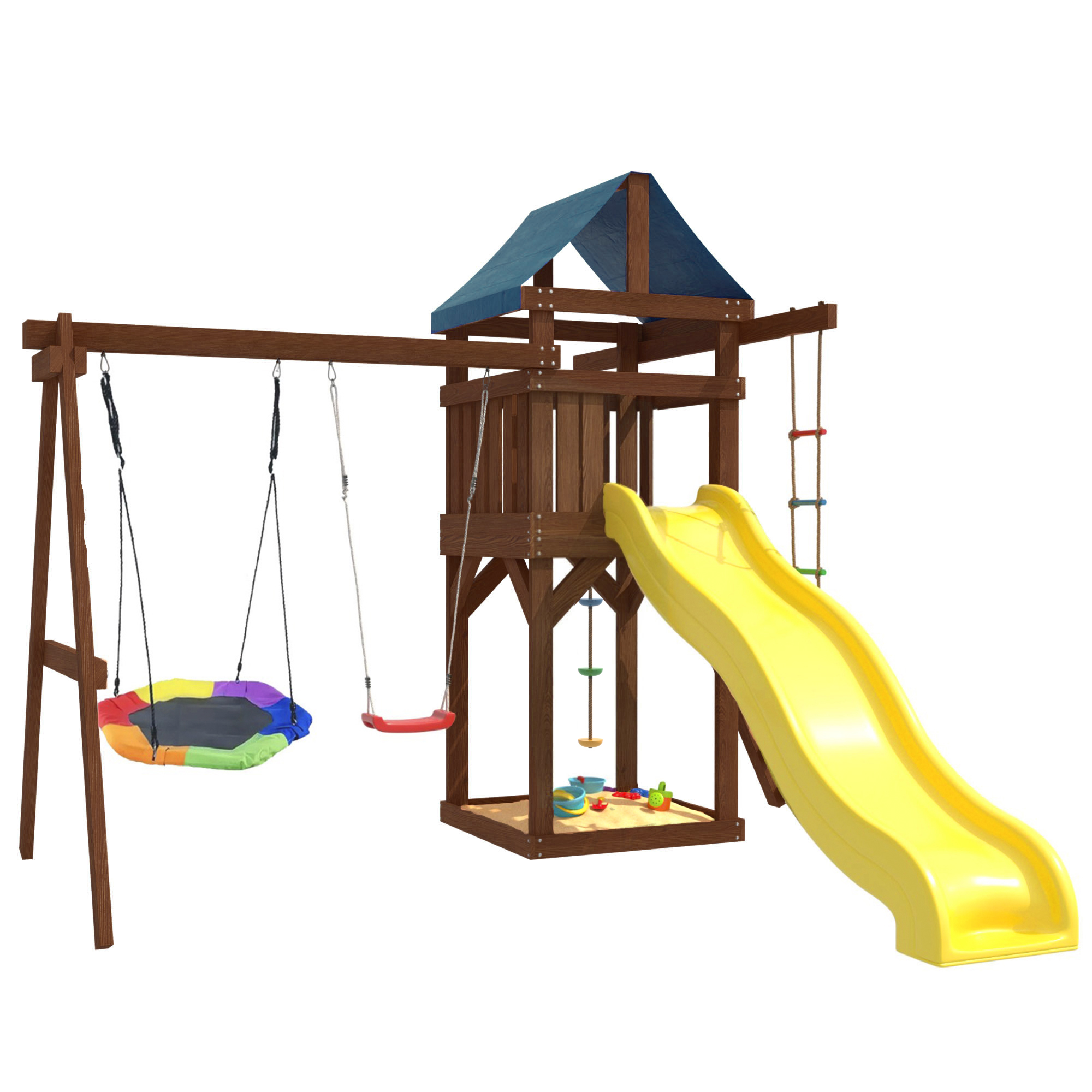 Детская площадка IgroWoods - отличное решение для активного отдыха детей на свежем воздухе. Она представляет собой многофункциональный игровой комплекс, который включает в себя горку, качели, песочницу, игровую веранду, веревочную лестницу, скалодром и канат. Все элементы выполнены из качественных и безопасных материалов, что обеспечивает долговечность и надежность конструкции.