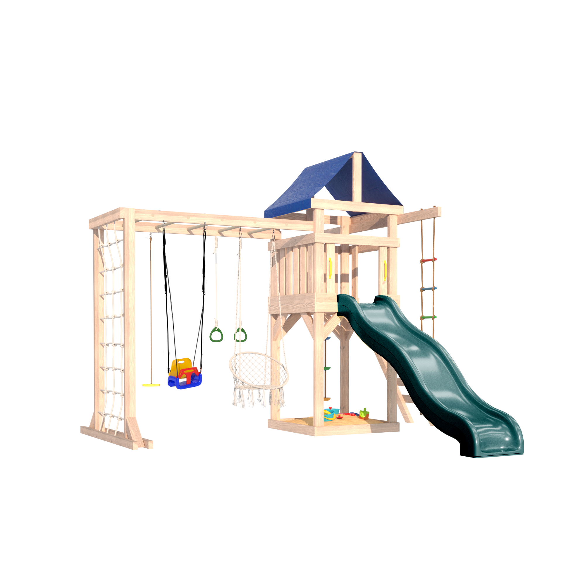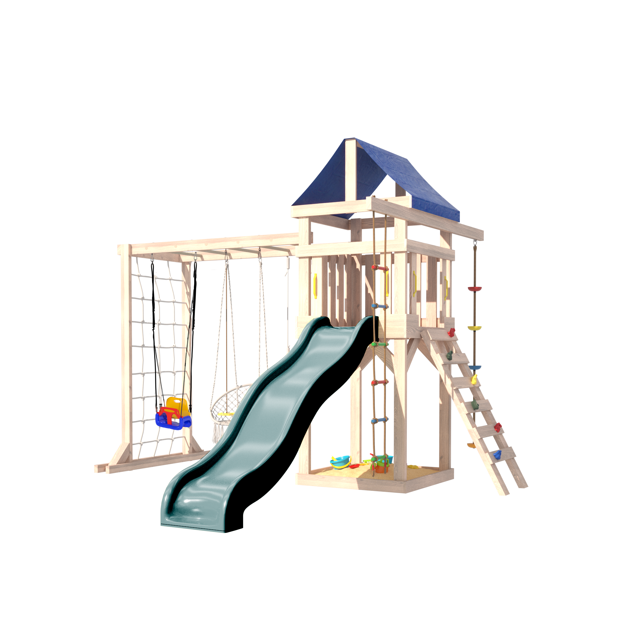 Сетчатая стенка позволяет детям лазить и играть, как настоящие альпинисты. В то время как качели в форме лодочки дарят ощущение свободы и полета, поднимая настроение и создавая атмосферу радости. Подвесное плетеное кресло – это идеальное место для спокойного отдыха, где ребенок сможет почитать книгу или просто пофантазировать.