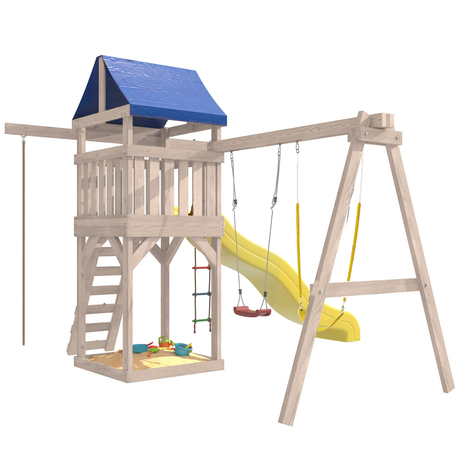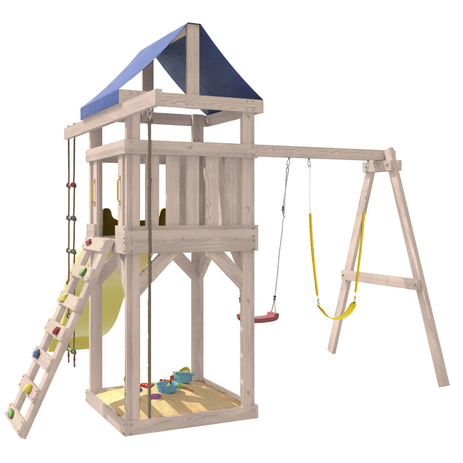 Площадка изготавливается из лесоматериалов лиственных и хвойных пород. Материал имеет естественную древесную текстуру. Все элементы проходят предварительную шлифовку, а края изделия закруглены. Небольшое количество металлических элементов значительно исключает возможность получения ребенком травм.