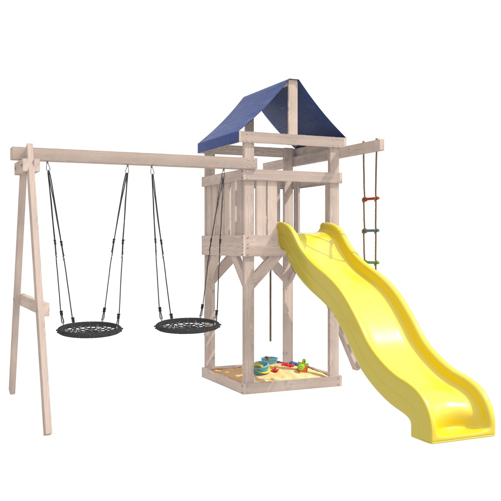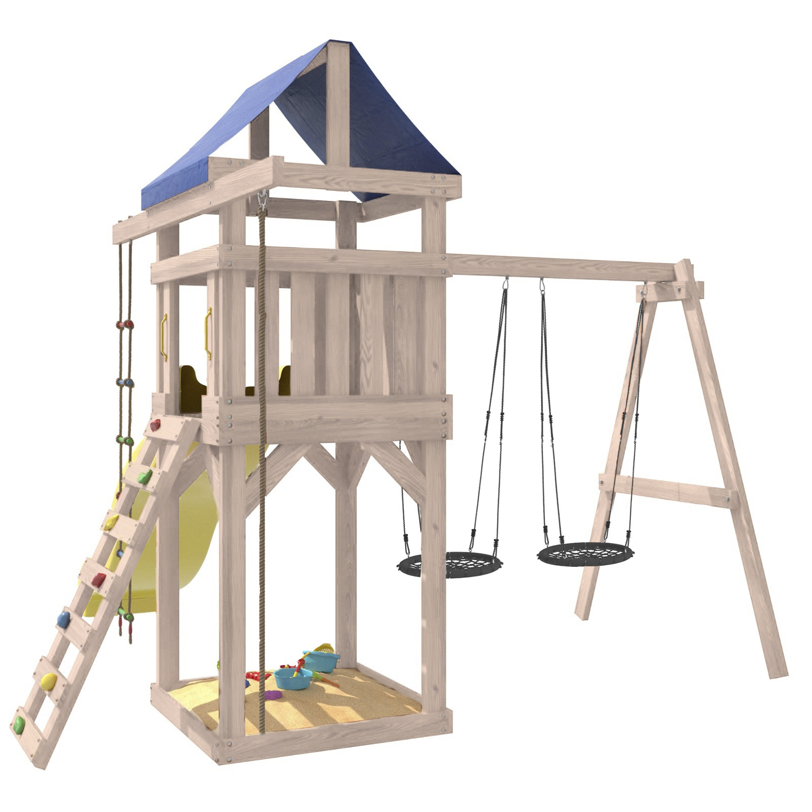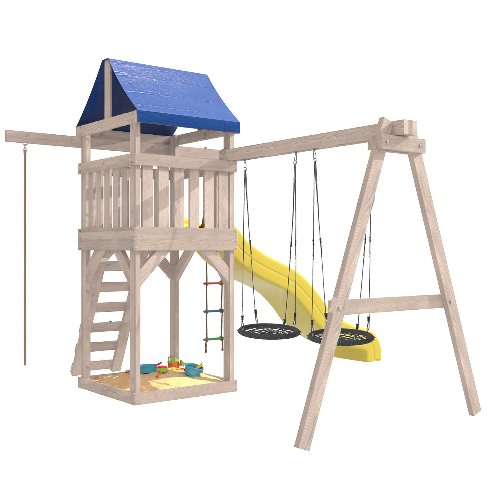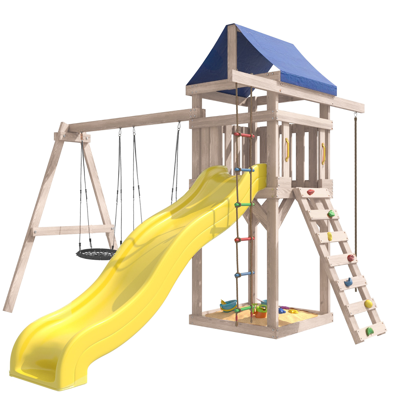 Площадка изготавливается из лесоматериалов лиственных и хвойных пород. Материал имеет естественную древесную текстуру. Все элементы проходят предварительную шлифовку, а края изделия закруглены. Небольшое количество металлических элементов значительно исключает возможность получения ребенком травм.