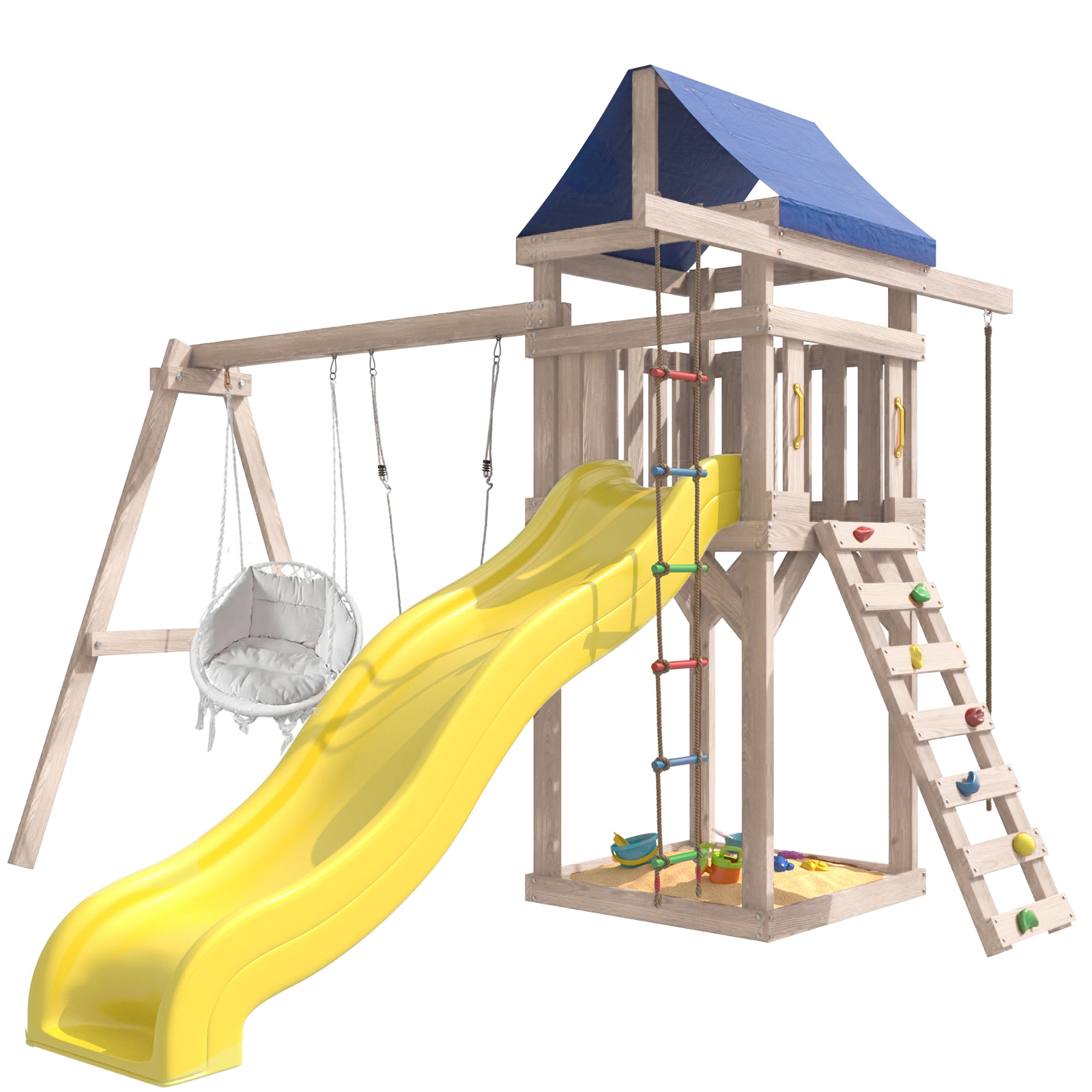Площадка изготавливается из лесоматериалов лиственных и хвойных пород. Материал имеет естественную древесную текстуру. Все элементы проходят предварительную шлифовку, а края изделия закруглены. Небольшое количество металлических элементов значительно исключает возможность получения ребенком травм.